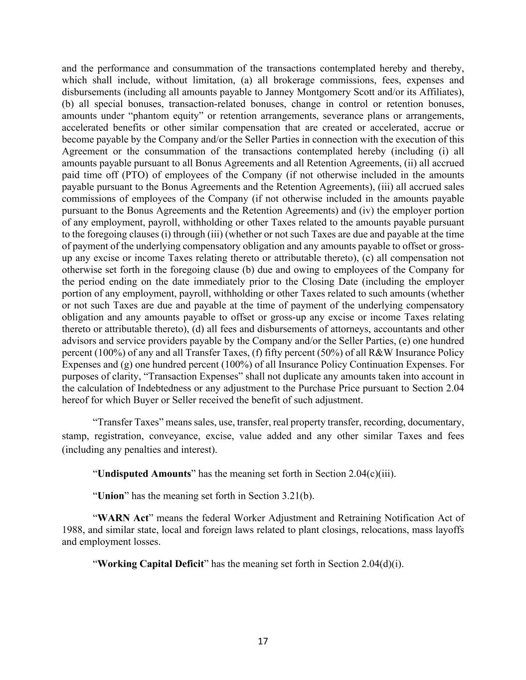 17 and the performance and consummation of the transactions contemplated hereby and thereby, which shall include, without limitation, (a) all brokerage commissions, fees, expenses and disbursements (including all amounts payable to Janney Montgomery Scott and/or its Affiliates), (b) all special bonuses, transaction-related bonuses, change in control or retention bonuses, amounts under “phantom equity” or retention arrangements, severance plans or arrangements, accelerated benefits or other similar compensation that are created or accelerated, accrue or become payable by the Company and/or the Seller Parties in connection with the execution of this Agreement or the consummation of the transactions contemplated hereby (including (i) all amounts payable pursuant to all Bonus Agreements and all Retention Agreements, (ii) all accrued paid time off (PTO) of employees of the Company (if not otherwise included in the amounts payable pursuant to the Bonus Agreements and the Retention Agreements), (iii) all accrued sales commissions of employees of the Company (if not otherwise included in the amounts payable pursuant to the Bonus Agreements and the Retention Agreements) and (iv) the employer portion of any employment, payroll, withholding or other Taxes related to the amounts payable pursuant to the foregoing clauses (i) through (iii) (whether or not such Taxes are due and payable at the time of payment of the underlying compensatory obligation and any amounts payable to offset or gross- up any excise or income Taxes relating thereto or attributable thereto), (c) all compensation not otherwise set forth in the foregoing clause (b) due and owing to employees of the Company for the period ending on the date immediately prior to the Closing Date (including the employer portion of any employment, payroll, withholding or other Taxes related to such amounts (whether or not such Taxes are due and payable at the time of payment of the underlying compensatory obligation and any amounts payable to offset or gross-up any excise or income Taxes relating thereto or attributable thereto), (d) all fees and disbursements of attorneys, accountants and other advisors and service providers payable by the Company and/or the Seller Parties, (e) one hundred percent (100%) of any and all Transfer Taxes, (f) fifty percent (50%) of all R&W Insurance Policy Expenses and (g) one hundred percent (100%) of all Insurance Policy Continuation Expenses. For purposes of clarity, “Transaction Expenses” shall not duplicate any amounts taken into account in the calculation of Indebtedness or any adjustment to the Purchase Price pursuant to Section 2.04 hereof for which Buyer or Seller received the benefit of such adjustment. “Transfer Taxes” means sales, use, transfer, real property transfer, recording, documentary, stamp, registration, conveyance, excise, value added and any other similar Taxes and fees (including any penalties and interest). “Undisputed Amounts” has the meaning set forth in Section 2.04(c)(iii). “Union” has the meaning set forth in Section 3.21(b). “WARN Act” means the federal Worker Adjustment and Retraining Notification Act of 1988, and similar state, local and foreign laws related to plant closings, relocations, mass layoffs and employment losses. “Working Capital Deficit” has the meaning set forth in Section 2.04(d)(i).