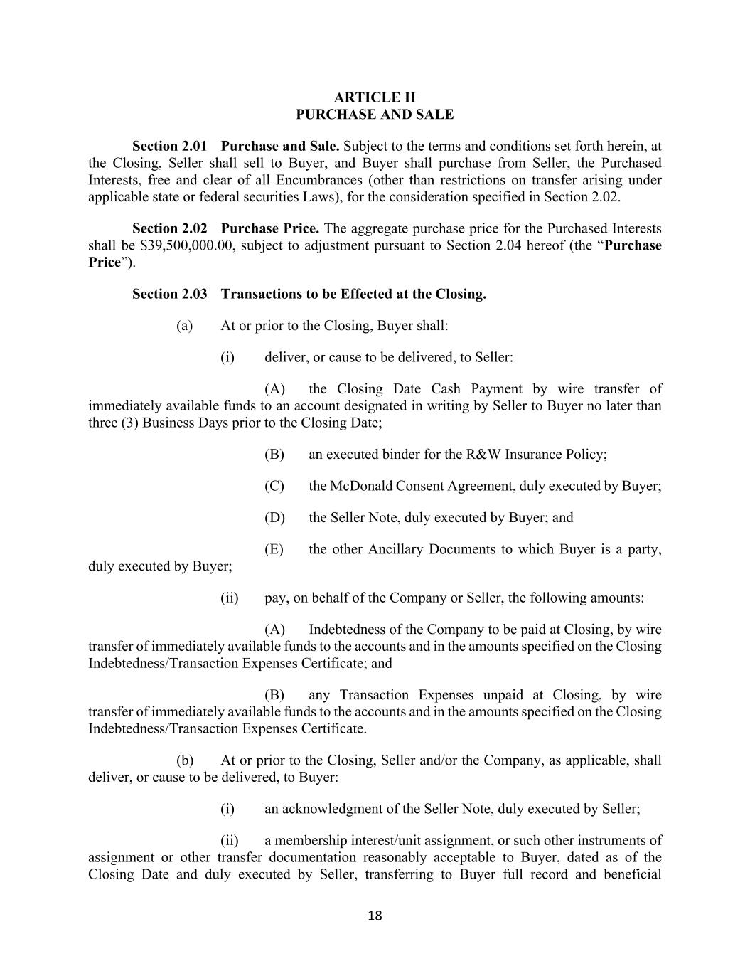 18 ARTICLE II PURCHASE AND SALE Section 2.01 Purchase and Sale. Subject to the terms and conditions set forth herein, at the Closing, Seller shall sell to Buyer, and Buyer shall purchase from Seller, the Purchased Interests, free and clear of all Encumbrances (other than restrictions on transfer arising under applicable state or federal securities Laws), for the consideration specified in Section 2.02. Section 2.02 Purchase Price. The aggregate purchase price for the Purchased Interests shall be $39,500,000.00, subject to adjustment pursuant to Section 2.04 hereof (the “Purchase Price”). Section 2.03 Transactions to be Effected at the Closing. (a) At or prior to the Closing, Buyer shall: (i) deliver, or cause to be delivered, to Seller: (A) the Closing Date Cash Payment by wire transfer of immediately available funds to an account designated in writing by Seller to Buyer no later than three (3) Business Days prior to the Closing Date; (B) an executed binder for the R&W Insurance Policy; (C) the McDonald Consent Agreement, duly executed by Buyer; (D) the Seller Note, duly executed by Buyer; and (E) the other Ancillary Documents to which Buyer is a party, duly executed by Buyer; (ii) pay, on behalf of the Company or Seller, the following amounts: (A) Indebtedness of the Company to be paid at Closing, by wire transfer of immediately available funds to the accounts and in the amounts specified on the Closing Indebtedness/Transaction Expenses Certificate; and (B) any Transaction Expenses unpaid at Closing, by wire transfer of immediately available funds to the accounts and in the amounts specified on the Closing Indebtedness/Transaction Expenses Certificate. (b) At or prior to the Closing, Seller and/or the Company, as applicable, shall deliver, or cause to be delivered, to Buyer: (i) an acknowledgment of the Seller Note, duly executed by Seller; (ii) a membership interest/unit assignment, or such other instruments of assignment or other transfer documentation reasonably acceptable to Buyer, dated as of the Closing Date and duly executed by Seller, transferring to Buyer full record and beneficial
