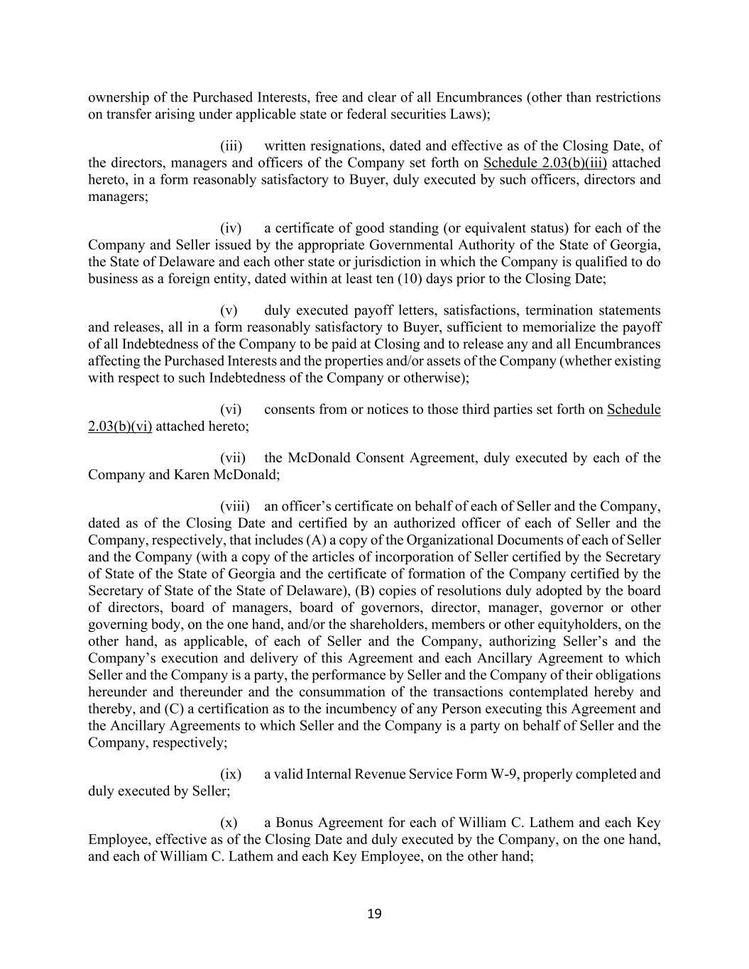 19 ownership of the Purchased Interests, free and clear of all Encumbrances (other than restrictions on transfer arising under applicable state or federal securities Laws); (iii) written resignations, dated and effective as of the Closing Date, of the directors, managers and officers of the Company set forth on Schedule 2.03(b)(iii) attached hereto, in a form reasonably satisfactory to Buyer, duly executed by such officers, directors and managers; (iv) a certificate of good standing (or equivalent status) for each of the Company and Seller issued by the appropriate Governmental Authority of the State of Georgia, the State of Delaware and each other state or jurisdiction in which the Company is qualified to do business as a foreign entity, dated within at least ten (10) days prior to the Closing Date; (v) duly executed payoff letters, satisfactions, termination statements and releases, all in a form reasonably satisfactory to Buyer, sufficient to memorialize the payoff of all Indebtedness of the Company to be paid at Closing and to release any and all Encumbrances affecting the Purchased Interests and the properties and/or assets of the Company (whether existing with respect to such Indebtedness of the Company or otherwise); (vi) consents from or notices to those third parties set forth on Schedule 2.03(b)(vi) attached hereto; (vii) the McDonald Consent Agreement, duly executed by each of the Company and Karen McDonald; (viii) an officer’s certificate on behalf of each of Seller and the Company, dated as of the Closing Date and certified by an authorized officer of each of Seller and the Company, respectively, that includes (A) a copy of the Organizational Documents of each of Seller and the Company (with a copy of the articles of incorporation of Seller certified by the Secretary of State of the State of Georgia and the certificate of formation of the Company certified by the Secretary of State of the State of Delaware), (B) copies of resolutions duly adopted by the board of directors, board of managers, board of governors, director, manager, governor or other governing body, on the one hand, and/or the shareholders, members or other equityholders, on the other hand, as applicable, of each of Seller and the Company, authorizing Seller’s and the Company’s execution and delivery of this Agreement and each Ancillary Agreement to which Seller and the Company is a party, the performance by Seller and the Company of their obligations hereunder and thereunder and the consummation of the transactions contemplated hereby and thereby, and (C) a certification as to the incumbency of any Person executing this Agreement and the Ancillary Agreements to which Seller and the Company is a party on behalf of Seller and the Company, respectively; (ix) a valid Internal Revenue Service Form W-9, properly completed and duly executed by Seller; (x) a Bonus Agreement for each of William C. Lathem and each Key Employee, effective as of the Closing Date and duly executed by the Company, on the one hand, and each of William C. Lathem and each Key Employee, on the other hand;