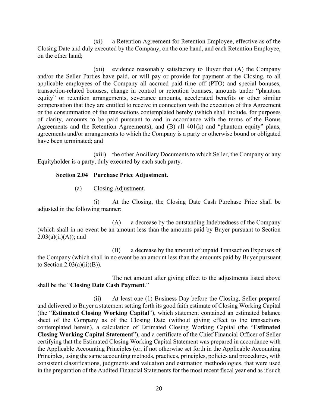 20 (xi) a Retention Agreement for Retention Employee, effective as of the Closing Date and duly executed by the Company, on the one hand, and each Retention Employee, on the other hand; (xii) evidence reasonably satisfactory to Buyer that (A) the Company and/or the Seller Parties have paid, or will pay or provide for payment at the Closing, to all applicable employees of the Company all accrued paid time off (PTO) and special bonuses, transaction-related bonuses, change in control or retention bonuses, amounts under “phantom equity” or retention arrangements, severance amounts, accelerated benefits or other similar compensation that they are entitled to receive in connection with the execution of this Agreement or the consummation of the transactions contemplated hereby (which shall include, for purposes of clarity, amounts to be paid pursuant to and in accordance with the terms of the Bonus Agreements and the Retention Agreements), and (B) all 401(k) and “phantom equity” plans, agreements and/or arrangements to which the Company is a party or otherwise bound or obligated have been terminated; and (xiii) the other Ancillary Documents to which Seller, the Company or any Equityholder is a party, duly executed by each such party. Section 2.04 Purchase Price Adjustment. (a) Closing Adjustment. (i) At the Closing, the Closing Date Cash Purchase Price shall be adjusted in the following manner: (A) a decrease by the outstanding Indebtedness of the Company (which shall in no event be an amount less than the amounts paid by Buyer pursuant to Section 2.03(a)(ii)(A)); and (B) a decrease by the amount of unpaid Transaction Expenses of the Company (which shall in no event be an amount less than the amounts paid by Buyer pursuant to Section 2.03(a)(ii)(B)). The net amount after giving effect to the adjustments listed above shall be the “Closing Date Cash Payment.” (ii) At least one (1) Business Day before the Closing, Seller prepared and delivered to Buyer a statement setting forth its good faith estimate of Closing Working Capital (the “Estimated Closing Working Capital”), which statement contained an estimated balance sheet of the Company as of the Closing Date (without giving effect to the transactions contemplated herein), a calculation of Estimated Closing Working Capital (the “Estimated Closing Working Capital Statement”), and a certificate of the Chief Financial Officer of Seller certifying that the Estimated Closing Working Capital Statement was prepared in accordance with the Applicable Accounting Principles (or, if not otherwise set forth in the Applicable Accounting Principles, using the same accounting methods, practices, principles, policies and procedures, with consistent classifications, judgments and valuation and estimation methodologies, that were used in the preparation of the Audited Financial Statements for the most recent fiscal year end as if such