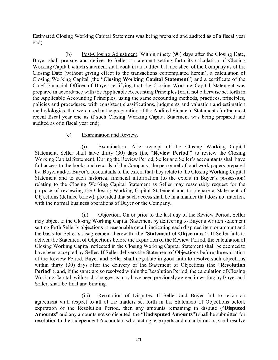 21 Estimated Closing Working Capital Statement was being prepared and audited as of a fiscal year end). (b) Post-Closing Adjustment. Within ninety (90) days after the Closing Date, Buyer shall prepare and deliver to Seller a statement setting forth its calculation of Closing Working Capital, which statement shall contain an audited balance sheet of the Company as of the Closing Date (without giving effect to the transactions contemplated herein), a calculation of Closing Working Capital (the “Closing Working Capital Statement”) and a certificate of the Chief Financial Officer of Buyer certifying that the Closing Working Capital Statement was prepared in accordance with the Applicable Accounting Principles (or, if not otherwise set forth in the Applicable Accounting Principles, using the same accounting methods, practices, principles, policies and procedures, with consistent classifications, judgments and valuation and estimation methodologies, that were used in the preparation of the Audited Financial Statements for the most recent fiscal year end as if such Closing Working Capital Statement was being prepared and audited as of a fiscal year end). (c) Examination and Review. (i) Examination. After receipt of the Closing Working Capital Statement, Seller shall have thirty (30) days (the “Review Period”) to review the Closing Working Capital Statement. During the Review Period, Seller and Seller’s accountants shall have full access to the books and records of the Company, the personnel of, and work papers prepared by, Buyer and/or Buyer’s accountants to the extent that they relate to the Closing Working Capital Statement and to such historical financial information (to the extent in Buyer’s possession) relating to the Closing Working Capital Statement as Seller may reasonably request for the purpose of reviewing the Closing Working Capital Statement and to prepare a Statement of Objections (defined below), provided that such access shall be in a manner that does not interfere with the normal business operations of Buyer or the Company. (ii) Objection. On or prior to the last day of the Review Period, Seller may object to the Closing Working Capital Statement by delivering to Buyer a written statement setting forth Seller’s objections in reasonable detail, indicating each disputed item or amount and the basis for Seller’s disagreement therewith (the “Statement of Objections”). If Seller fails to deliver the Statement of Objections before the expiration of the Review Period, the calculation of Closing Working Capital reflected in the Closing Working Capital Statement shall be deemed to have been accepted by Seller. If Seller delivers the Statement of Objections before the expiration of the Review Period, Buyer and Seller shall negotiate in good faith to resolve such objections within thirty (30) days after the delivery of the Statement of Objections (the “Resolution Period”), and, if the same are so resolved within the Resolution Period, the calculation of Closing Working Capital, with such changes as may have been previously agreed in writing by Buyer and Seller, shall be final and binding. (iii) Resolution of Disputes. If Seller and Buyer fail to reach an agreement with respect to all of the matters set forth in the Statement of Objections before expiration of the Resolution Period, then any amounts remaining in dispute (“Disputed Amounts” and any amounts not so disputed, the “Undisputed Amounts”) shall be submitted for resolution to the Independent Accountant who, acting as experts and not arbitrators, shall resolve
