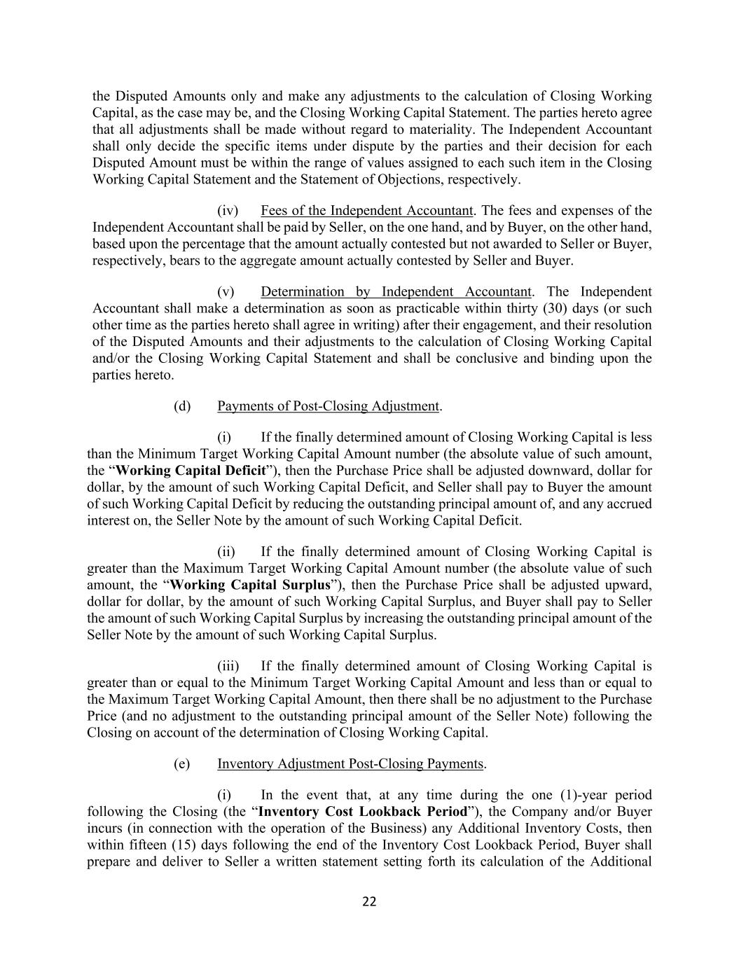 22 the Disputed Amounts only and make any adjustments to the calculation of Closing Working Capital, as the case may be, and the Closing Working Capital Statement. The parties hereto agree that all adjustments shall be made without regard to materiality. The Independent Accountant shall only decide the specific items under dispute by the parties and their decision for each Disputed Amount must be within the range of values assigned to each such item in the Closing Working Capital Statement and the Statement of Objections, respectively. (iv) Fees of the Independent Accountant. The fees and expenses of the Independent Accountant shall be paid by Seller, on the one hand, and by Buyer, on the other hand, based upon the percentage that the amount actually contested but not awarded to Seller or Buyer, respectively, bears to the aggregate amount actually contested by Seller and Buyer. (v) Determination by Independent Accountant. The Independent Accountant shall make a determination as soon as practicable within thirty (30) days (or such other time as the parties hereto shall agree in writing) after their engagement, and their resolution of the Disputed Amounts and their adjustments to the calculation of Closing Working Capital and/or the Closing Working Capital Statement and shall be conclusive and binding upon the parties hereto. (d) Payments of Post-Closing Adjustment. (i) If the finally determined amount of Closing Working Capital is less than the Minimum Target Working Capital Amount number (the absolute value of such amount, the “Working Capital Deficit”), then the Purchase Price shall be adjusted downward, dollar for dollar, by the amount of such Working Capital Deficit, and Seller shall pay to Buyer the amount of such Working Capital Deficit by reducing the outstanding principal amount of, and any accrued interest on, the Seller Note by the amount of such Working Capital Deficit. (ii) If the finally determined amount of Closing Working Capital is greater than the Maximum Target Working Capital Amount number (the absolute value of such amount, the “Working Capital Surplus”), then the Purchase Price shall be adjusted upward, dollar for dollar, by the amount of such Working Capital Surplus, and Buyer shall pay to Seller the amount of such Working Capital Surplus by increasing the outstanding principal amount of the Seller Note by the amount of such Working Capital Surplus. (iii) If the finally determined amount of Closing Working Capital is greater than or equal to the Minimum Target Working Capital Amount and less than or equal to the Maximum Target Working Capital Amount, then there shall be no adjustment to the Purchase Price (and no adjustment to the outstanding principal amount of the Seller Note) following the Closing on account of the determination of Closing Working Capital. (e) Inventory Adjustment Post-Closing Payments. (i) In the event that, at any time during the one (1)-year period following the Closing (the “Inventory Cost Lookback Period”), the Company and/or Buyer incurs (in connection with the operation of the Business) any Additional Inventory Costs, then within fifteen (15) days following the end of the Inventory Cost Lookback Period, Buyer shall prepare and deliver to Seller a written statement setting forth its calculation of the Additional