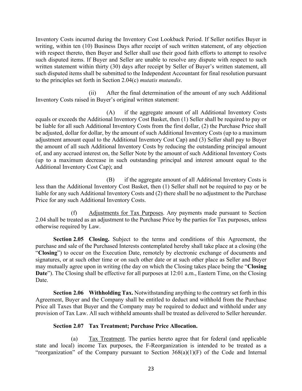 23 Inventory Costs incurred during the Inventory Cost Lookback Period. If Seller notifies Buyer in writing, within ten (10) Business Days after receipt of such written statement, of any objection with respect thereto, then Buyer and Seller shall use their good faith efforts to attempt to resolve such disputed items. If Buyer and Seller are unable to resolve any dispute with respect to such written statement within thirty (30) days after receipt by Seller of Buyer’s written statement, all such disputed items shall be submitted to the Independent Accountant for final resolution pursuant to the principles set forth in Section 2.04(c) mutatis mutandis. (ii) After the final determination of the amount of any such Additional Inventory Costs raised in Buyer’s original written statement: (A) if the aggregate amount of all Additional Inventory Costs equals or exceeds the Additional Inventory Cost Basket, then (1) Seller shall be required to pay or be liable for all such Additional Inventory Costs from the first dollar, (2) the Purchase Price shall be adjusted, dollar for dollar, by the amount of such Additional Inventory Costs (up to a maximum adjustment amount equal to the Additional Inventory Cost Cap) and (3) Seller shall pay to Buyer the amount of all such Additional Inventory Costs by reducing the outstanding principal amount of, and any accrued interest on, the Seller Note by the amount of such Additional Inventory Costs (up to a maximum decrease in such outstanding principal and interest amount equal to the Additional Inventory Cost Cap); and (B) if the aggregate amount of all Additional Inventory Costs is less than the Additional Inventory Cost Basket, then (1) Seller shall not be required to pay or be liable for any such Additional Inventory Costs and (2) there shall be no adjustment to the Purchase Price for any such Additional Inventory Costs. (f) Adjustments for Tax Purposes. Any payments made pursuant to Section 2.04 shall be treated as an adjustment to the Purchase Price by the parties for Tax purposes, unless otherwise required by Law. Section 2.05 Closing. Subject to the terms and conditions of this Agreement, the purchase and sale of the Purchased Interests contemplated hereby shall take place at a closing (the “Closing”) to occur on the Execution Date, remotely by electronic exchange of documents and signatures, or at such other time or on such other date or at such other place as Seller and Buyer may mutually agree upon in writing (the day on which the Closing takes place being the “Closing Date”). The Closing shall be effective for all purposes at 12:01 a.m., Eastern Time, on the Closing Date. Section 2.06 Withholding Tax. Notwithstanding anything to the contrary set forth in this Agreement, Buyer and the Company shall be entitled to deduct and withhold from the Purchase Price all Taxes that Buyer and the Company may be required to deduct and withhold under any provision of Tax Law. All such withheld amounts shall be treated as delivered to Seller hereunder. Section 2.07 Tax Treatment; Purchase Price Allocation. (a) Tax Treatment. The parties hereto agree that for federal (and applicable state and local) income Tax purposes, the F-Reorganization is intended to be treated as a “reorganization” of the Company pursuant to Section 368(a)(1)(F) of the Code and Internal