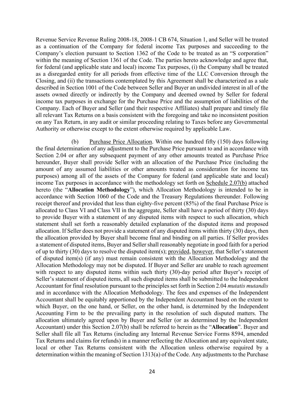 24 Revenue Service Revenue Ruling 2008-18, 2008-1 CB 674, Situation 1, and Seller will be treated as a continuation of the Company for federal income Tax purposes and succeeding to the Company’s election pursuant to Section 1362 of the Code to be treated as an “S corporation” within the meaning of Section 1361 of the Code. The parties hereto acknowledge and agree that, for federal (and applicable state and local) income Tax purposes, (i) the Company shall be treated as a disregarded entity for all periods from effective time of the LLC Conversion through the Closing, and (ii) the transactions contemplated by this Agreement shall be characterized as a sale described in Section 1001 of the Code between Seller and Buyer an undivided interest in all of the assets owned directly or indirectly by the Company and deemed owned by Seller for federal income tax purposes in exchange for the Purchase Price and the assumption of liabilities of the Company. Each of Buyer and Seller (and their respective Affiliates) shall prepare and timely file all relevant Tax Returns on a basis consistent with the foregoing and take no inconsistent position on any Tax Return, in any audit or similar proceeding relating to Taxes before any Governmental Authority or otherwise except to the extent otherwise required by applicable Law. (b) Purchase Price Allocation. Within one hundred fifty (150) days following the final determination of any adjustment to the Purchase Price pursuant to and in accordance with Section 2.04 or after any subsequent payment of any other amounts treated as Purchase Price hereunder, Buyer shall provide Seller with an allocation of the Purchase Price (including the amount of any assumed liabilities or other amounts treated as consideration for income tax purposes) among all of the assets of the Company for federal (and applicable state and local) income Tax purposes in accordance with the methodology set forth on Schedule 2.07(b) attached hereto (the “Allocation Methodology”), which Allocation Methodology is intended to be in accordance with Section 1060 of the Code and the Treasury Regulations thereunder. Following receipt thereof and provided that less than eighty-five percent (85%) of the final Purchase Price is allocated to Class VI and Class VII in the aggregate, Seller shall have a period of thirty (30) days to provide Buyer with a statement of any disputed items with respect to such allocation, which statement shall set forth a reasonably detailed explanation of the disputed items and proposed allocation. If Seller does not provide a statement of any disputed items within thirty (30) days, then the allocation provided by Buyer shall become final and binding on all parties. If Seller provides a statement of disputed items, Buyer and Seller shall reasonably negotiate in good faith for a period of up to thirty (30) days to resolve the disputed item(s); provided, however, that Seller’s statement of disputed item(s) (if any) must remain consistent with the Allocation Methodology and the Allocation Methodology may not be disputed. If Buyer and Seller are unable to reach agreement with respect to any disputed items within such thirty (30)-day period after Buyer’s receipt of Seller’s statement of disputed items, all such disputed items shall be submitted to the Independent Accountant for final resolution pursuant to the principles set forth in Section 2.04 mutatis mutandis and in accordance with the Allocation Methodology. The fees and expenses of the Independent Accountant shall be equitably apportioned by the Independent Accountant based on the extent to which Buyer, on the one hand, or Seller, on the other hand, is determined by the Independent Accounting Firm to be the prevailing party in the resolution of such disputed matters. The allocation ultimately agreed upon by Buyer and Seller (or as determined by the Independent Accountant) under this Section 2.07(b) shall be referred to herein as the “Allocation”. Buyer and Seller shall file all Tax Returns (including any Internal Revenue Service Forms 8594, amended Tax Returns and claims for refunds) in a manner reflecting the Allocation and any equivalent state, local or other Tax Returns consistent with the Allocation unless otherwise required by a determination within the meaning of Section 1313(a) of the Code. Any adjustments to the Purchase
