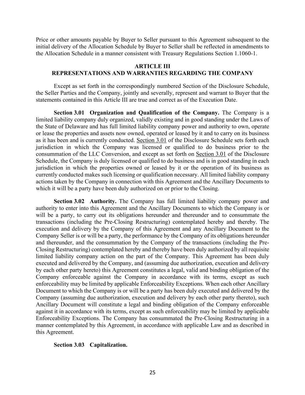 25 Price or other amounts payable by Buyer to Seller pursuant to this Agreement subsequent to the initial delivery of the Allocation Schedule by Buyer to Seller shall be reflected in amendments to the Allocation Schedule in a manner consistent with Treasury Regulations Section 1.1060-1. ARTICLE III REPRESENTATIONS AND WARRANTIES REGARDING THE COMPANY Except as set forth in the correspondingly numbered Section of the Disclosure Schedule, the Seller Parties and the Company, jointly and severally, represent and warrant to Buyer that the statements contained in this Article III are true and correct as of the Execution Date. Section 3.01 Organization and Qualification of the Company. The Company is a limited liability company duly organized, validly existing and in good standing under the Laws of the State of Delaware and has full limited liability company power and authority to own, operate or lease the properties and assets now owned, operated or leased by it and to carry on its business as it has been and is currently conducted. Section 3.01 of the Disclosure Schedule sets forth each jurisdiction in which the Company was licensed or qualified to do business prior to the consummation of the LLC Conversion, and except as set forth on Section 3.01 of the Disclosure Schedule, the Company is duly licensed or qualified to do business and is in good standing in each jurisdiction in which the properties owned or leased by it or the operation of its business as currently conducted makes such licensing or qualification necessary. All limited liability company actions taken by the Company in connection with this Agreement and the Ancillary Documents to which it will be a party have been duly authorized on or prior to the Closing. Section 3.02 Authority. The Company has full limited liability company power and authority to enter into this Agreement and the Ancillary Documents to which the Company is or will be a party, to carry out its obligations hereunder and thereunder and to consummate the transactions (including the Pre-Closing Restructuring) contemplated hereby and thereby. The execution and delivery by the Company of this Agreement and any Ancillary Document to the Company Seller is or will be a party, the performance by the Company of its obligations hereunder and thereunder, and the consummation by the Company of the transactions (including the Pre- Closing Restructuring) contemplated hereby and thereby have been duly authorized by all requisite limited liability company action on the part of the Company. This Agreement has been duly executed and delivered by the Company, and (assuming due authorization, execution and delivery by each other party hereto) this Agreement constitutes a legal, valid and binding obligation of the Company enforceable against the Company in accordance with its terms, except as such enforceability may be limited by applicable Enforceability Exceptions. When each other Ancillary Document to which the Company is or will be a party has been duly executed and delivered by the Company (assuming due authorization, execution and delivery by each other party thereto), such Ancillary Document will constitute a legal and binding obligation of the Company enforceable against it in accordance with its terms, except as such enforceability may be limited by applicable Enforceability Exceptions. The Company has consummated the Pre-Closing Restructuring in a manner contemplated by this Agreement, in accordance with applicable Law and as described in this Agreement. Section 3.03 Capitalization.