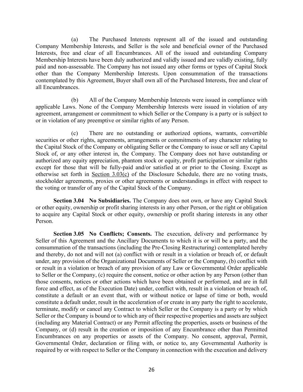 26 (a) The Purchased Interests represent all of the issued and outstanding Company Membership Interests, and Seller is the sole and beneficial owner of the Purchased Interests, free and clear of all Encumbrances. All of the issued and outstanding Company Membership Interests have been duly authorized and validly issued and are validly existing, fully paid and non-assessable. The Company has not issued any other forms or types of Capital Stock other than the Company Membership Interests. Upon consummation of the transactions contemplated by this Agreement, Buyer shall own all of the Purchased Interests, free and clear of all Encumbrances. (b) All of the Company Membership Interests were issued in compliance with applicable Laws. None of the Company Membership Interests were issued in violation of any agreement, arrangement or commitment to which Seller or the Company is a party or is subject to or in violation of any preemptive or similar rights of any Person. (c) There are no outstanding or authorized options, warrants, convertible securities or other rights, agreements, arrangements or commitments of any character relating to the Capital Stock of the Company or obligating Seller or the Company to issue or sell any Capital Stock of, or any other interest in, the Company. The Company does not have outstanding or authorized any equity appreciation, phantom stock or equity, profit participation or similar rights except for those that will be fully-paid and/or satisfied at or prior to the Closing. Except as otherwise set forth in Section 3.03(c) of the Disclosure Schedule, there are no voting trusts, stockholder agreements, proxies or other agreements or understandings in effect with respect to the voting or transfer of any of the Capital Stock of the Company. Section 3.04 No Subsidiaries. The Company does not own, or have any Capital Stock or other equity, ownership or profit sharing interests in any other Person, or the right or obligation to acquire any Capital Stock or other equity, ownership or profit sharing interests in any other Person. Section 3.05 No Conflicts; Consents. The execution, delivery and performance by Seller of this Agreement and the Ancillary Documents to which it is or will be a party, and the consummation of the transactions (including the Pre-Closing Restructuring) contemplated hereby and thereby, do not and will not (a) conflict with or result in a violation or breach of, or default under, any provision of the Organizational Documents of Seller or the Company, (b) conflict with or result in a violation or breach of any provision of any Law or Governmental Order applicable to Seller or the Company, (c) require the consent, notice or other action by any Person (other than those consents, notices or other actions which have been obtained or performed, and are in full force and effect, as of the Execution Date) under, conflict with, result in a violation or breach of, constitute a default or an event that, with or without notice or lapse of time or both, would constitute a default under, result in the acceleration of or create in any party the right to accelerate, terminate, modify or cancel any Contract to which Seller or the Company is a party or by which Seller or the Company is bound or to which any of their respective properties and assets are subject (including any Material Contract) or any Permit affecting the properties, assets or business of the Company, or (d) result in the creation or imposition of any Encumbrance other than Permitted Encumbrances on any properties or assets of the Company. No consent, approval, Permit, Governmental Order, declaration or filing with, or notice to, any Governmental Authority is required by or with respect to Seller or the Company in connection with the execution and delivery