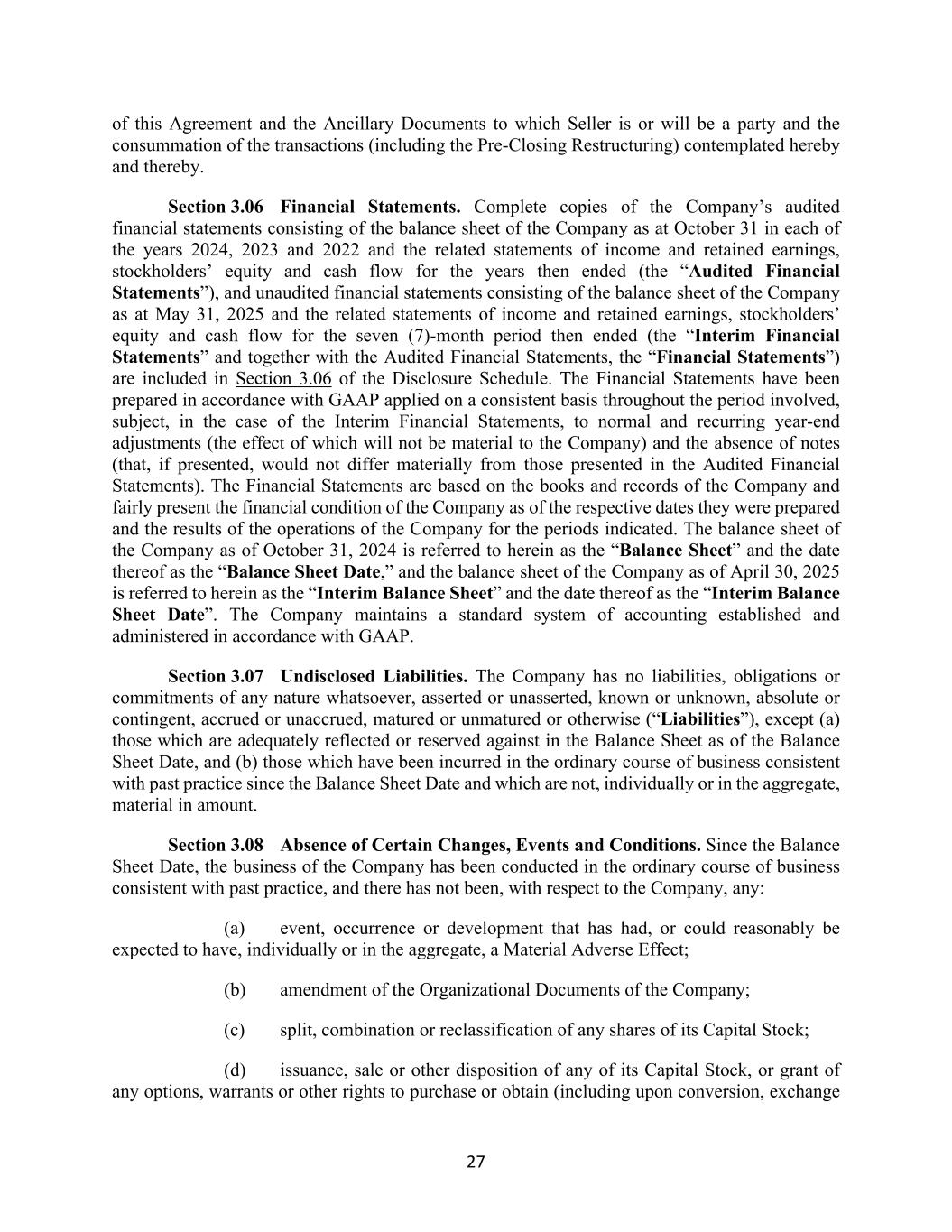 27 of this Agreement and the Ancillary Documents to which Seller is or will be a party and the consummation of the transactions (including the Pre-Closing Restructuring) contemplated hereby and thereby. Section 3.06 Financial Statements. Complete copies of the Company’s audited financial statements consisting of the balance sheet of the Company as at October 31 in each of the years 2024, 2023 and 2022 and the related statements of income and retained earnings, stockholders’ equity and cash flow for the years then ended (the “Audited Financial Statements”), and unaudited financial statements consisting of the balance sheet of the Company as at May 31, 2025 and the related statements of income and retained earnings, stockholders’ equity and cash flow for the seven (7)-month period then ended (the “Interim Financial Statements” and together with the Audited Financial Statements, the “Financial Statements”) are included in Section 3.06 of the Disclosure Schedule. The Financial Statements have been prepared in accordance with GAAP applied on a consistent basis throughout the period involved, subject, in the case of the Interim Financial Statements, to normal and recurring year-end adjustments (the effect of which will not be material to the Company) and the absence of notes (that, if presented, would not differ materially from those presented in the Audited Financial Statements). The Financial Statements are based on the books and records of the Company and fairly present the financial condition of the Company as of the respective dates they were prepared and the results of the operations of the Company for the periods indicated. The balance sheet of the Company as of October 31, 2024 is referred to herein as the “Balance Sheet” and the date thereof as the “Balance Sheet Date,” and the balance sheet of the Company as of April 30, 2025 is referred to herein as the “Interim Balance Sheet” and the date thereof as the “Interim Balance Sheet Date”. The Company maintains a standard system of accounting established and administered in accordance with GAAP. Section 3.07 Undisclosed Liabilities. The Company has no liabilities, obligations or commitments of any nature whatsoever, asserted or unasserted, known or unknown, absolute or contingent, accrued or unaccrued, matured or unmatured or otherwise (“Liabilities”), except (a) those which are adequately reflected or reserved against in the Balance Sheet as of the Balance Sheet Date, and (b) those which have been incurred in the ordinary course of business consistent with past practice since the Balance Sheet Date and which are not, individually or in the aggregate, material in amount. Section 3.08 Absence of Certain Changes, Events and Conditions. Since the Balance Sheet Date, the business of the Company has been conducted in the ordinary course of business consistent with past practice, and there has not been, with respect to the Company, any: (a) event, occurrence or development that has had, or could reasonably be expected to have, individually or in the aggregate, a Material Adverse Effect; (b) amendment of the Organizational Documents of the Company; (c) split, combination or reclassification of any shares of its Capital Stock; (d) issuance, sale or other disposition of any of its Capital Stock, or grant of any options, warrants or other rights to purchase or obtain (including upon conversion, exchange