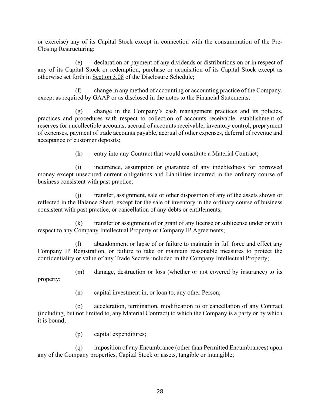 28 or exercise) any of its Capital Stock except in connection with the consummation of the Pre- Closing Restructuring; (e) declaration or payment of any dividends or distributions on or in respect of any of its Capital Stock or redemption, purchase or acquisition of its Capital Stock except as otherwise set forth in Section 3.08 of the Disclosure Schedule; (f) change in any method of accounting or accounting practice of the Company, except as required by GAAP or as disclosed in the notes to the Financial Statements; (g) change in the Company’s cash management practices and its policies, practices and procedures with respect to collection of accounts receivable, establishment of reserves for uncollectible accounts, accrual of accounts receivable, inventory control, prepayment of expenses, payment of trade accounts payable, accrual of other expenses, deferral of revenue and acceptance of customer deposits; (h) entry into any Contract that would constitute a Material Contract; (i) incurrence, assumption or guarantee of any indebtedness for borrowed money except unsecured current obligations and Liabilities incurred in the ordinary course of business consistent with past practice; (j) transfer, assignment, sale or other disposition of any of the assets shown or reflected in the Balance Sheet, except for the sale of inventory in the ordinary course of business consistent with past practice, or cancellation of any debts or entitlements; (k) transfer or assignment of or grant of any license or sublicense under or with respect to any Company Intellectual Property or Company IP Agreements; (l) abandonment or lapse of or failure to maintain in full force and effect any Company IP Registration, or failure to take or maintain reasonable measures to protect the confidentiality or value of any Trade Secrets included in the Company Intellectual Property; (m) damage, destruction or loss (whether or not covered by insurance) to its property; (n) capital investment in, or loan to, any other Person; (o) acceleration, termination, modification to or cancellation of any Contract (including, but not limited to, any Material Contract) to which the Company is a party or by which it is bound; (p) capital expenditures; (q) imposition of any Encumbrance (other than Permitted Encumbrances) upon any of the Company properties, Capital Stock or assets, tangible or intangible;