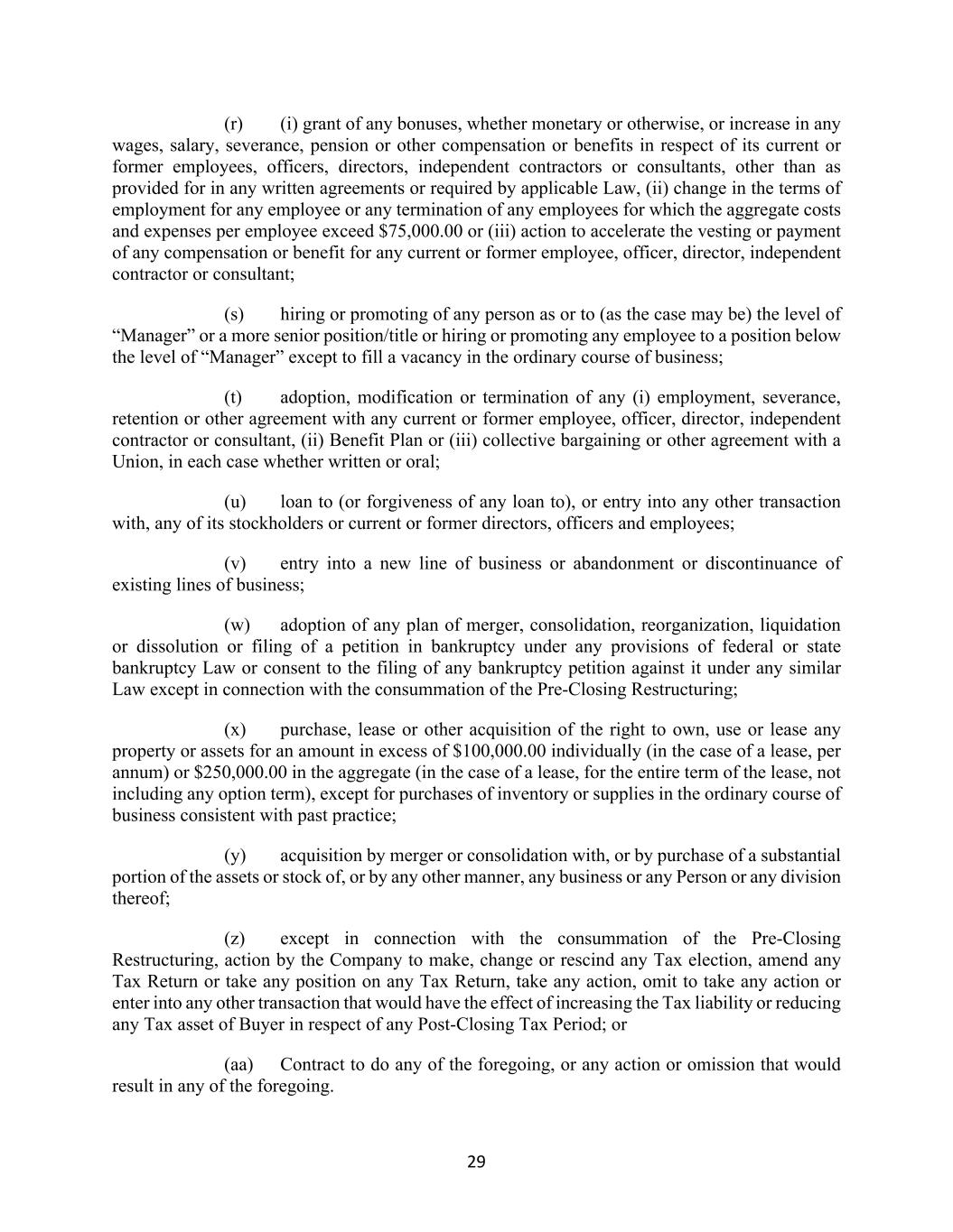 29 (r) (i) grant of any bonuses, whether monetary or otherwise, or increase in any wages, salary, severance, pension or other compensation or benefits in respect of its current or former employees, officers, directors, independent contractors or consultants, other than as provided for in any written agreements or required by applicable Law, (ii) change in the terms of employment for any employee or any termination of any employees for which the aggregate costs and expenses per employee exceed $75,000.00 or (iii) action to accelerate the vesting or payment of any compensation or benefit for any current or former employee, officer, director, independent contractor or consultant; (s) hiring or promoting of any person as or to (as the case may be) the level of “Manager” or a more senior position/title or hiring or promoting any employee to a position below the level of “Manager” except to fill a vacancy in the ordinary course of business; (t) adoption, modification or termination of any (i) employment, severance, retention or other agreement with any current or former employee, officer, director, independent contractor or consultant, (ii) Benefit Plan or (iii) collective bargaining or other agreement with a Union, in each case whether written or oral; (u) loan to (or forgiveness of any loan to), or entry into any other transaction with, any of its stockholders or current or former directors, officers and employees; (v) entry into a new line of business or abandonment or discontinuance of existing lines of business; (w) adoption of any plan of merger, consolidation, reorganization, liquidation or dissolution or filing of a petition in bankruptcy under any provisions of federal or state bankruptcy Law or consent to the filing of any bankruptcy petition against it under any similar Law except in connection with the consummation of the Pre-Closing Restructuring; (x) purchase, lease or other acquisition of the right to own, use or lease any property or assets for an amount in excess of $100,000.00 individually (in the case of a lease, per annum) or $250,000.00 in the aggregate (in the case of a lease, for the entire term of the lease, not including any option term), except for purchases of inventory or supplies in the ordinary course of business consistent with past practice; (y) acquisition by merger or consolidation with, or by purchase of a substantial portion of the assets or stock of, or by any other manner, any business or any Person or any division thereof; (z) except in connection with the consummation of the Pre-Closing Restructuring, action by the Company to make, change or rescind any Tax election, amend any Tax Return or take any position on any Tax Return, take any action, omit to take any action or enter into any other transaction that would have the effect of increasing the Tax liability or reducing any Tax asset of Buyer in respect of any Post-Closing Tax Period; or (aa) Contract to do any of the foregoing, or any action or omission that would result in any of the foregoing.