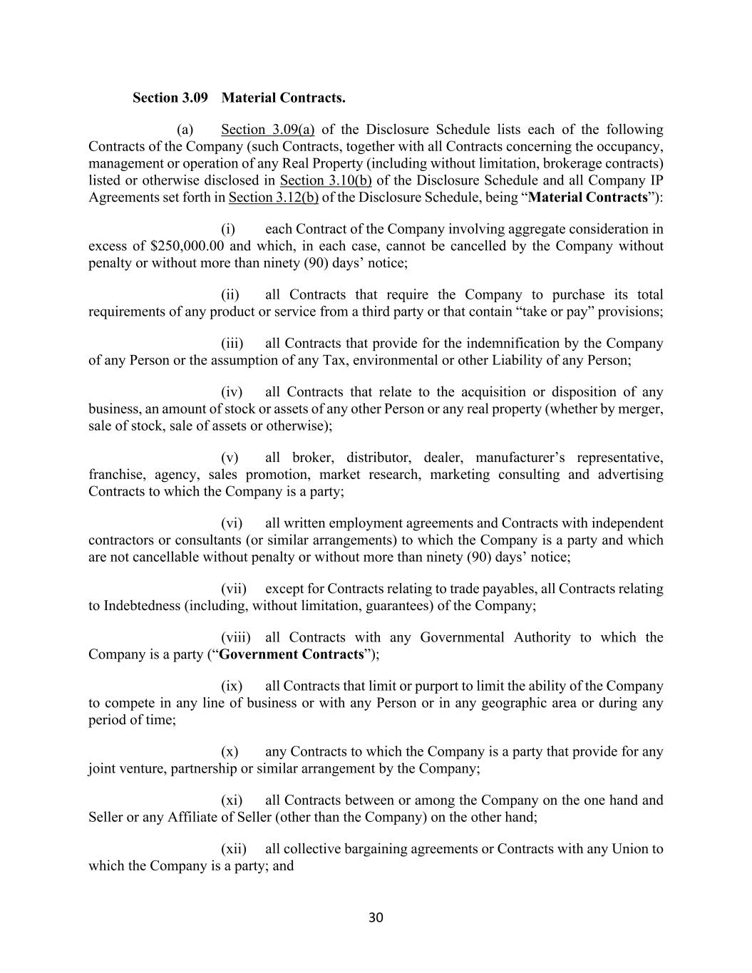 30 Section 3.09 Material Contracts. (a) Section 3.09(a) of the Disclosure Schedule lists each of the following Contracts of the Company (such Contracts, together with all Contracts concerning the occupancy, management or operation of any Real Property (including without limitation, brokerage contracts) listed or otherwise disclosed in Section 3.10(b) of the Disclosure Schedule and all Company IP Agreements set forth in Section 3.12(b) of the Disclosure Schedule, being “Material Contracts”): (i) each Contract of the Company involving aggregate consideration in excess of $250,000.00 and which, in each case, cannot be cancelled by the Company without penalty or without more than ninety (90) days’ notice; (ii) all Contracts that require the Company to purchase its total requirements of any product or service from a third party or that contain “take or pay” provisions; (iii) all Contracts that provide for the indemnification by the Company of any Person or the assumption of any Tax, environmental or other Liability of any Person; (iv) all Contracts that relate to the acquisition or disposition of any business, an amount of stock or assets of any other Person or any real property (whether by merger, sale of stock, sale of assets or otherwise); (v) all broker, distributor, dealer, manufacturer’s representative, franchise, agency, sales promotion, market research, marketing consulting and advertising Contracts to which the Company is a party; (vi) all written employment agreements and Contracts with independent contractors or consultants (or similar arrangements) to which the Company is a party and which are not cancellable without penalty or without more than ninety (90) days’ notice; (vii) except for Contracts relating to trade payables, all Contracts relating to Indebtedness (including, without limitation, guarantees) of the Company; (viii) all Contracts with any Governmental Authority to which the Company is a party (“Government Contracts”); (ix) all Contracts that limit or purport to limit the ability of the Company to compete in any line of business or with any Person or in any geographic area or during any period of time; (x) any Contracts to which the Company is a party that provide for any joint venture, partnership or similar arrangement by the Company; (xi) all Contracts between or among the Company on the one hand and Seller or any Affiliate of Seller (other than the Company) on the other hand; (xii) all collective bargaining agreements or Contracts with any Union to which the Company is a party; and