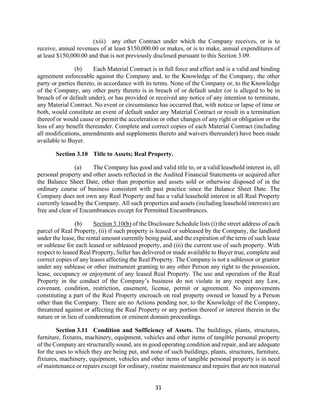 31 (xiii) any other Contract under which the Company receives, or is to receive, annual revenues of at least $150,000.00 or makes, or is to make, annual expenditures of at least $150,000.00 and that is not previously disclosed pursuant to this Section 3.09. (b) Each Material Contract is in full force and effect and is a valid and binding agreement enforceable against the Company and, to the Knowledge of the Company, the other party or parties thereto, in accordance with its terms. None of the Company or, to the Knowledge of the Company, any other party thereto is in breach of or default under (or is alleged to be in breach of or default under), or has provided or received any notice of any intention to terminate, any Material Contract. No event or circumstance has occurred that, with notice or lapse of time or both, would constitute an event of default under any Material Contract or result in a termination thereof or would cause or permit the acceleration or other changes of any right or obligation or the loss of any benefit thereunder. Complete and correct copies of each Material Contract (including all modifications, amendments and supplements thereto and waivers thereunder) have been made available to Buyer. Section 3.10 Title to Assets; Real Property. (a) The Company has good and valid title to, or a valid leasehold interest in, all personal property and other assets reflected in the Audited Financial Statements or acquired after the Balance Sheet Date, other than properties and assets sold or otherwise disposed of in the ordinary course of business consistent with past practice since the Balance Sheet Date. The Company does not own any Real Property and has a valid leasehold interest in all Real Property currently leased by the Company. All such properties and assets (including leasehold interests) are free and clear of Encumbrances except for Permitted Encumbrances. (b) Section 3.10(b) of the Disclosure Schedule lists (i) the street address of each parcel of Real Property, (ii) if such property is leased or subleased by the Company, the landlord under the lease, the rental amount currently being paid, and the expiration of the term of such lease or sublease for each leased or subleased property, and (iii) the current use of such property. With respect to leased Real Property, Seller has delivered or made available to Buyer true, complete and correct copies of any leases affecting the Real Property. The Company is not a sublessor or grantor under any sublease or other instrument granting to any other Person any right to the possession, lease, occupancy or enjoyment of any leased Real Property. The use and operation of the Real Property in the conduct of the Company’s business do not violate in any respect any Law, covenant, condition, restriction, easement, license, permit or agreement. No improvements constituting a part of the Real Property encroach on real property owned or leased by a Person other than the Company. There are no Actions pending nor, to the Knowledge of the Company, threatened against or affecting the Real Property or any portion thereof or interest therein in the nature or in lieu of condemnation or eminent domain proceedings. Section 3.11 Condition and Sufficiency of Assets. The buildings, plants, structures, furniture, fixtures, machinery, equipment, vehicles and other items of tangible personal property of the Company are structurally sound, are in good operating condition and repair, and are adequate for the uses to which they are being put, and none of such buildings, plants, structures, furniture, fixtures, machinery, equipment, vehicles and other items of tangible personal property is in need of maintenance or repairs except for ordinary, routine maintenance and repairs that are not material