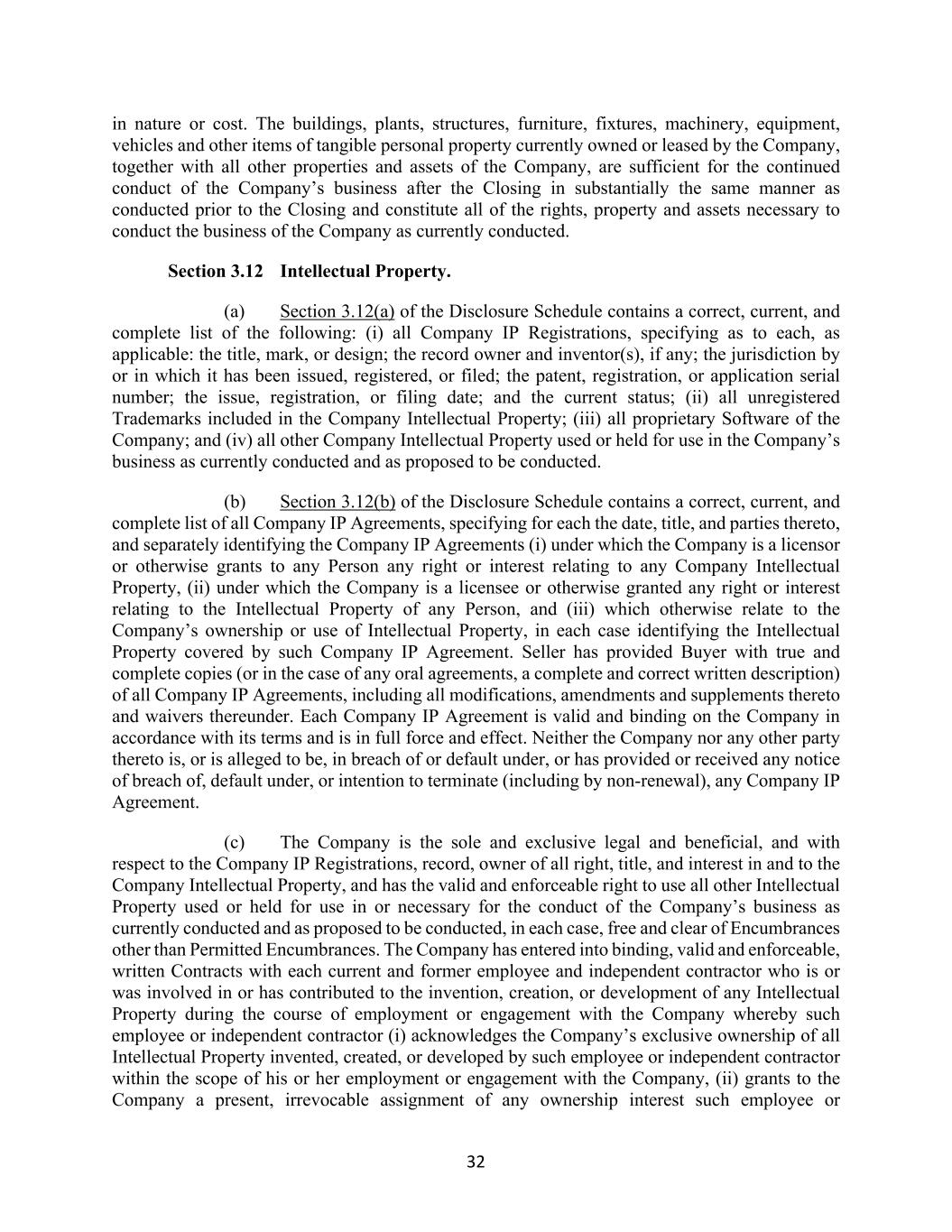 32 in nature or cost. The buildings, plants, structures, furniture, fixtures, machinery, equipment, vehicles and other items of tangible personal property currently owned or leased by the Company, together with all other properties and assets of the Company, are sufficient for the continued conduct of the Company’s business after the Closing in substantially the same manner as conducted prior to the Closing and constitute all of the rights, property and assets necessary to conduct the business of the Company as currently conducted. Section 3.12 Intellectual Property. (a) Section 3.12(a) of the Disclosure Schedule contains a correct, current, and complete list of the following: (i) all Company IP Registrations, specifying as to each, as applicable: the title, mark, or design; the record owner and inventor(s), if any; the jurisdiction by or in which it has been issued, registered, or filed; the patent, registration, or application serial number; the issue, registration, or filing date; and the current status; (ii) all unregistered Trademarks included in the Company Intellectual Property; (iii) all proprietary Software of the Company; and (iv) all other Company Intellectual Property used or held for use in the Company’s business as currently conducted and as proposed to be conducted. (b) Section 3.12(b) of the Disclosure Schedule contains a correct, current, and complete list of all Company IP Agreements, specifying for each the date, title, and parties thereto, and separately identifying the Company IP Agreements (i) under which the Company is a licensor or otherwise grants to any Person any right or interest relating to any Company Intellectual Property, (ii) under which the Company is a licensee or otherwise granted any right or interest relating to the Intellectual Property of any Person, and (iii) which otherwise relate to the Company’s ownership or use of Intellectual Property, in each case identifying the Intellectual Property covered by such Company IP Agreement. Seller has provided Buyer with true and complete copies (or in the case of any oral agreements, a complete and correct written description) of all Company IP Agreements, including all modifications, amendments and supplements thereto and waivers thereunder. Each Company IP Agreement is valid and binding on the Company in accordance with its terms and is in full force and effect. Neither the Company nor any other party thereto is, or is alleged to be, in breach of or default under, or has provided or received any notice of breach of, default under, or intention to terminate (including by non-renewal), any Company IP Agreement. (c) The Company is the sole and exclusive legal and beneficial, and with respect to the Company IP Registrations, record, owner of all right, title, and interest in and to the Company Intellectual Property, and has the valid and enforceable right to use all other Intellectual Property used or held for use in or necessary for the conduct of the Company’s business as currently conducted and as proposed to be conducted, in each case, free and clear of Encumbrances other than Permitted Encumbrances. The Company has entered into binding, valid and enforceable, written Contracts with each current and former employee and independent contractor who is or was involved in or has contributed to the invention, creation, or development of any Intellectual Property during the course of employment or engagement with the Company whereby such employee or independent contractor (i) acknowledges the Company’s exclusive ownership of all Intellectual Property invented, created, or developed by such employee or independent contractor within the scope of his or her employment or engagement with the Company, (ii) grants to the Company a present, irrevocable assignment of any ownership interest such employee or