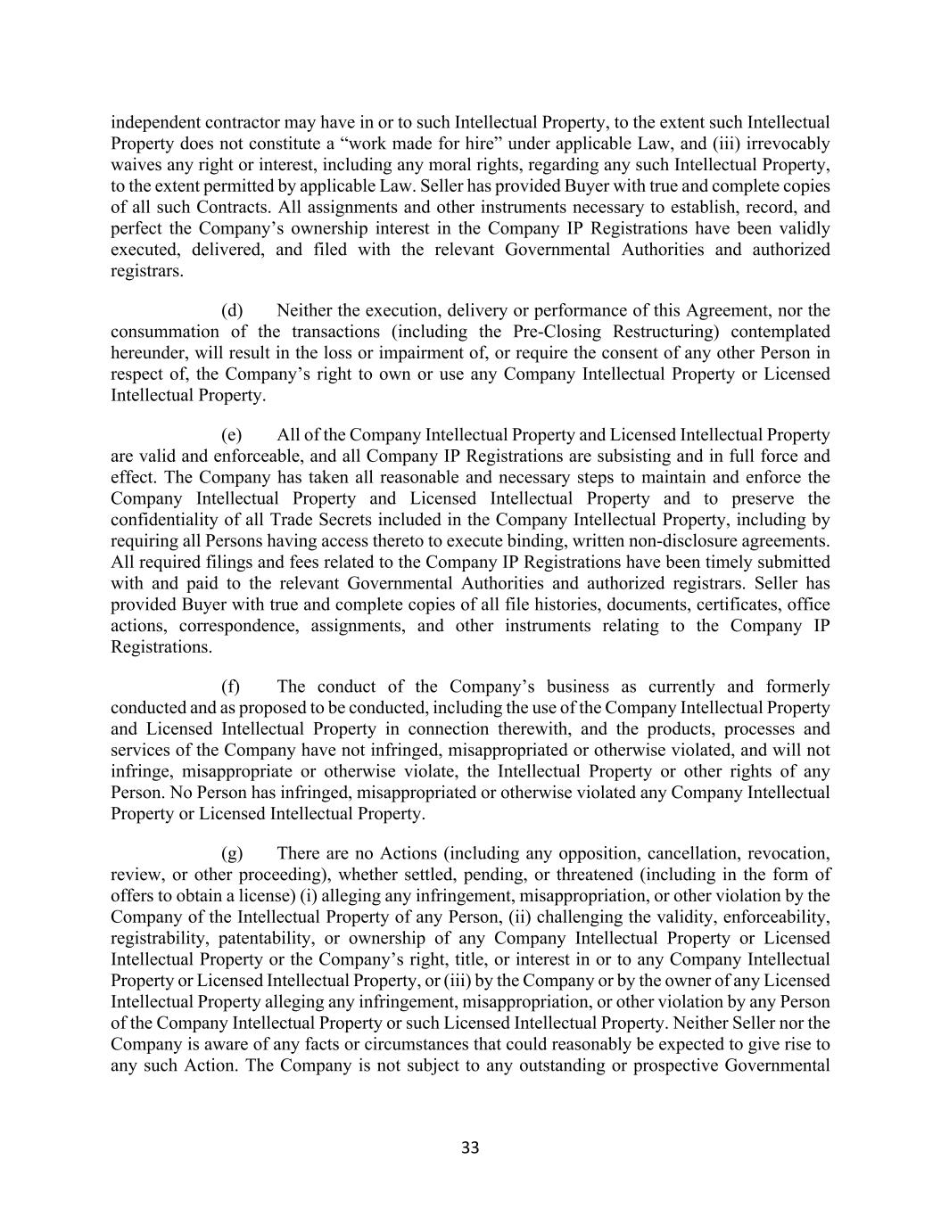 33 independent contractor may have in or to such Intellectual Property, to the extent such Intellectual Property does not constitute a “work made for hire” under applicable Law, and (iii) irrevocably waives any right or interest, including any moral rights, regarding any such Intellectual Property, to the extent permitted by applicable Law. Seller has provided Buyer with true and complete copies of all such Contracts. All assignments and other instruments necessary to establish, record, and perfect the Company’s ownership interest in the Company IP Registrations have been validly executed, delivered, and filed with the relevant Governmental Authorities and authorized registrars. (d) Neither the execution, delivery or performance of this Agreement, nor the consummation of the transactions (including the Pre-Closing Restructuring) contemplated hereunder, will result in the loss or impairment of, or require the consent of any other Person in respect of, the Company’s right to own or use any Company Intellectual Property or Licensed Intellectual Property. (e) All of the Company Intellectual Property and Licensed Intellectual Property are valid and enforceable, and all Company IP Registrations are subsisting and in full force and effect. The Company has taken all reasonable and necessary steps to maintain and enforce the Company Intellectual Property and Licensed Intellectual Property and to preserve the confidentiality of all Trade Secrets included in the Company Intellectual Property, including by requiring all Persons having access thereto to execute binding, written non-disclosure agreements. All required filings and fees related to the Company IP Registrations have been timely submitted with and paid to the relevant Governmental Authorities and authorized registrars. Seller has provided Buyer with true and complete copies of all file histories, documents, certificates, office actions, correspondence, assignments, and other instruments relating to the Company IP Registrations. (f) The conduct of the Company’s business as currently and formerly conducted and as proposed to be conducted, including the use of the Company Intellectual Property and Licensed Intellectual Property in connection therewith, and the products, processes and services of the Company have not infringed, misappropriated or otherwise violated, and will not infringe, misappropriate or otherwise violate, the Intellectual Property or other rights of any Person. No Person has infringed, misappropriated or otherwise violated any Company Intellectual Property or Licensed Intellectual Property. (g) There are no Actions (including any opposition, cancellation, revocation, review, or other proceeding), whether settled, pending, or threatened (including in the form of offers to obtain a license) (i) alleging any infringement, misappropriation, or other violation by the Company of the Intellectual Property of any Person, (ii) challenging the validity, enforceability, registrability, patentability, or ownership of any Company Intellectual Property or Licensed Intellectual Property or the Company’s right, title, or interest in or to any Company Intellectual Property or Licensed Intellectual Property, or (iii) by the Company or by the owner of any Licensed Intellectual Property alleging any infringement, misappropriation, or other violation by any Person of the Company Intellectual Property or such Licensed Intellectual Property. Neither Seller nor the Company is aware of any facts or circumstances that could reasonably be expected to give rise to any such Action. The Company is not subject to any outstanding or prospective Governmental