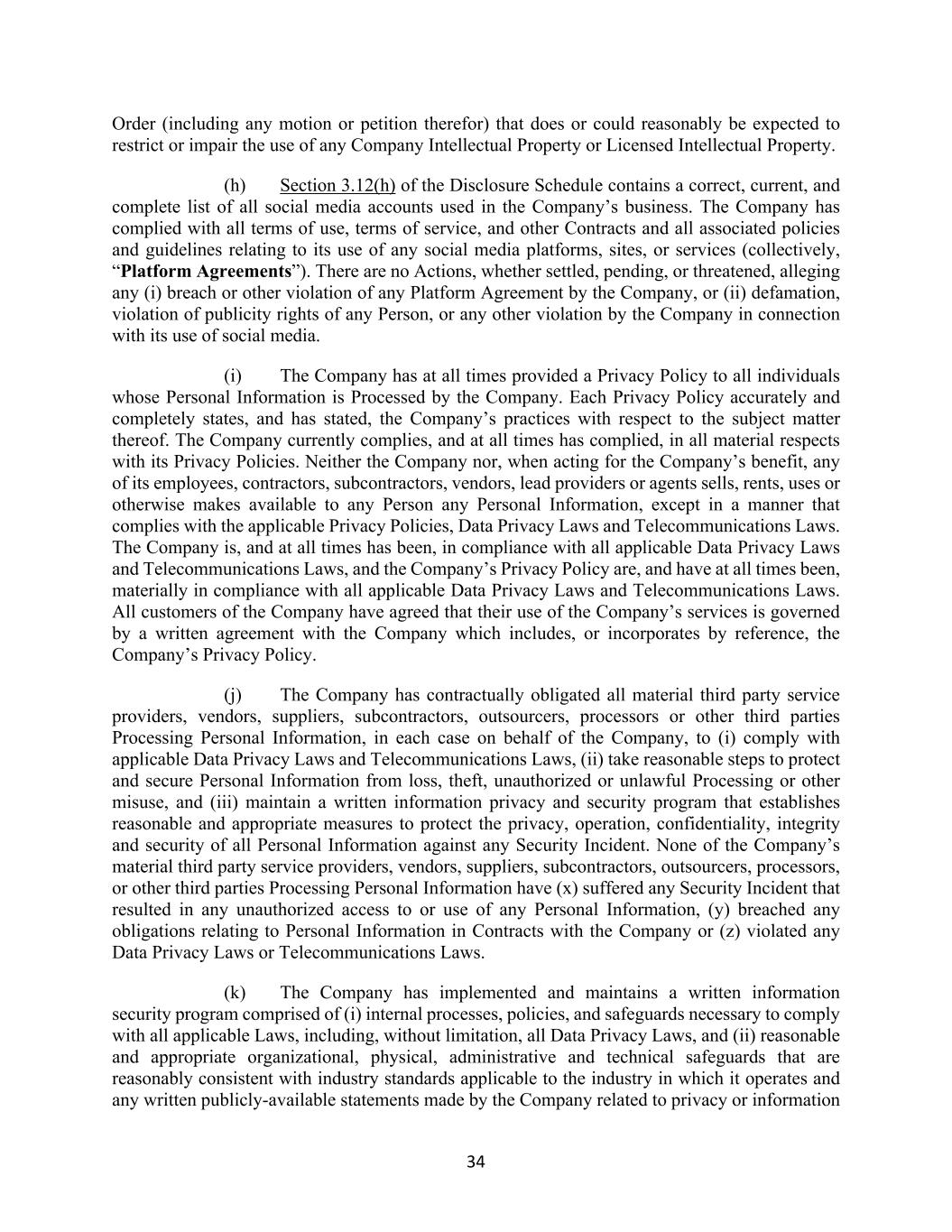 34 Order (including any motion or petition therefor) that does or could reasonably be expected to restrict or impair the use of any Company Intellectual Property or Licensed Intellectual Property. (h) Section 3.12(h) of the Disclosure Schedule contains a correct, current, and complete list of all social media accounts used in the Company’s business. The Company has complied with all terms of use, terms of service, and other Contracts and all associated policies and guidelines relating to its use of any social media platforms, sites, or services (collectively, “Platform Agreements”). There are no Actions, whether settled, pending, or threatened, alleging any (i) breach or other violation of any Platform Agreement by the Company, or (ii) defamation, violation of publicity rights of any Person, or any other violation by the Company in connection with its use of social media. (i) The Company has at all times provided a Privacy Policy to all individuals whose Personal Information is Processed by the Company. Each Privacy Policy accurately and completely states, and has stated, the Company’s practices with respect to the subject matter thereof. The Company currently complies, and at all times has complied, in all material respects with its Privacy Policies. Neither the Company nor, when acting for the Company’s benefit, any of its employees, contractors, subcontractors, vendors, lead providers or agents sells, rents, uses or otherwise makes available to any Person any Personal Information, except in a manner that complies with the applicable Privacy Policies, Data Privacy Laws and Telecommunications Laws. The Company is, and at all times has been, in compliance with all applicable Data Privacy Laws and Telecommunications Laws, and the Company’s Privacy Policy are, and have at all times been, materially in compliance with all applicable Data Privacy Laws and Telecommunications Laws. All customers of the Company have agreed that their use of the Company’s services is governed by a written agreement with the Company which includes, or incorporates by reference, the Company’s Privacy Policy. (j) The Company has contractually obligated all material third party service providers, vendors, suppliers, subcontractors, outsourcers, processors or other third parties Processing Personal Information, in each case on behalf of the Company, to (i) comply with applicable Data Privacy Laws and Telecommunications Laws, (ii) take reasonable steps to protect and secure Personal Information from loss, theft, unauthorized or unlawful Processing or other misuse, and (iii) maintain a written information privacy and security program that establishes reasonable and appropriate measures to protect the privacy, operation, confidentiality, integrity and security of all Personal Information against any Security Incident. None of the Company’s material third party service providers, vendors, suppliers, subcontractors, outsourcers, processors, or other third parties Processing Personal Information have (x) suffered any Security Incident that resulted in any unauthorized access to or use of any Personal Information, (y) breached any obligations relating to Personal Information in Contracts with the Company or (z) violated any Data Privacy Laws or Telecommunications Laws. (k) The Company has implemented and maintains a written information security program comprised of (i) internal processes, policies, and safeguards necessary to comply with all applicable Laws, including, without limitation, all Data Privacy Laws, and (ii) reasonable and appropriate organizational, physical, administrative and technical safeguards that are reasonably consistent with industry standards applicable to the industry in which it operates and any written publicly-available statements made by the Company related to privacy or information