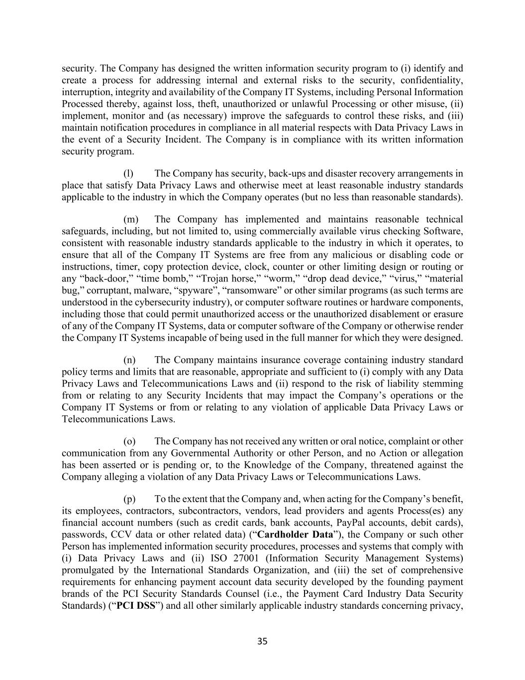 35 security. The Company has designed the written information security program to (i) identify and create a process for addressing internal and external risks to the security, confidentiality, interruption, integrity and availability of the Company IT Systems, including Personal Information Processed thereby, against loss, theft, unauthorized or unlawful Processing or other misuse, (ii) implement, monitor and (as necessary) improve the safeguards to control these risks, and (iii) maintain notification procedures in compliance in all material respects with Data Privacy Laws in the event of a Security Incident. The Company is in compliance with its written information security program. (l) The Company has security, back-ups and disaster recovery arrangements in place that satisfy Data Privacy Laws and otherwise meet at least reasonable industry standards applicable to the industry in which the Company operates (but no less than reasonable standards). (m) The Company has implemented and maintains reasonable technical safeguards, including, but not limited to, using commercially available virus checking Software, consistent with reasonable industry standards applicable to the industry in which it operates, to ensure that all of the Company IT Systems are free from any malicious or disabling code or instructions, timer, copy protection device, clock, counter or other limiting design or routing or any “back-door,” “time bomb,” “Trojan horse,” “worm,” “drop dead device,” “virus,” “material bug,” corruptant, malware, “spyware”, “ransomware” or other similar programs (as such terms are understood in the cybersecurity industry), or computer software routines or hardware components, including those that could permit unauthorized access or the unauthorized disablement or erasure of any of the Company IT Systems, data or computer software of the Company or otherwise render the Company IT Systems incapable of being used in the full manner for which they were designed. (n) The Company maintains insurance coverage containing industry standard policy terms and limits that are reasonable, appropriate and sufficient to (i) comply with any Data Privacy Laws and Telecommunications Laws and (ii) respond to the risk of liability stemming from or relating to any Security Incidents that may impact the Company’s operations or the Company IT Systems or from or relating to any violation of applicable Data Privacy Laws or Telecommunications Laws. (o) The Company has not received any written or oral notice, complaint or other communication from any Governmental Authority or other Person, and no Action or allegation has been asserted or is pending or, to the Knowledge of the Company, threatened against the Company alleging a violation of any Data Privacy Laws or Telecommunications Laws. (p) To the extent that the Company and, when acting for the Company’s benefit, its employees, contractors, subcontractors, vendors, lead providers and agents Process(es) any financial account numbers (such as credit cards, bank accounts, PayPal accounts, debit cards), passwords, CCV data or other related data) (“Cardholder Data”), the Company or such other Person has implemented information security procedures, processes and systems that comply with (i) Data Privacy Laws and (ii) ISO 27001 (Information Security Management Systems) promulgated by the International Standards Organization, and (iii) the set of comprehensive requirements for enhancing payment account data security developed by the founding payment brands of the PCI Security Standards Counsel (i.e., the Payment Card Industry Data Security Standards) (“PCI DSS”) and all other similarly applicable industry standards concerning privacy,