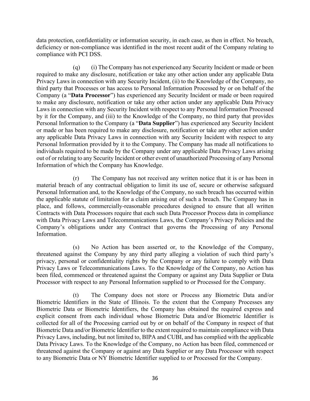36 data protection, confidentiality or information security, in each case, as then in effect. No breach, deficiency or non-compliance was identified in the most recent audit of the Company relating to compliance with PCI DSS. (q) (i) The Company has not experienced any Security Incident or made or been required to make any disclosure, notification or take any other action under any applicable Data Privacy Laws in connection with any Security Incident, (ii) to the Knowledge of the Company, no third party that Processes or has access to Personal Information Processed by or on behalf of the Company (a “Data Processor”) has experienced any Security Incident or made or been required to make any disclosure, notification or take any other action under any applicable Data Privacy Laws in connection with any Security Incident with respect to any Personal Information Processed by it for the Company, and (iii) to the Knowledge of the Company, no third party that provides Personal Information to the Company (a “Data Supplier”) has experienced any Security Incident or made or has been required to make any disclosure, notification or take any other action under any applicable Data Privacy Laws in connection with any Security Incident with respect to any Personal Information provided by it to the Company. The Company has made all notifications to individuals required to be made by the Company under any applicable Data Privacy Laws arising out of or relating to any Security Incident or other event of unauthorized Processing of any Personal Information of which the Company has Knowledge. (r) The Company has not received any written notice that it is or has been in material breach of any contractual obligation to limit its use of, secure or otherwise safeguard Personal Information and, to the Knowledge of the Company, no such breach has occurred within the applicable statute of limitation for a claim arising out of such a breach. The Company has in place, and follows, commercially-reasonable procedures designed to ensure that all written Contracts with Data Processors require that each such Data Processor Process data in compliance with Data Privacy Laws and Telecommunications Laws, the Company’s Privacy Policies and the Company’s obligations under any Contract that governs the Processing of any Personal Information. (s) No Action has been asserted or, to the Knowledge of the Company, threatened against the Company by any third party alleging a violation of such third party’s privacy, personal or confidentiality rights by the Company or any failure to comply with Data Privacy Laws or Telecommunications Laws. To the Knowledge of the Company, no Action has been filed, commenced or threatened against the Company or against any Data Supplier or Data Processor with respect to any Personal Information supplied to or Processed for the Company. (t) The Company does not store or Process any Biometric Data and/or Biometric Identifiers in the State of Illinois. To the extent that the Company Processes any Biometric Data or Biometric Identifiers, the Company has obtained the required express and explicit consent from each individual whose Biometric Data and/or Biometric Identifier is collected for all of the Processing carried out by or on behalf of the Company in respect of that Biometric Data and/or Biometric Identifier to the extent required to maintain compliance with Data Privacy Laws, including, but not limited to, BIPA and CUBI, and has complied with the applicable Data Privacy Laws. To the Knowledge of the Company, no Action has been filed, commenced or threatened against the Company or against any Data Supplier or any Data Processor with respect to any Biometric Data or NY Biometric Identifier supplied to or Processed for the Company.