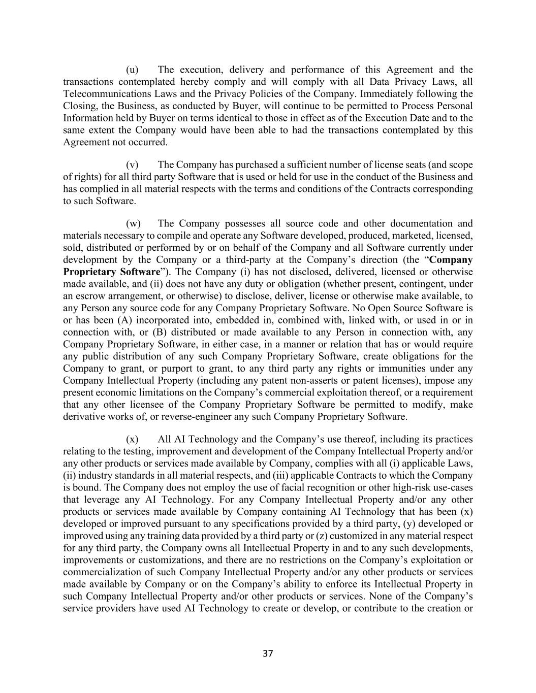 37 (u) The execution, delivery and performance of this Agreement and the transactions contemplated hereby comply and will comply with all Data Privacy Laws, all Telecommunications Laws and the Privacy Policies of the Company. Immediately following the Closing, the Business, as conducted by Buyer, will continue to be permitted to Process Personal Information held by Buyer on terms identical to those in effect as of the Execution Date and to the same extent the Company would have been able to had the transactions contemplated by this Agreement not occurred. (v) The Company has purchased a sufficient number of license seats (and scope of rights) for all third party Software that is used or held for use in the conduct of the Business and has complied in all material respects with the terms and conditions of the Contracts corresponding to such Software. (w) The Company possesses all source code and other documentation and materials necessary to compile and operate any Software developed, produced, marketed, licensed, sold, distributed or performed by or on behalf of the Company and all Software currently under development by the Company or a third-party at the Company’s direction (the “Company Proprietary Software”). The Company (i) has not disclosed, delivered, licensed or otherwise made available, and (ii) does not have any duty or obligation (whether present, contingent, under an escrow arrangement, or otherwise) to disclose, deliver, license or otherwise make available, to any Person any source code for any Company Proprietary Software. No Open Source Software is or has been (A) incorporated into, embedded in, combined with, linked with, or used in or in connection with, or (B) distributed or made available to any Person in connection with, any Company Proprietary Software, in either case, in a manner or relation that has or would require any public distribution of any such Company Proprietary Software, create obligations for the Company to grant, or purport to grant, to any third party any rights or immunities under any Company Intellectual Property (including any patent non-asserts or patent licenses), impose any present economic limitations on the Company’s commercial exploitation thereof, or a requirement that any other licensee of the Company Proprietary Software be permitted to modify, make derivative works of, or reverse-engineer any such Company Proprietary Software. (x) All AI Technology and the Company’s use thereof, including its practices relating to the testing, improvement and development of the Company Intellectual Property and/or any other products or services made available by Company, complies with all (i) applicable Laws, (ii) industry standards in all material respects, and (iii) applicable Contracts to which the Company is bound. The Company does not employ the use of facial recognition or other high-risk use-cases that leverage any AI Technology. For any Company Intellectual Property and/or any other products or services made available by Company containing AI Technology that has been (x) developed or improved pursuant to any specifications provided by a third party, (y) developed or improved using any training data provided by a third party or (z) customized in any material respect for any third party, the Company owns all Intellectual Property in and to any such developments, improvements or customizations, and there are no restrictions on the Company’s exploitation or commercialization of such Company Intellectual Property and/or any other products or services made available by Company or on the Company’s ability to enforce its Intellectual Property in such Company Intellectual Property and/or other products or services. None of the Company’s service providers have used AI Technology to create or develop, or contribute to the creation or