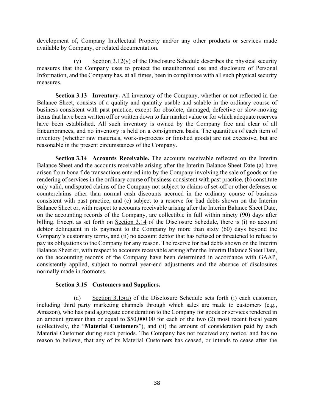 38 development of, Company Intellectual Property and/or any other products or services made available by Company, or related documentation. (y) Section 3.12(y) of the Disclosure Schedule describes the physical security measures that the Company uses to protect the unauthorized use and disclosure of Personal Information, and the Company has, at all times, been in compliance with all such physical security measures. Section 3.13 Inventory. All inventory of the Company, whether or not reflected in the Balance Sheet, consists of a quality and quantity usable and salable in the ordinary course of business consistent with past practice, except for obsolete, damaged, defective or slow-moving items that have been written off or written down to fair market value or for which adequate reserves have been established. All such inventory is owned by the Company free and clear of all Encumbrances, and no inventory is held on a consignment basis. The quantities of each item of inventory (whether raw materials, work-in-process or finished goods) are not excessive, but are reasonable in the present circumstances of the Company. Section 3.14 Accounts Receivable. The accounts receivable reflected on the Interim Balance Sheet and the accounts receivable arising after the Interim Balance Sheet Date (a) have arisen from bona fide transactions entered into by the Company involving the sale of goods or the rendering of services in the ordinary course of business consistent with past practice, (b) constitute only valid, undisputed claims of the Company not subject to claims of set-off or other defenses or counterclaims other than normal cash discounts accrued in the ordinary course of business consistent with past practice, and (c) subject to a reserve for bad debts shown on the Interim Balance Sheet or, with respect to accounts receivable arising after the Interim Balance Sheet Date, on the accounting records of the Company, are collectible in full within ninety (90) days after billing. Except as set forth on Section 3.14 of the Disclosure Schedule, there is (i) no account debtor delinquent in its payment to the Company by more than sixty (60) days beyond the Company’s customary terms, and (ii) no account debtor that has refused or threatened to refuse to pay its obligations to the Company for any reason. The reserve for bad debts shown on the Interim Balance Sheet or, with respect to accounts receivable arising after the Interim Balance Sheet Date, on the accounting records of the Company have been determined in accordance with GAAP, consistently applied, subject to normal year-end adjustments and the absence of disclosures normally made in footnotes. Section 3.15 Customers and Suppliers. (a) Section 3.15(a) of the Disclosure Schedule sets forth (i) each customer, including third party marketing channels through which sales are made to customers (e.g., Amazon), who has paid aggregate consideration to the Company for goods or services rendered in an amount greater than or equal to $50,000.00 for each of the two (2) most recent fiscal years (collectively, the “Material Customers”), and (ii) the amount of consideration paid by each Material Customer during such periods. The Company has not received any notice, and has no reason to believe, that any of its Material Customers has ceased, or intends to cease after the