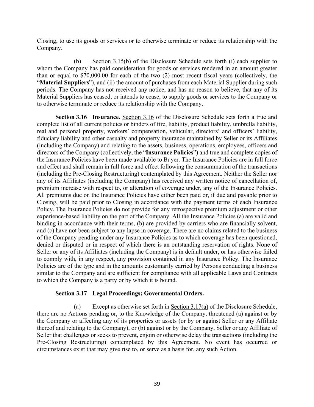 39 Closing, to use its goods or services or to otherwise terminate or reduce its relationship with the Company. (b) Section 3.15(b) of the Disclosure Schedule sets forth (i) each supplier to whom the Company has paid consideration for goods or services rendered in an amount greater than or equal to $70,000.00 for each of the two (2) most recent fiscal years (collectively, the “Material Suppliers”), and (ii) the amount of purchases from each Material Supplier during such periods. The Company has not received any notice, and has no reason to believe, that any of its Material Suppliers has ceased, or intends to cease, to supply goods or services to the Company or to otherwise terminate or reduce its relationship with the Company. Section 3.16 Insurance. Section 3.16 of the Disclosure Schedule sets forth a true and complete list of all current policies or binders of fire, liability, product liability, umbrella liability, real and personal property, workers’ compensation, vehicular, directors’ and officers’ liability, fiduciary liability and other casualty and property insurance maintained by Seller or its Affiliates (including the Company) and relating to the assets, business, operations, employees, officers and directors of the Company (collectively, the “Insurance Policies”) and true and complete copies of the Insurance Policies have been made available to Buyer. The Insurance Policies are in full force and effect and shall remain in full force and effect following the consummation of the transactions (including the Pre-Closing Restructuring) contemplated by this Agreement. Neither the Seller nor any of its Affiliates (including the Company) has received any written notice of cancellation of, premium increase with respect to, or alteration of coverage under, any of the Insurance Policies. All premiums due on the Insurance Policies have either been paid or, if due and payable prior to Closing, will be paid prior to Closing in accordance with the payment terms of each Insurance Policy. The Insurance Policies do not provide for any retrospective premium adjustment or other experience-based liability on the part of the Company. All the Insurance Policies (a) are valid and binding in accordance with their terms, (b) are provided by carriers who are financially solvent, and (c) have not been subject to any lapse in coverage. There are no claims related to the business of the Company pending under any Insurance Policies as to which coverage has been questioned, denied or disputed or in respect of which there is an outstanding reservation of rights. None of Seller or any of its Affiliates (including the Company) is in default under, or has otherwise failed to comply with, in any respect, any provision contained in any Insurance Policy. The Insurance Policies are of the type and in the amounts customarily carried by Persons conducting a business similar to the Company and are sufficient for compliance with all applicable Laws and Contracts to which the Company is a party or by which it is bound. Section 3.17 Legal Proceedings; Governmental Orders. (a) Except as otherwise set forth in Section 3.17(a) of the Disclosure Schedule, there are no Actions pending or, to the Knowledge of the Company, threatened (a) against or by the Company or affecting any of its properties or assets (or by or against Seller or any Affiliate thereof and relating to the Company), or (b) against or by the Company, Seller or any Affiliate of Seller that challenges or seeks to prevent, enjoin or otherwise delay the transactions (including the Pre-Closing Restructuring) contemplated by this Agreement. No event has occurred or circumstances exist that may give rise to, or serve as a basis for, any such Action.