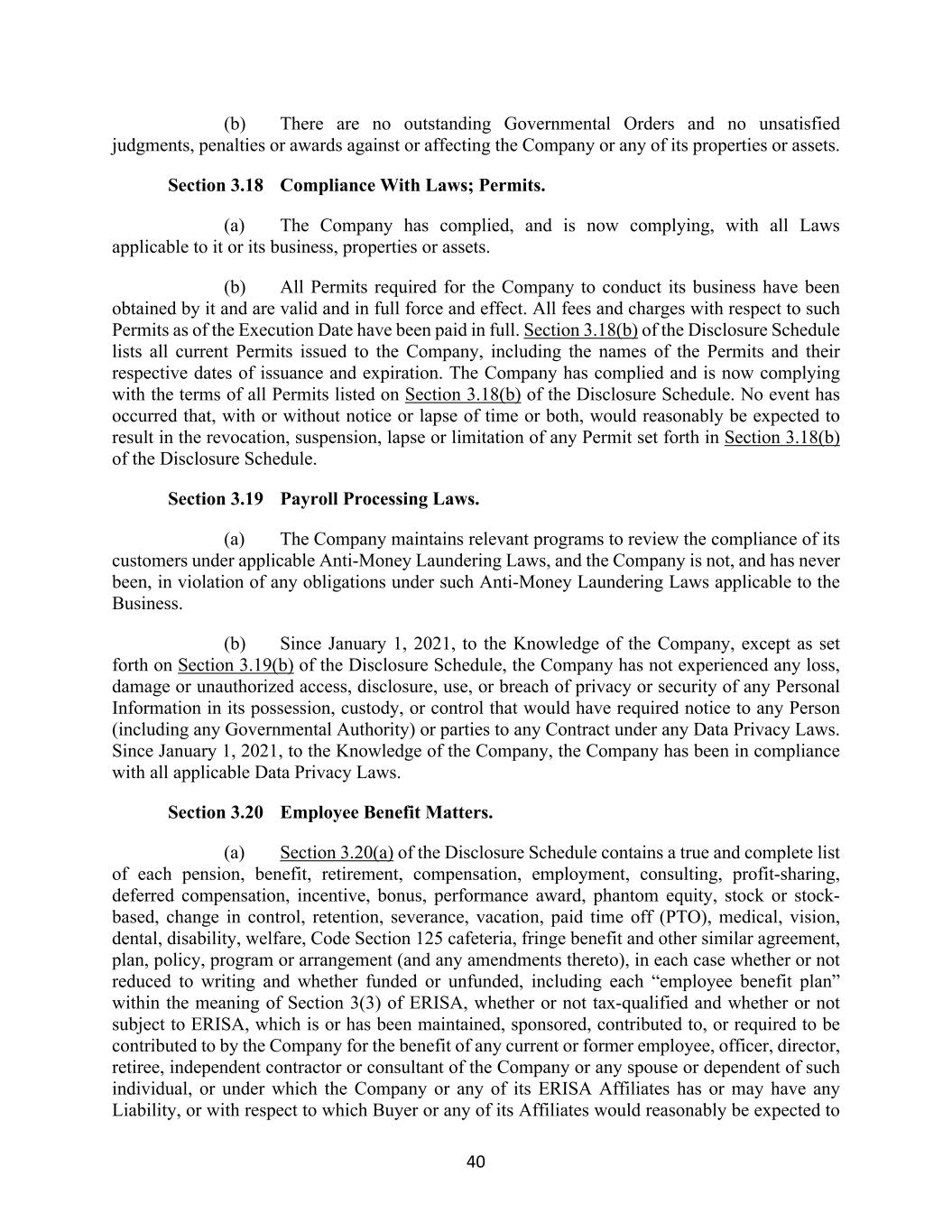40 (b) There are no outstanding Governmental Orders and no unsatisfied judgments, penalties or awards against or affecting the Company or any of its properties or assets. Section 3.18 Compliance With Laws; Permits. (a) The Company has complied, and is now complying, with all Laws applicable to it or its business, properties or assets. (b) All Permits required for the Company to conduct its business have been obtained by it and are valid and in full force and effect. All fees and charges with respect to such Permits as of the Execution Date have been paid in full. Section 3.18(b) of the Disclosure Schedule lists all current Permits issued to the Company, including the names of the Permits and their respective dates of issuance and expiration. The Company has complied and is now complying with the terms of all Permits listed on Section 3.18(b) of the Disclosure Schedule. No event has occurred that, with or without notice or lapse of time or both, would reasonably be expected to result in the revocation, suspension, lapse or limitation of any Permit set forth in Section 3.18(b) of the Disclosure Schedule. Section 3.19 Payroll Processing Laws. (a) The Company maintains relevant programs to review the compliance of its customers under applicable Anti-Money Laundering Laws, and the Company is not, and has never been, in violation of any obligations under such Anti-Money Laundering Laws applicable to the Business. (b) Since January 1, 2021, to the Knowledge of the Company, except as set forth on Section 3.19(b) of the Disclosure Schedule, the Company has not experienced any loss, damage or unauthorized access, disclosure, use, or breach of privacy or security of any Personal Information in its possession, custody, or control that would have required notice to any Person (including any Governmental Authority) or parties to any Contract under any Data Privacy Laws. Since January 1, 2021, to the Knowledge of the Company, the Company has been in compliance with all applicable Data Privacy Laws. Section 3.20 Employee Benefit Matters. (a) Section 3.20(a) of the Disclosure Schedule contains a true and complete list of each pension, benefit, retirement, compensation, employment, consulting, profit-sharing, deferred compensation, incentive, bonus, performance award, phantom equity, stock or stock- based, change in control, retention, severance, vacation, paid time off (PTO), medical, vision, dental, disability, welfare, Code Section 125 cafeteria, fringe benefit and other similar agreement, plan, policy, program or arrangement (and any amendments thereto), in each case whether or not reduced to writing and whether funded or unfunded, including each “employee benefit plan” within the meaning of Section 3(3) of ERISA, whether or not tax-qualified and whether or not subject to ERISA, which is or has been maintained, sponsored, contributed to, or required to be contributed to by the Company for the benefit of any current or former employee, officer, director, retiree, independent contractor or consultant of the Company or any spouse or dependent of such individual, or under which the Company or any of its ERISA Affiliates has or may have any Liability, or with respect to which Buyer or any of its Affiliates would reasonably be expected to