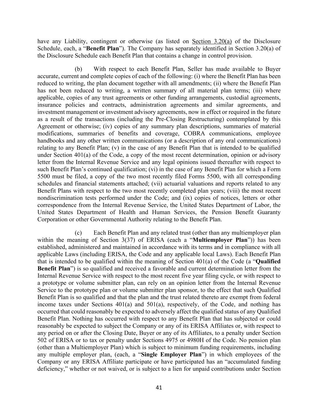 41 have any Liability, contingent or otherwise (as listed on Section 3.20(a) of the Disclosure Schedule, each, a “Benefit Plan”). The Company has separately identified in Section 3.20(a) of the Disclosure Schedule each Benefit Plan that contains a change in control provision. (b) With respect to each Benefit Plan, Seller has made available to Buyer accurate, current and complete copies of each of the following: (i) where the Benefit Plan has been reduced to writing, the plan document together with all amendments; (ii) where the Benefit Plan has not been reduced to writing, a written summary of all material plan terms; (iii) where applicable, copies of any trust agreements or other funding arrangements, custodial agreements, insurance policies and contracts, administration agreements and similar agreements, and investment management or investment advisory agreements, now in effect or required in the future as a result of the transactions (including the Pre-Closing Restructuring) contemplated by this Agreement or otherwise; (iv) copies of any summary plan descriptions, summaries of material modifications, summaries of benefits and coverage, COBRA communications, employee handbooks and any other written communications (or a description of any oral communications) relating to any Benefit Plan; (v) in the case of any Benefit Plan that is intended to be qualified under Section 401(a) of the Code, a copy of the most recent determination, opinion or advisory letter from the Internal Revenue Service and any legal opinions issued thereafter with respect to such Benefit Plan’s continued qualification; (vi) in the case of any Benefit Plan for which a Form 5500 must be filed, a copy of the two most recently filed Forms 5500, with all corresponding schedules and financial statements attached; (vii) actuarial valuations and reports related to any Benefit Plans with respect to the two most recently completed plan years; (viii) the most recent nondiscrimination tests performed under the Code; and (ix) copies of notices, letters or other correspondence from the Internal Revenue Service, the United States Department of Labor, the United States Department of Health and Human Services, the Pension Benefit Guaranty Corporation or other Governmental Authority relating to the Benefit Plan. (c) Each Benefit Plan and any related trust (other than any multiemployer plan within the meaning of Section 3(37) of ERISA (each a “Multiemployer Plan”)) has been established, administered and maintained in accordance with its terms and in compliance with all applicable Laws (including ERISA, the Code and any applicable local Laws). Each Benefit Plan that is intended to be qualified within the meaning of Section 401(a) of the Code (a “Qualified Benefit Plan”) is so qualified and received a favorable and current determination letter from the Internal Revenue Service with respect to the most recent five year filing cycle, or with respect to a prototype or volume submitter plan, can rely on an opinion letter from the Internal Revenue Service to the prototype plan or volume submitter plan sponsor, to the effect that such Qualified Benefit Plan is so qualified and that the plan and the trust related thereto are exempt from federal income taxes under Sections 401(a) and 501(a), respectively, of the Code, and nothing has occurred that could reasonably be expected to adversely affect the qualified status of any Qualified Benefit Plan. Nothing has occurred with respect to any Benefit Plan that has subjected or could reasonably be expected to subject the Company or any of its ERISA Affiliates or, with respect to any period on or after the Closing Date, Buyer or any of its Affiliates, to a penalty under Section 502 of ERISA or to tax or penalty under Sections 4975 or 4980H of the Code. No pension plan (other than a Multiemployer Plan) which is subject to minimum funding requirements, including any multiple employer plan, (each, a “Single Employer Plan”) in which employees of the Company or any ERISA Affiliate participate or have participated has an “accumulated funding deficiency,” whether or not waived, or is subject to a lien for unpaid contributions under Section
