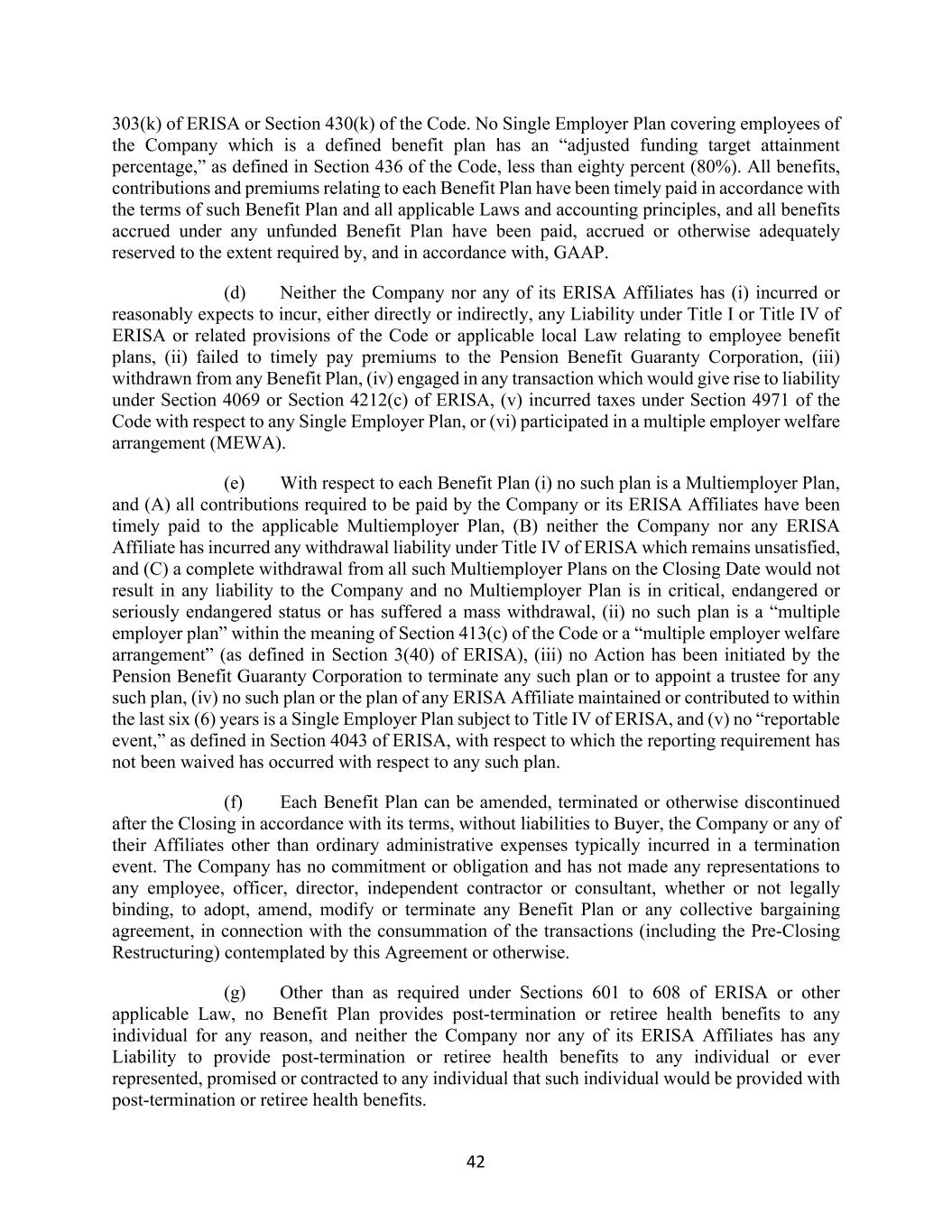 42 303(k) of ERISA or Section 430(k) of the Code. No Single Employer Plan covering employees of the Company which is a defined benefit plan has an “adjusted funding target attainment percentage,” as defined in Section 436 of the Code, less than eighty percent (80%). All benefits, contributions and premiums relating to each Benefit Plan have been timely paid in accordance with the terms of such Benefit Plan and all applicable Laws and accounting principles, and all benefits accrued under any unfunded Benefit Plan have been paid, accrued or otherwise adequately reserved to the extent required by, and in accordance with, GAAP. (d) Neither the Company nor any of its ERISA Affiliates has (i) incurred or reasonably expects to incur, either directly or indirectly, any Liability under Title I or Title IV of ERISA or related provisions of the Code or applicable local Law relating to employee benefit plans, (ii) failed to timely pay premiums to the Pension Benefit Guaranty Corporation, (iii) withdrawn from any Benefit Plan, (iv) engaged in any transaction which would give rise to liability under Section 4069 or Section 4212(c) of ERISA, (v) incurred taxes under Section 4971 of the Code with respect to any Single Employer Plan, or (vi) participated in a multiple employer welfare arrangement (MEWA). (e) With respect to each Benefit Plan (i) no such plan is a Multiemployer Plan, and (A) all contributions required to be paid by the Company or its ERISA Affiliates have been timely paid to the applicable Multiemployer Plan, (B) neither the Company nor any ERISA Affiliate has incurred any withdrawal liability under Title IV of ERISA which remains unsatisfied, and (C) a complete withdrawal from all such Multiemployer Plans on the Closing Date would not result in any liability to the Company and no Multiemployer Plan is in critical, endangered or seriously endangered status or has suffered a mass withdrawal, (ii) no such plan is a “multiple employer plan” within the meaning of Section 413(c) of the Code or a “multiple employer welfare arrangement” (as defined in Section 3(40) of ERISA), (iii) no Action has been initiated by the Pension Benefit Guaranty Corporation to terminate any such plan or to appoint a trustee for any such plan, (iv) no such plan or the plan of any ERISA Affiliate maintained or contributed to within the last six (6) years is a Single Employer Plan subject to Title IV of ERISA, and (v) no “reportable event,” as defined in Section 4043 of ERISA, with respect to which the reporting requirement has not been waived has occurred with respect to any such plan. (f) Each Benefit Plan can be amended, terminated or otherwise discontinued after the Closing in accordance with its terms, without liabilities to Buyer, the Company or any of their Affiliates other than ordinary administrative expenses typically incurred in a termination event. The Company has no commitment or obligation and has not made any representations to any employee, officer, director, independent contractor or consultant, whether or not legally binding, to adopt, amend, modify or terminate any Benefit Plan or any collective bargaining agreement, in connection with the consummation of the transactions (including the Pre-Closing Restructuring) contemplated by this Agreement or otherwise. (g) Other than as required under Sections 601 to 608 of ERISA or other applicable Law, no Benefit Plan provides post-termination or retiree health benefits to any individual for any reason, and neither the Company nor any of its ERISA Affiliates has any Liability to provide post-termination or retiree health benefits to any individual or ever represented, promised or contracted to any individual that such individual would be provided with post-termination or retiree health benefits.