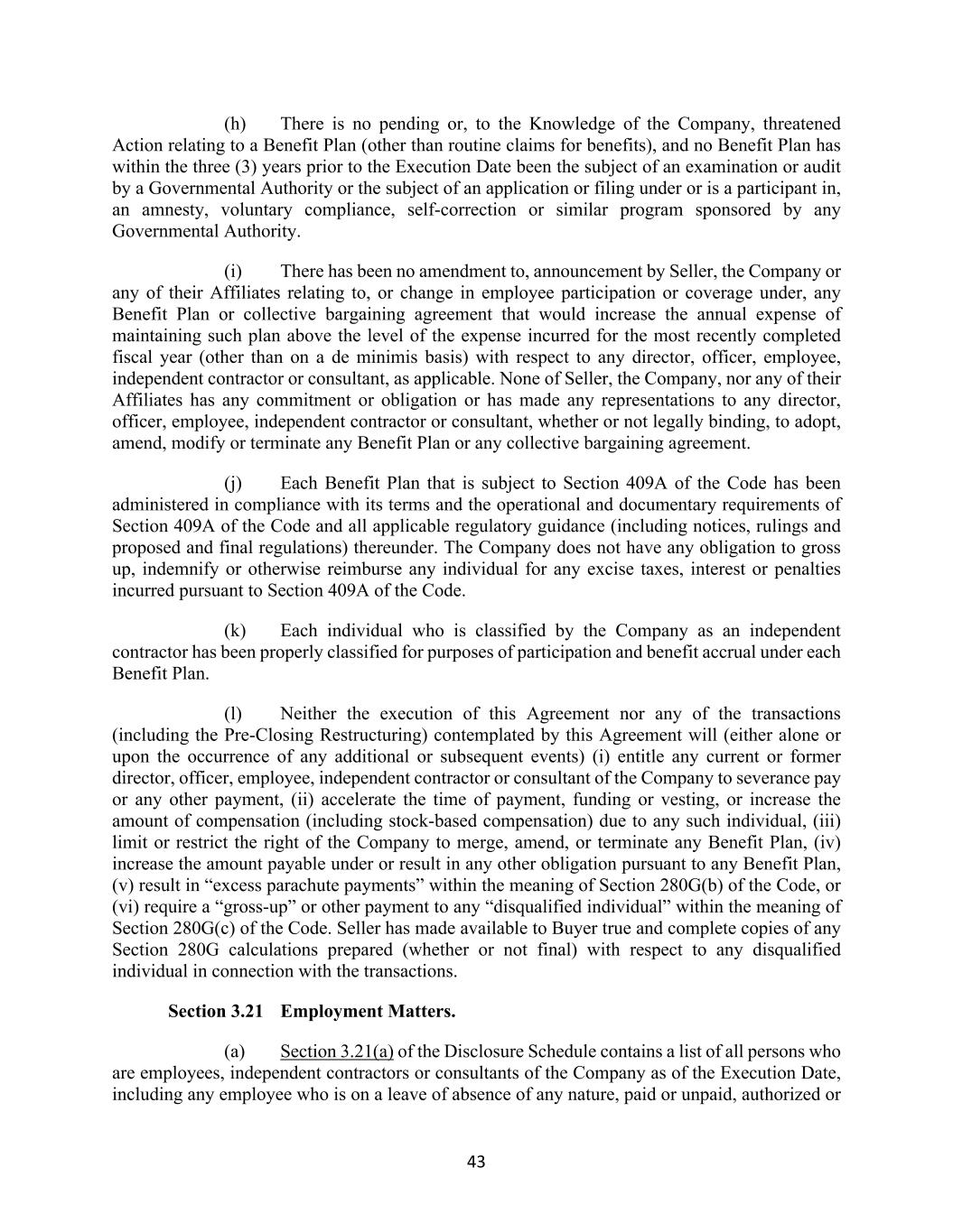 43 (h) There is no pending or, to the Knowledge of the Company, threatened Action relating to a Benefit Plan (other than routine claims for benefits), and no Benefit Plan has within the three (3) years prior to the Execution Date been the subject of an examination or audit by a Governmental Authority or the subject of an application or filing under or is a participant in, an amnesty, voluntary compliance, self-correction or similar program sponsored by any Governmental Authority. (i) There has been no amendment to, announcement by Seller, the Company or any of their Affiliates relating to, or change in employee participation or coverage under, any Benefit Plan or collective bargaining agreement that would increase the annual expense of maintaining such plan above the level of the expense incurred for the most recently completed fiscal year (other than on a de minimis basis) with respect to any director, officer, employee, independent contractor or consultant, as applicable. None of Seller, the Company, nor any of their Affiliates has any commitment or obligation or has made any representations to any director, officer, employee, independent contractor or consultant, whether or not legally binding, to adopt, amend, modify or terminate any Benefit Plan or any collective bargaining agreement. (j) Each Benefit Plan that is subject to Section 409A of the Code has been administered in compliance with its terms and the operational and documentary requirements of Section 409A of the Code and all applicable regulatory guidance (including notices, rulings and proposed and final regulations) thereunder. The Company does not have any obligation to gross up, indemnify or otherwise reimburse any individual for any excise taxes, interest or penalties incurred pursuant to Section 409A of the Code. (k) Each individual who is classified by the Company as an independent contractor has been properly classified for purposes of participation and benefit accrual under each Benefit Plan. (l) Neither the execution of this Agreement nor any of the transactions (including the Pre-Closing Restructuring) contemplated by this Agreement will (either alone or upon the occurrence of any additional or subsequent events) (i) entitle any current or former director, officer, employee, independent contractor or consultant of the Company to severance pay or any other payment, (ii) accelerate the time of payment, funding or vesting, or increase the amount of compensation (including stock-based compensation) due to any such individual, (iii) limit or restrict the right of the Company to merge, amend, or terminate any Benefit Plan, (iv) increase the amount payable under or result in any other obligation pursuant to any Benefit Plan, (v) result in “excess parachute payments” within the meaning of Section 280G(b) of the Code, or (vi) require a “gross-up” or other payment to any “disqualified individual” within the meaning of Section 280G(c) of the Code. Seller has made available to Buyer true and complete copies of any Section 280G calculations prepared (whether or not final) with respect to any disqualified individual in connection with the transactions. Section 3.21 Employment Matters. (a) Section 3.21(a) of the Disclosure Schedule contains a list of all persons who are employees, independent contractors or consultants of the Company as of the Execution Date, including any employee who is on a leave of absence of any nature, paid or unpaid, authorized or