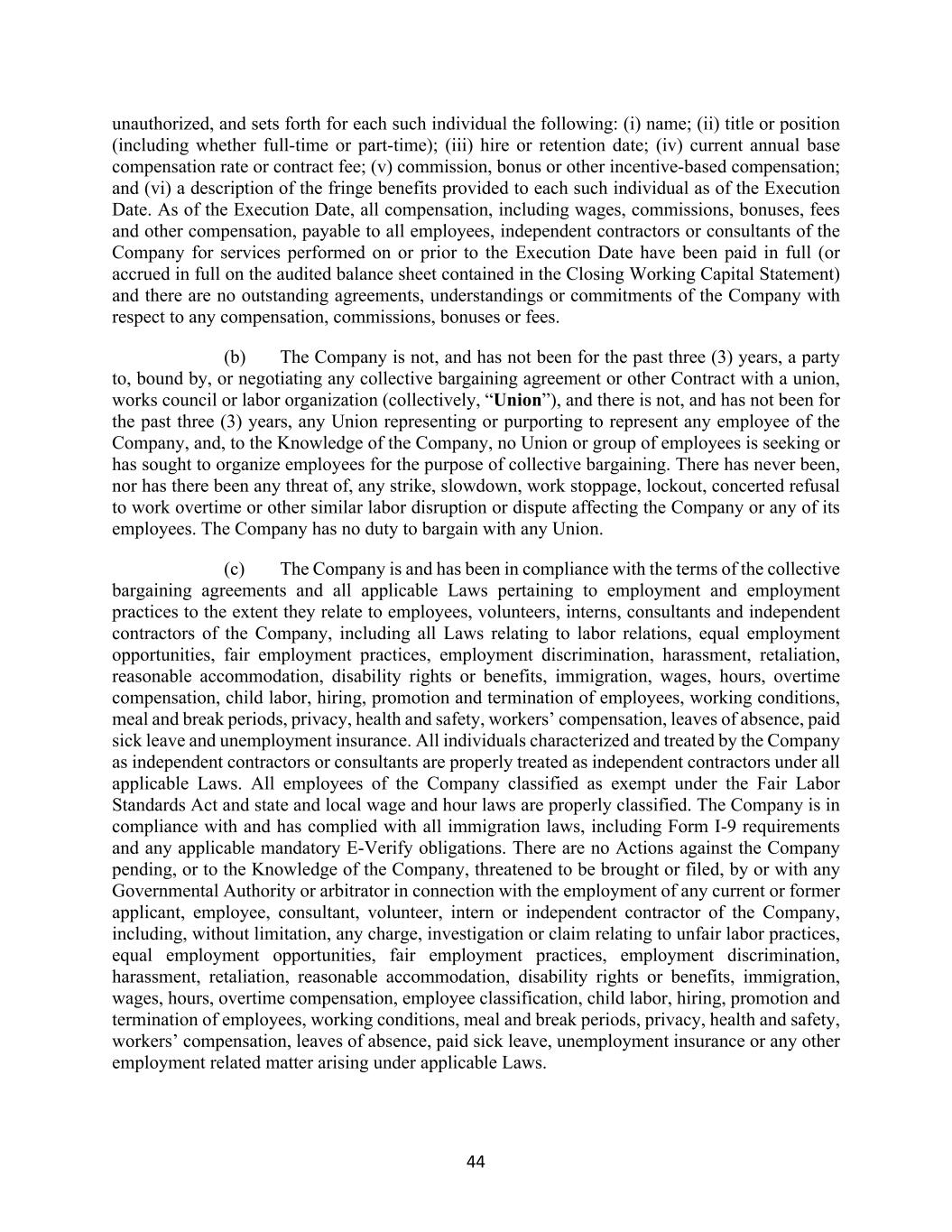 44 unauthorized, and sets forth for each such individual the following: (i) name; (ii) title or position (including whether full-time or part-time); (iii) hire or retention date; (iv) current annual base compensation rate or contract fee; (v) commission, bonus or other incentive-based compensation; and (vi) a description of the fringe benefits provided to each such individual as of the Execution Date. As of the Execution Date, all compensation, including wages, commissions, bonuses, fees and other compensation, payable to all employees, independent contractors or consultants of the Company for services performed on or prior to the Execution Date have been paid in full (or accrued in full on the audited balance sheet contained in the Closing Working Capital Statement) and there are no outstanding agreements, understandings or commitments of the Company with respect to any compensation, commissions, bonuses or fees. (b) The Company is not, and has not been for the past three (3) years, a party to, bound by, or negotiating any collective bargaining agreement or other Contract with a union, works council or labor organization (collectively, “Union”), and there is not, and has not been for the past three (3) years, any Union representing or purporting to represent any employee of the Company, and, to the Knowledge of the Company, no Union or group of employees is seeking or has sought to organize employees for the purpose of collective bargaining. There has never been, nor has there been any threat of, any strike, slowdown, work stoppage, lockout, concerted refusal to work overtime or other similar labor disruption or dispute affecting the Company or any of its employees. The Company has no duty to bargain with any Union. (c) The Company is and has been in compliance with the terms of the collective bargaining agreements and all applicable Laws pertaining to employment and employment practices to the extent they relate to employees, volunteers, interns, consultants and independent contractors of the Company, including all Laws relating to labor relations, equal employment opportunities, fair employment practices, employment discrimination, harassment, retaliation, reasonable accommodation, disability rights or benefits, immigration, wages, hours, overtime compensation, child labor, hiring, promotion and termination of employees, working conditions, meal and break periods, privacy, health and safety, workers’ compensation, leaves of absence, paid sick leave and unemployment insurance. All individuals characterized and treated by the Company as independent contractors or consultants are properly treated as independent contractors under all applicable Laws. All employees of the Company classified as exempt under the Fair Labor Standards Act and state and local wage and hour laws are properly classified. The Company is in compliance with and has complied with all immigration laws, including Form I-9 requirements and any applicable mandatory E-Verify obligations. There are no Actions against the Company pending, or to the Knowledge of the Company, threatened to be brought or filed, by or with any Governmental Authority or arbitrator in connection with the employment of any current or former applicant, employee, consultant, volunteer, intern or independent contractor of the Company, including, without limitation, any charge, investigation or claim relating to unfair labor practices, equal employment opportunities, fair employment practices, employment discrimination, harassment, retaliation, reasonable accommodation, disability rights or benefits, immigration, wages, hours, overtime compensation, employee classification, child labor, hiring, promotion and termination of employees, working conditions, meal and break periods, privacy, health and safety, workers’ compensation, leaves of absence, paid sick leave, unemployment insurance or any other employment related matter arising under applicable Laws.