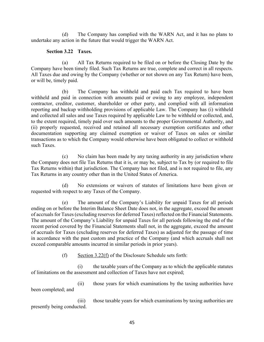 45 (d) The Company has complied with the WARN Act, and it has no plans to undertake any action in the future that would trigger the WARN Act. Section 3.22 Taxes. (a) All Tax Returns required to be filed on or before the Closing Date by the Company have been timely filed. Such Tax Returns are true, complete and correct in all respects. All Taxes due and owing by the Company (whether or not shown on any Tax Return) have been, or will be, timely paid. (b) The Company has withheld and paid each Tax required to have been withheld and paid in connection with amounts paid or owing to any employee, independent contractor, creditor, customer, shareholder or other party, and complied with all information reporting and backup withholding provisions of applicable Law. The Company has (i) withheld and collected all sales and use Taxes required by applicable Law to be withheld or collected, and, to the extent required, timely paid over such amounts to the proper Governmental Authority, and (ii) properly requested, received and retained all necessary exemption certificates and other documentation supporting any claimed exemption or waiver of Taxes on sales or similar transactions as to which the Company would otherwise have been obligated to collect or withhold such Taxes. (c) No claim has been made by any taxing authority in any jurisdiction where the Company does not file Tax Returns that it is, or may be, subject to Tax by (or required to file Tax Returns within) that jurisdiction. The Company has not filed, and is not required to file, any Tax Returns in any country other than in the United States of America. (d) No extensions or waivers of statutes of limitations have been given or requested with respect to any Taxes of the Company. (e) The amount of the Company’s Liability for unpaid Taxes for all periods ending on or before the Interim Balance Sheet Date does not, in the aggregate, exceed the amount of accruals for Taxes (excluding reserves for deferred Taxes) reflected on the Financial Statements. The amount of the Company’s Liability for unpaid Taxes for all periods following the end of the recent period covered by the Financial Statements shall not, in the aggregate, exceed the amount of accruals for Taxes (excluding reserves for deferred Taxes) as adjusted for the passage of time in accordance with the past custom and practice of the Company (and which accruals shall not exceed comparable amounts incurred in similar periods in prior years). (f) Section 3.22(f) of the Disclosure Schedule sets forth: (i) the taxable years of the Company as to which the applicable statutes of limitations on the assessment and collection of Taxes have not expired; (ii) those years for which examinations by the taxing authorities have been completed; and (iii) those taxable years for which examinations by taxing authorities are presently being conducted.