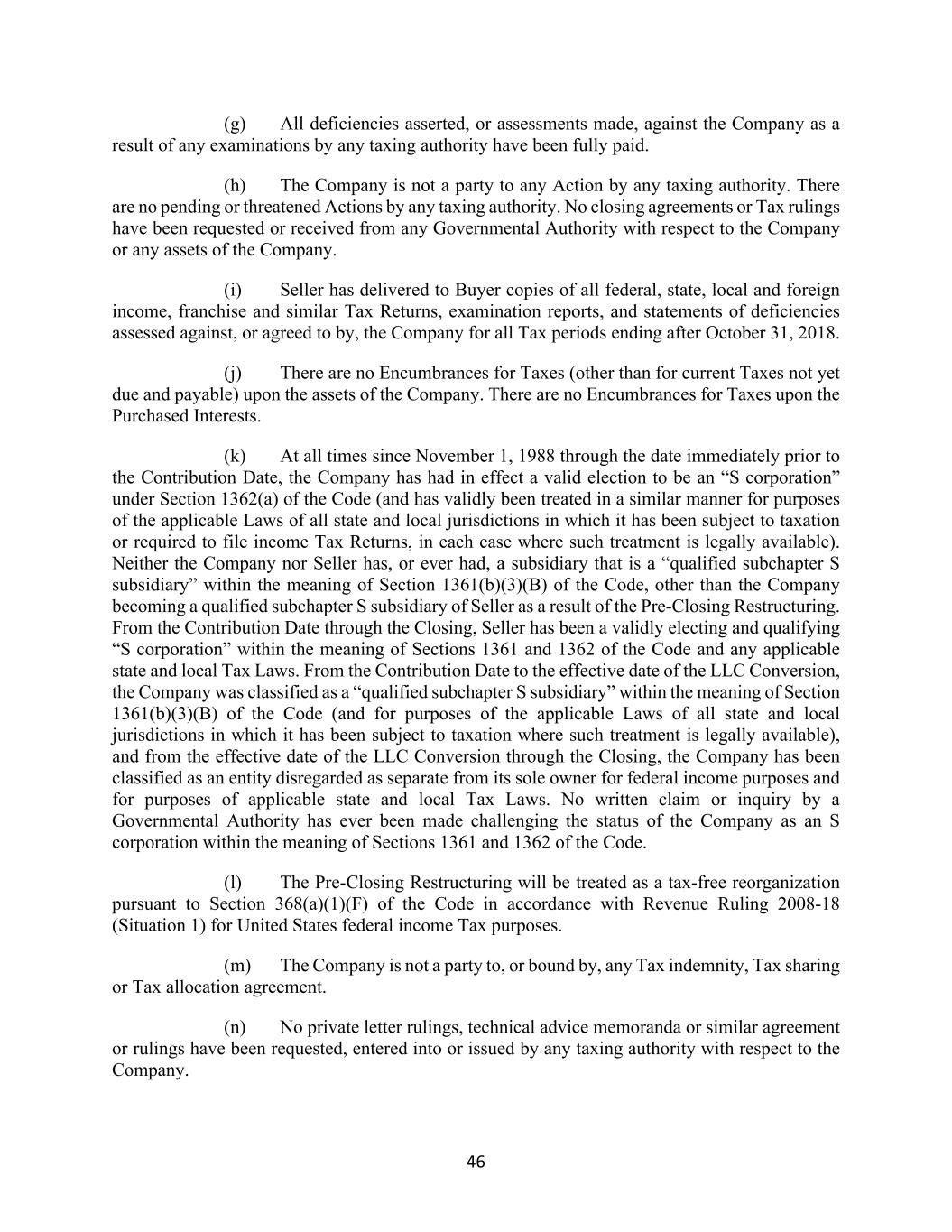 46 (g) All deficiencies asserted, or assessments made, against the Company as a result of any examinations by any taxing authority have been fully paid. (h) The Company is not a party to any Action by any taxing authority. There are no pending or threatened Actions by any taxing authority. No closing agreements or Tax rulings have been requested or received from any Governmental Authority with respect to the Company or any assets of the Company. (i) Seller has delivered to Buyer copies of all federal, state, local and foreign income, franchise and similar Tax Returns, examination reports, and statements of deficiencies assessed against, or agreed to by, the Company for all Tax periods ending after October 31, 2018. (j) There are no Encumbrances for Taxes (other than for current Taxes not yet due and payable) upon the assets of the Company. There are no Encumbrances for Taxes upon the Purchased Interests. (k) At all times since November 1, 1988 through the date immediately prior to the Contribution Date, the Company has had in effect a valid election to be an “S corporation” under Section 1362(a) of the Code (and has validly been treated in a similar manner for purposes of the applicable Laws of all state and local jurisdictions in which it has been subject to taxation or required to file income Tax Returns, in each case where such treatment is legally available). Neither the Company nor Seller has, or ever had, a subsidiary that is a “qualified subchapter S subsidiary” within the meaning of Section 1361(b)(3)(B) of the Code, other than the Company becoming a qualified subchapter S subsidiary of Seller as a result of the Pre-Closing Restructuring. From the Contribution Date through the Closing, Seller has been a validly electing and qualifying “S corporation” within the meaning of Sections 1361 and 1362 of the Code and any applicable state and local Tax Laws. From the Contribution Date to the effective date of the LLC Conversion, the Company was classified as a “qualified subchapter S subsidiary” within the meaning of Section 1361(b)(3)(B) of the Code (and for purposes of the applicable Laws of all state and local jurisdictions in which it has been subject to taxation where such treatment is legally available), and from the effective date of the LLC Conversion through the Closing, the Company has been classified as an entity disregarded as separate from its sole owner for federal income purposes and for purposes of applicable state and local Tax Laws. No written claim or inquiry by a Governmental Authority has ever been made challenging the status of the Company as an S corporation within the meaning of Sections 1361 and 1362 of the Code. (l) The Pre-Closing Restructuring will be treated as a tax-free reorganization pursuant to Section 368(a)(1)(F) of the Code in accordance with Revenue Ruling 2008-18 (Situation 1) for United States federal income Tax purposes. (m) The Company is not a party to, or bound by, any Tax indemnity, Tax sharing or Tax allocation agreement. (n) No private letter rulings, technical advice memoranda or similar agreement or rulings have been requested, entered into or issued by any taxing authority with respect to the Company.