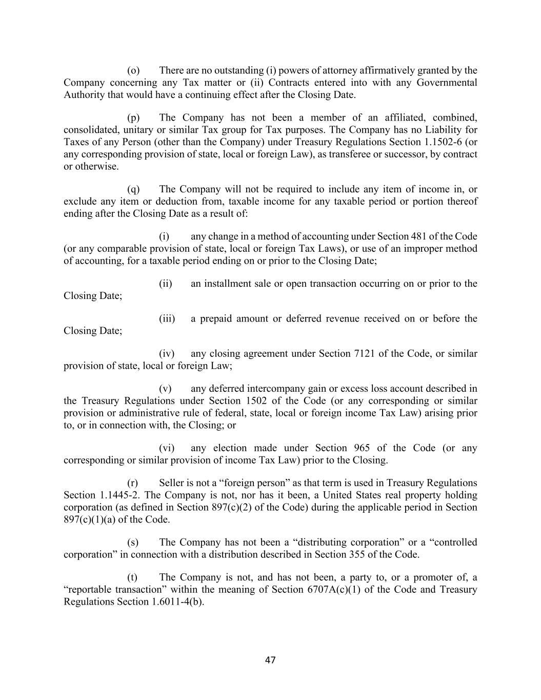 47 (o) There are no outstanding (i) powers of attorney affirmatively granted by the Company concerning any Tax matter or (ii) Contracts entered into with any Governmental Authority that would have a continuing effect after the Closing Date. (p) The Company has not been a member of an affiliated, combined, consolidated, unitary or similar Tax group for Tax purposes. The Company has no Liability for Taxes of any Person (other than the Company) under Treasury Regulations Section 1.1502-6 (or any corresponding provision of state, local or foreign Law), as transferee or successor, by contract or otherwise. (q) The Company will not be required to include any item of income in, or exclude any item or deduction from, taxable income for any taxable period or portion thereof ending after the Closing Date as a result of: (i) any change in a method of accounting under Section 481 of the Code (or any comparable provision of state, local or foreign Tax Laws), or use of an improper method of accounting, for a taxable period ending on or prior to the Closing Date; (ii) an installment sale or open transaction occurring on or prior to the Closing Date; (iii) a prepaid amount or deferred revenue received on or before the Closing Date; (iv) any closing agreement under Section 7121 of the Code, or similar provision of state, local or foreign Law; (v) any deferred intercompany gain or excess loss account described in the Treasury Regulations under Section 1502 of the Code (or any corresponding or similar provision or administrative rule of federal, state, local or foreign income Tax Law) arising prior to, or in connection with, the Closing; or (vi) any election made under Section 965 of the Code (or any corresponding or similar provision of income Tax Law) prior to the Closing. (r) Seller is not a “foreign person” as that term is used in Treasury Regulations Section 1.1445-2. The Company is not, nor has it been, a United States real property holding corporation (as defined in Section 897(c)(2) of the Code) during the applicable period in Section 897(c)(1)(a) of the Code. (s) The Company has not been a “distributing corporation” or a “controlled corporation” in connection with a distribution described in Section 355 of the Code. (t) The Company is not, and has not been, a party to, or a promoter of, a “reportable transaction” within the meaning of Section 6707A(c)(1) of the Code and Treasury Regulations Section 1.6011-4(b).