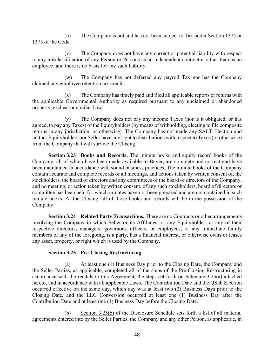 48 (u) The Company is not and has not been subject to Tax under Section 1374 or 1375 of the Code. (v) The Company does not have any current or potential liability with respect to any misclassification of any Person or Persons as an independent contractor rather than as an employee, and there is no basis for any such liability. (w) The Company has not deferred any payroll Tax nor has the Company claimed any employee retention tax credit. (x) The Company has timely paid and filed all applicable reports or returns with the applicable Governmental Authority as required pursuant to any unclaimed or abandoned property, escheat or similar Law. (y) The Company does not pay any income Taxes (nor is it obligated, or has agreed, to pay any Taxes) of the Equityholders (by means of withholding, electing to file composite returns in any jurisdiction, or otherwise). The Company has not made any SALT Election and neither Equityholders nor Seller have any right to distributions with respect to Taxes (or otherwise) from the Company that will survive the Closing. Section 3.23 Books and Records. The minute books and equity record books of the Company, all of which have been made available to Buyer, are complete and correct and have been maintained in accordance with sound business practices. The minute books of the Company contain accurate and complete records of all meetings, and actions taken by written consent of, the stockholders, the board of directors and any committees of the board of directors of the Company, and no meeting, or action taken by written consent, of any such stockholders, board of directors or committee has been held for which minutes have not been prepared and are not contained in such minute books. At the Closing, all of those books and records will be in the possession of the Company. Section 3.24 Related Party Transactions. There are no Contracts or other arrangements involving the Company in which Seller or its Affiliates, or any Equityholder, or any of their respective directors, managers, governors, officers, or employees, or any immediate family members of any of the foregoing, is a party, has a financial interest, or otherwise owns or leases any asset, property, or right which is used by the Company. Section 3.25 Pre-Closing Restructuring. (a) At least one (1) Business Day prior to the Closing Date, the Company and the Seller Parties, as applicable, completed all of the steps of the Pre-Closing Restructuring in accordance with the recitals to this Agreement, the steps set forth on Schedule 3.25(a) attached hereto, and in accordance with all applicable Laws. The Contribution Date and the QSub Election occurred effective on the same day, which day was at least two (2) Business Days prior to the Closing Date, and the LLC Conversion occurred at least one (1) Business Day after the Contribution Date and at least one (1) Business Day before the Closing Date. (b) Section 3.25(b) of the Disclosure Schedule sets forth a list of all material agreements entered into by the Seller Parties, the Company and any other Person, as applicable, in