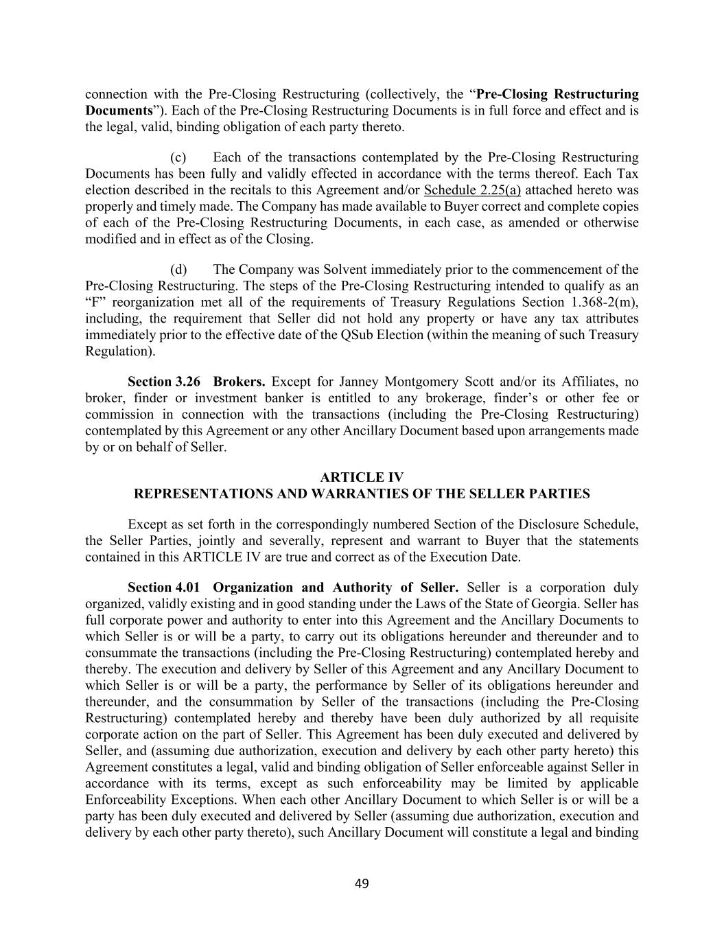 49 connection with the Pre-Closing Restructuring (collectively, the “Pre-Closing Restructuring Documents”). Each of the Pre-Closing Restructuring Documents is in full force and effect and is the legal, valid, binding obligation of each party thereto. (c) Each of the transactions contemplated by the Pre-Closing Restructuring Documents has been fully and validly effected in accordance with the terms thereof. Each Tax election described in the recitals to this Agreement and/or Schedule 2.25(a) attached hereto was properly and timely made. The Company has made available to Buyer correct and complete copies of each of the Pre-Closing Restructuring Documents, in each case, as amended or otherwise modified and in effect as of the Closing. (d) The Company was Solvent immediately prior to the commencement of the Pre-Closing Restructuring. The steps of the Pre-Closing Restructuring intended to qualify as an “F” reorganization met all of the requirements of Treasury Regulations Section 1.368-2(m), including, the requirement that Seller did not hold any property or have any tax attributes immediately prior to the effective date of the QSub Election (within the meaning of such Treasury Regulation). Section 3.26 Brokers. Except for Janney Montgomery Scott and/or its Affiliates, no broker, finder or investment banker is entitled to any brokerage, finder’s or other fee or commission in connection with the transactions (including the Pre-Closing Restructuring) contemplated by this Agreement or any other Ancillary Document based upon arrangements made by or on behalf of Seller. ARTICLE IV REPRESENTATIONS AND WARRANTIES OF THE SELLER PARTIES Except as set forth in the correspondingly numbered Section of the Disclosure Schedule, the Seller Parties, jointly and severally, represent and warrant to Buyer that the statements contained in this ARTICLE IV are true and correct as of the Execution Date. Section 4.01 Organization and Authority of Seller. Seller is a corporation duly organized, validly existing and in good standing under the Laws of the State of Georgia. Seller has full corporate power and authority to enter into this Agreement and the Ancillary Documents to which Seller is or will be a party, to carry out its obligations hereunder and thereunder and to consummate the transactions (including the Pre-Closing Restructuring) contemplated hereby and thereby. The execution and delivery by Seller of this Agreement and any Ancillary Document to which Seller is or will be a party, the performance by Seller of its obligations hereunder and thereunder, and the consummation by Seller of the transactions (including the Pre-Closing Restructuring) contemplated hereby and thereby have been duly authorized by all requisite corporate action on the part of Seller. This Agreement has been duly executed and delivered by Seller, and (assuming due authorization, execution and delivery by each other party hereto) this Agreement constitutes a legal, valid and binding obligation of Seller enforceable against Seller in accordance with its terms, except as such enforceability may be limited by applicable Enforceability Exceptions. When each other Ancillary Document to which Seller is or will be a party has been duly executed and delivered by Seller (assuming due authorization, execution and delivery by each other party thereto), such Ancillary Document will constitute a legal and binding