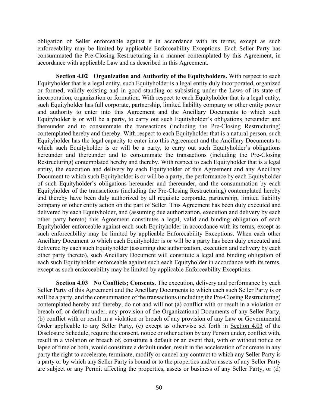 50 obligation of Seller enforceable against it in accordance with its terms, except as such enforceability may be limited by applicable Enforceability Exceptions. Each Seller Party has consummated the Pre-Closing Restructuring in a manner contemplated by this Agreement, in accordance with applicable Law and as described in this Agreement. Section 4.02 Organization and Authority of the Equityholders. With respect to each Equityholder that is a legal entity, such Equityholder is a legal entity duly incorporated, organized or formed, validly existing and in good standing or subsisting under the Laws of its state of incorporation, organization or formation. With respect to each Equityholder that is a legal entity, such Equityholder has full corporate, partnership, limited liability company or other entity power and authority to enter into this Agreement and the Ancillary Documents to which such Equityholder is or will be a party, to carry out such Equityholder’s obligations hereunder and thereunder and to consummate the transactions (including the Pre-Closing Restructuring) contemplated hereby and thereby. With respect to each Equityholder that is a natural person, such Equityholder has the legal capacity to enter into this Agreement and the Ancillary Documents to which such Equityholder is or will be a party, to carry out such Equityholder’s obligations hereunder and thereunder and to consummate the transactions (including the Pre-Closing Restructuring) contemplated hereby and thereby. With respect to each Equityholder that is a legal entity, the execution and delivery by each Equityholder of this Agreement and any Ancillary Document to which such Equityholder is or will be a party, the performance by each Equityholder of such Equityholder’s obligations hereunder and thereunder, and the consummation by each Equityholder of the transactions (including the Pre-Closing Restructuring) contemplated hereby and thereby have been duly authorized by all requisite corporate, partnership, limited liability company or other entity action on the part of Seller. This Agreement has been duly executed and delivered by each Equityholder, and (assuming due authorization, execution and delivery by each other party hereto) this Agreement constitutes a legal, valid and binding obligation of each Equityholder enforceable against each such Equityholder in accordance with its terms, except as such enforceability may be limited by applicable Enforceability Exceptions. When each other Ancillary Document to which each Equityholder is or will be a party has been duly executed and delivered by each such Equityholder (assuming due authorization, execution and delivery by each other party thereto), such Ancillary Document will constitute a legal and binding obligation of each such Equityholder enforceable against such each Equityholder in accordance with its terms, except as such enforceability may be limited by applicable Enforceability Exceptions. Section 4.03 No Conflicts; Consents. The execution, delivery and performance by each Seller Party of this Agreement and the Ancillary Documents to which each such Seller Party is or will be a party, and the consummation of the transactions (including the Pre-Closing Restructuring) contemplated hereby and thereby, do not and will not (a) conflict with or result in a violation or breach of, or default under, any provision of the Organizational Documents of any Seller Party, (b) conflict with or result in a violation or breach of any provision of any Law or Governmental Order applicable to any Seller Party, (c) except as otherwise set forth in Section 4.03 of the Disclosure Schedule, require the consent, notice or other action by any Person under, conflict with, result in a violation or breach of, constitute a default or an event that, with or without notice or lapse of time or both, would constitute a default under, result in the acceleration of or create in any party the right to accelerate, terminate, modify or cancel any contract to which any Seller Party is a party or by which any Seller Party is bound or to the properties and/or assets of any Seller Party are subject or any Permit affecting the properties, assets or business of any Seller Party, or (d)
