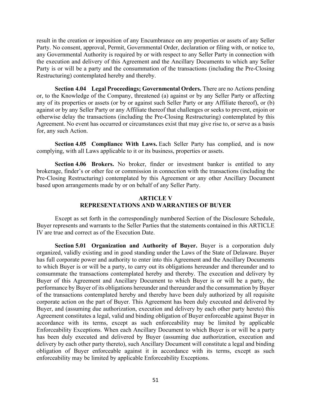 51 result in the creation or imposition of any Encumbrance on any properties or assets of any Seller Party. No consent, approval, Permit, Governmental Order, declaration or filing with, or notice to, any Governmental Authority is required by or with respect to any Seller Party in connection with the execution and delivery of this Agreement and the Ancillary Documents to which any Seller Party is or will be a party and the consummation of the transactions (including the Pre-Closing Restructuring) contemplated hereby and thereby. Section 4.04 Legal Proceedings; Governmental Orders. There are no Actions pending or, to the Knowledge of the Company, threatened (a) against or by any Seller Party or affecting any of its properties or assets (or by or against such Seller Party or any Affiliate thereof), or (b) against or by any Seller Party or any Affiliate thereof that challenges or seeks to prevent, enjoin or otherwise delay the transactions (including the Pre-Closing Restructuring) contemplated by this Agreement. No event has occurred or circumstances exist that may give rise to, or serve as a basis for, any such Action. Section 4.05 Compliance With Laws. Each Seller Party has complied, and is now complying, with all Laws applicable to it or its business, properties or assets. Section 4.06 Brokers. No broker, finder or investment banker is entitled to any brokerage, finder’s or other fee or commission in connection with the transactions (including the Pre-Closing Restructuring) contemplated by this Agreement or any other Ancillary Document based upon arrangements made by or on behalf of any Seller Party. ARTICLE V REPRESENTATIONS AND WARRANTIES OF BUYER Except as set forth in the correspondingly numbered Section of the Disclosure Schedule, Buyer represents and warrants to the Seller Parties that the statements contained in this ARTICLE IV are true and correct as of the Execution Date. Section 5.01 Organization and Authority of Buyer. Buyer is a corporation duly organized, validly existing and in good standing under the Laws of the State of Delaware. Buyer has full corporate power and authority to enter into this Agreement and the Ancillary Documents to which Buyer is or will be a party, to carry out its obligations hereunder and thereunder and to consummate the transactions contemplated hereby and thereby. The execution and delivery by Buyer of this Agreement and Ancillary Document to which Buyer is or will be a party, the performance by Buyer of its obligations hereunder and thereunder and the consummation by Buyer of the transactions contemplated hereby and thereby have been duly authorized by all requisite corporate action on the part of Buyer. This Agreement has been duly executed and delivered by Buyer, and (assuming due authorization, execution and delivery by each other party hereto) this Agreement constitutes a legal, valid and binding obligation of Buyer enforceable against Buyer in accordance with its terms, except as such enforceability may be limited by applicable Enforceability Exceptions. When each Ancillary Document to which Buyer is or will be a party has been duly executed and delivered by Buyer (assuming due authorization, execution and delivery by each other party thereto), such Ancillary Document will constitute a legal and binding obligation of Buyer enforceable against it in accordance with its terms, except as such enforceability may be limited by applicable Enforceability Exceptions.
