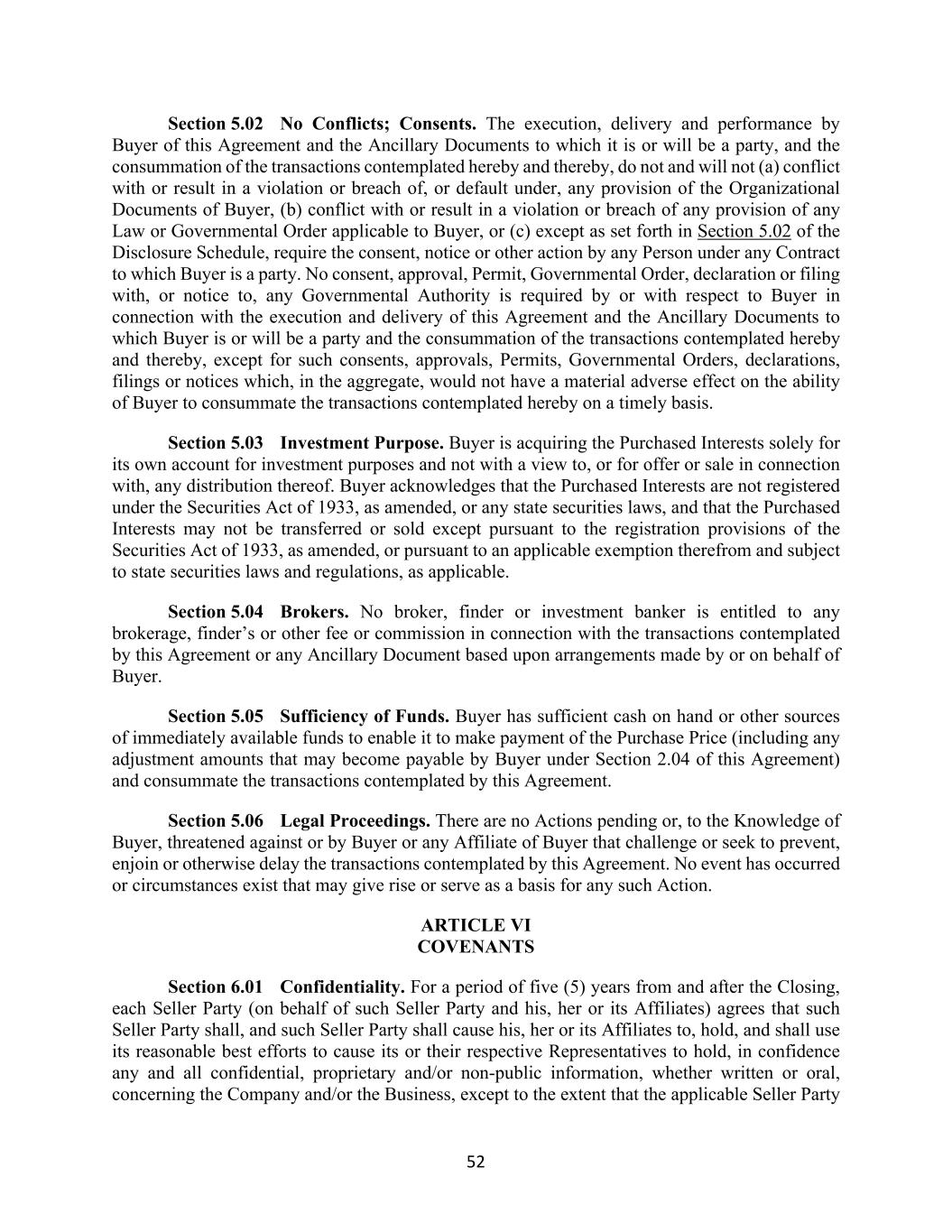52 Section 5.02 No Conflicts; Consents. The execution, delivery and performance by Buyer of this Agreement and the Ancillary Documents to which it is or will be a party, and the consummation of the transactions contemplated hereby and thereby, do not and will not (a) conflict with or result in a violation or breach of, or default under, any provision of the Organizational Documents of Buyer, (b) conflict with or result in a violation or breach of any provision of any Law or Governmental Order applicable to Buyer, or (c) except as set forth in Section 5.02 of the Disclosure Schedule, require the consent, notice or other action by any Person under any Contract to which Buyer is a party. No consent, approval, Permit, Governmental Order, declaration or filing with, or notice to, any Governmental Authority is required by or with respect to Buyer in connection with the execution and delivery of this Agreement and the Ancillary Documents to which Buyer is or will be a party and the consummation of the transactions contemplated hereby and thereby, except for such consents, approvals, Permits, Governmental Orders, declarations, filings or notices which, in the aggregate, would not have a material adverse effect on the ability of Buyer to consummate the transactions contemplated hereby on a timely basis. Section 5.03 Investment Purpose. Buyer is acquiring the Purchased Interests solely for its own account for investment purposes and not with a view to, or for offer or sale in connection with, any distribution thereof. Buyer acknowledges that the Purchased Interests are not registered under the Securities Act of 1933, as amended, or any state securities laws, and that the Purchased Interests may not be transferred or sold except pursuant to the registration provisions of the Securities Act of 1933, as amended, or pursuant to an applicable exemption therefrom and subject to state securities laws and regulations, as applicable. Section 5.04 Brokers. No broker, finder or investment banker is entitled to any brokerage, finder’s or other fee or commission in connection with the transactions contemplated by this Agreement or any Ancillary Document based upon arrangements made by or on behalf of Buyer. Section 5.05 Sufficiency of Funds. Buyer has sufficient cash on hand or other sources of immediately available funds to enable it to make payment of the Purchase Price (including any adjustment amounts that may become payable by Buyer under Section 2.04 of this Agreement) and consummate the transactions contemplated by this Agreement. Section 5.06 Legal Proceedings. There are no Actions pending or, to the Knowledge of Buyer, threatened against or by Buyer or any Affiliate of Buyer that challenge or seek to prevent, enjoin or otherwise delay the transactions contemplated by this Agreement. No event has occurred or circumstances exist that may give rise or serve as a basis for any such Action. ARTICLE VI COVENANTS Section 6.01 Confidentiality. For a period of five (5) years from and after the Closing, each Seller Party (on behalf of such Seller Party and his, her or its Affiliates) agrees that such Seller Party shall, and such Seller Party shall cause his, her or its Affiliates to, hold, and shall use its reasonable best efforts to cause its or their respective Representatives to hold, in confidence any and all confidential, proprietary and/or non-public information, whether written or oral, concerning the Company and/or the Business, except to the extent that the applicable Seller Party