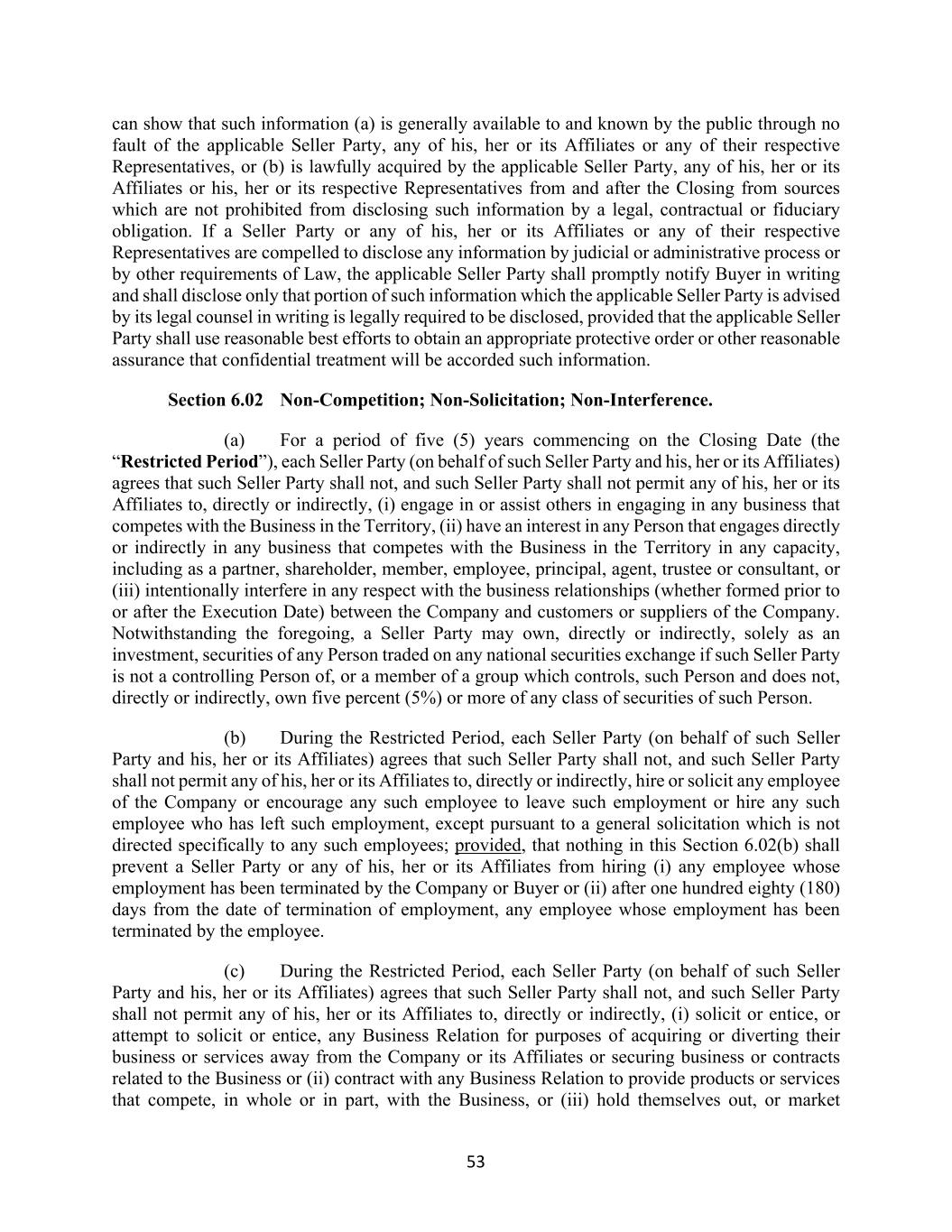 53 can show that such information (a) is generally available to and known by the public through no fault of the applicable Seller Party, any of his, her or its Affiliates or any of their respective Representatives, or (b) is lawfully acquired by the applicable Seller Party, any of his, her or its Affiliates or his, her or its respective Representatives from and after the Closing from sources which are not prohibited from disclosing such information by a legal, contractual or fiduciary obligation. If a Seller Party or any of his, her or its Affiliates or any of their respective Representatives are compelled to disclose any information by judicial or administrative process or by other requirements of Law, the applicable Seller Party shall promptly notify Buyer in writing and shall disclose only that portion of such information which the applicable Seller Party is advised by its legal counsel in writing is legally required to be disclosed, provided that the applicable Seller Party shall use reasonable best efforts to obtain an appropriate protective order or other reasonable assurance that confidential treatment will be accorded such information. Section 6.02 Non-Competition; Non-Solicitation; Non-Interference. (a) For a period of five (5) years commencing on the Closing Date (the “Restricted Period”), each Seller Party (on behalf of such Seller Party and his, her or its Affiliates) agrees that such Seller Party shall not, and such Seller Party shall not permit any of his, her or its Affiliates to, directly or indirectly, (i) engage in or assist others in engaging in any business that competes with the Business in the Territory, (ii) have an interest in any Person that engages directly or indirectly in any business that competes with the Business in the Territory in any capacity, including as a partner, shareholder, member, employee, principal, agent, trustee or consultant, or (iii) intentionally interfere in any respect with the business relationships (whether formed prior to or after the Execution Date) between the Company and customers or suppliers of the Company. Notwithstanding the foregoing, a Seller Party may own, directly or indirectly, solely as an investment, securities of any Person traded on any national securities exchange if such Seller Party is not a controlling Person of, or a member of a group which controls, such Person and does not, directly or indirectly, own five percent (5%) or more of any class of securities of such Person. (b) During the Restricted Period, each Seller Party (on behalf of such Seller Party and his, her or its Affiliates) agrees that such Seller Party shall not, and such Seller Party shall not permit any of his, her or its Affiliates to, directly or indirectly, hire or solicit any employee of the Company or encourage any such employee to leave such employment or hire any such employee who has left such employment, except pursuant to a general solicitation which is not directed specifically to any such employees; provided, that nothing in this Section 6.02(b) shall prevent a Seller Party or any of his, her or its Affiliates from hiring (i) any employee whose employment has been terminated by the Company or Buyer or (ii) after one hundred eighty (180) days from the date of termination of employment, any employee whose employment has been terminated by the employee. (c) During the Restricted Period, each Seller Party (on behalf of such Seller Party and his, her or its Affiliates) agrees that such Seller Party shall not, and such Seller Party shall not permit any of his, her or its Affiliates to, directly or indirectly, (i) solicit or entice, or attempt to solicit or entice, any Business Relation for purposes of acquiring or diverting their business or services away from the Company or its Affiliates or securing business or contracts related to the Business or (ii) contract with any Business Relation to provide products or services that compete, in whole or in part, with the Business, or (iii) hold themselves out, or market