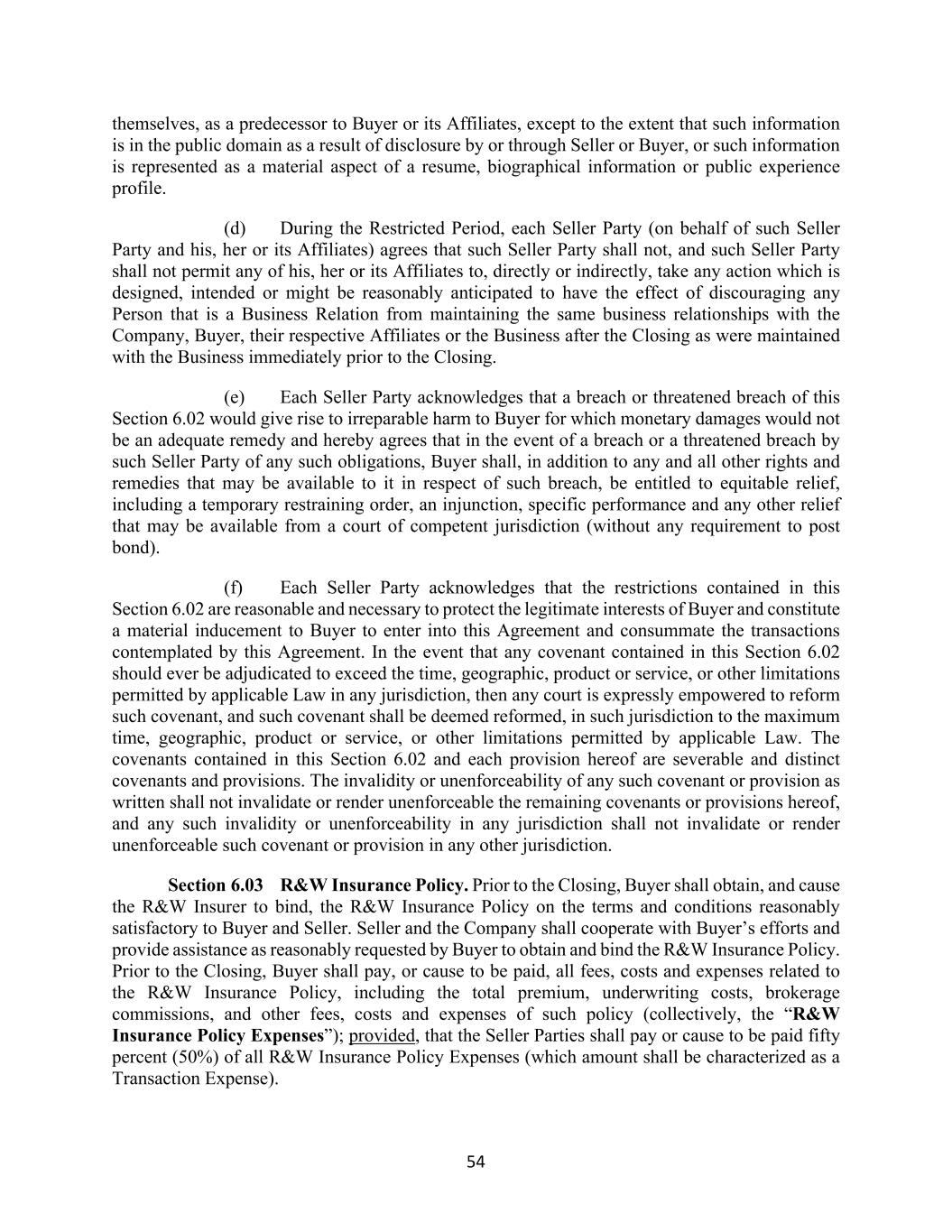 54 themselves, as a predecessor to Buyer or its Affiliates, except to the extent that such information is in the public domain as a result of disclosure by or through Seller or Buyer, or such information is represented as a material aspect of a resume, biographical information or public experience profile. (d) During the Restricted Period, each Seller Party (on behalf of such Seller Party and his, her or its Affiliates) agrees that such Seller Party shall not, and such Seller Party shall not permit any of his, her or its Affiliates to, directly or indirectly, take any action which is designed, intended or might be reasonably anticipated to have the effect of discouraging any Person that is a Business Relation from maintaining the same business relationships with the Company, Buyer, their respective Affiliates or the Business after the Closing as were maintained with the Business immediately prior to the Closing. (e) Each Seller Party acknowledges that a breach or threatened breach of this Section 6.02 would give rise to irreparable harm to Buyer for which monetary damages would not be an adequate remedy and hereby agrees that in the event of a breach or a threatened breach by such Seller Party of any such obligations, Buyer shall, in addition to any and all other rights and remedies that may be available to it in respect of such breach, be entitled to equitable relief, including a temporary restraining order, an injunction, specific performance and any other relief that may be available from a court of competent jurisdiction (without any requirement to post bond). (f) Each Seller Party acknowledges that the restrictions contained in this Section 6.02 are reasonable and necessary to protect the legitimate interests of Buyer and constitute a material inducement to Buyer to enter into this Agreement and consummate the transactions contemplated by this Agreement. In the event that any covenant contained in this Section 6.02 should ever be adjudicated to exceed the time, geographic, product or service, or other limitations permitted by applicable Law in any jurisdiction, then any court is expressly empowered to reform such covenant, and such covenant shall be deemed reformed, in such jurisdiction to the maximum time, geographic, product or service, or other limitations permitted by applicable Law. The covenants contained in this Section 6.02 and each provision hereof are severable and distinct covenants and provisions. The invalidity or unenforceability of any such covenant or provision as written shall not invalidate or render unenforceable the remaining covenants or provisions hereof, and any such invalidity or unenforceability in any jurisdiction shall not invalidate or render unenforceable such covenant or provision in any other jurisdiction. Section 6.03 R&W Insurance Policy. Prior to the Closing, Buyer shall obtain, and cause the R&W Insurer to bind, the R&W Insurance Policy on the terms and conditions reasonably satisfactory to Buyer and Seller. Seller and the Company shall cooperate with Buyer’s efforts and provide assistance as reasonably requested by Buyer to obtain and bind the R&W Insurance Policy. Prior to the Closing, Buyer shall pay, or cause to be paid, all fees, costs and expenses related to the R&W Insurance Policy, including the total premium, underwriting costs, brokerage commissions, and other fees, costs and expenses of such policy (collectively, the “R&W Insurance Policy Expenses”); provided, that the Seller Parties shall pay or cause to be paid fifty percent (50%) of all R&W Insurance Policy Expenses (which amount shall be characterized as a Transaction Expense).