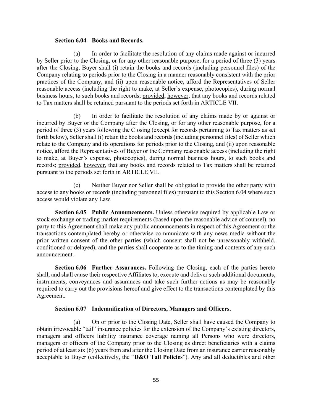55 Section 6.04 Books and Records. (a) In order to facilitate the resolution of any claims made against or incurred by Seller prior to the Closing, or for any other reasonable purpose, for a period of three (3) years after the Closing, Buyer shall (i) retain the books and records (including personnel files) of the Company relating to periods prior to the Closing in a manner reasonably consistent with the prior practices of the Company, and (ii) upon reasonable notice, afford the Representatives of Seller reasonable access (including the right to make, at Seller’s expense, photocopies), during normal business hours, to such books and records; provided, however, that any books and records related to Tax matters shall be retained pursuant to the periods set forth in ARTICLE VII. (b) In order to facilitate the resolution of any claims made by or against or incurred by Buyer or the Company after the Closing, or for any other reasonable purpose, for a period of three (3) years following the Closing (except for records pertaining to Tax matters as set forth below), Seller shall (i) retain the books and records (including personnel files) of Seller which relate to the Company and its operations for periods prior to the Closing, and (ii) upon reasonable notice, afford the Representatives of Buyer or the Company reasonable access (including the right to make, at Buyer’s expense, photocopies), during normal business hours, to such books and records; provided, however, that any books and records related to Tax matters shall be retained pursuant to the periods set forth in ARTICLE VII. (c) Neither Buyer nor Seller shall be obligated to provide the other party with access to any books or records (including personnel files) pursuant to this Section 6.04 where such access would violate any Law. Section 6.05 Public Announcements. Unless otherwise required by applicable Law or stock exchange or trading market requirements (based upon the reasonable advice of counsel), no party to this Agreement shall make any public announcements in respect of this Agreement or the transactions contemplated hereby or otherwise communicate with any news media without the prior written consent of the other parties (which consent shall not be unreasonably withheld, conditioned or delayed), and the parties shall cooperate as to the timing and contents of any such announcement. Section 6.06 Further Assurances. Following the Closing, each of the parties hereto shall, and shall cause their respective Affiliates to, execute and deliver such additional documents, instruments, conveyances and assurances and take such further actions as may be reasonably required to carry out the provisions hereof and give effect to the transactions contemplated by this Agreement. Section 6.07 Indemnification of Directors, Managers and Officers. (a) On or prior to the Closing Date, Seller shall have caused the Company to obtain irrevocable “tail” insurance policies for the extension of the Company’s existing directors, managers and officers liability insurance coverage naming all Persons who were directors, managers or officers of the Company prior to the Closing as direct beneficiaries with a claims period of at least six (6) years from and after the Closing Date from an insurance carrier reasonably acceptable to Buyer (collectively, the “D&O Tail Policies”). Any and all deductibles and other