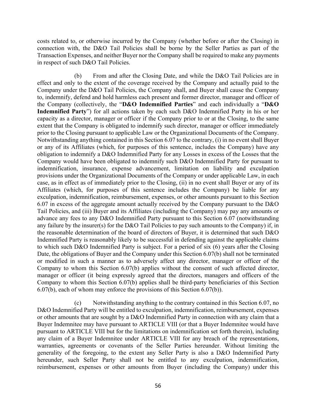 56 costs related to, or otherwise incurred by the Company (whether before or after the Closing) in connection with, the D&O Tail Policies shall be borne by the Seller Parties as part of the Transaction Expenses, and neither Buyer nor the Company shall be required to make any payments in respect of such D&O Tail Policies. (b) From and after the Closing Date, and while the D&O Tail Policies are in effect and only to the extent of the coverage received by the Company and actually paid to the Company under the D&O Tail Policies, the Company shall, and Buyer shall cause the Company to, indemnify, defend and hold harmless each present and former director, manager and officer of the Company (collectively, the “D&O Indemnified Parties” and each individually a “D&O Indemnified Party”) for all actions taken by each such D&O Indemnified Party in his or her capacity as a director, manager or officer if the Company prior to or at the Closing, to the same extent that the Company is obligated to indemnify such director, manager or officer immediately prior to the Closing pursuant to applicable Law or the Organizational Documents of the Company. Notwithstanding anything contained in this Section 6.07 to the contrary, (i) in no event shall Buyer or any of its Affiliates (which, for purposes of this sentence, includes the Company) have any obligation to indemnify a D&O Indemnified Party for any Losses in excess of the Losses that the Company would have been obligated to indemnify such D&O Indemnified Party for pursuant to indemnification, insurance, expense advancement, limitation on liability and exculpation provisions under the Organizational Documents of the Company or under applicable Law, in each case, as in effect as of immediately prior to the Closing, (ii) in no event shall Buyer or any of its Affiliates (which, for purposes of this sentence includes the Company) be liable for any exculpation, indemnification, reimbursement, expenses, or other amounts pursuant to this Section 6.07 in excess of the aggregate amount actually received by the Company pursuant to the D&O Tail Policies, and (iii) Buyer and its Affiliates (including the Company) may pay any amounts or advance any fees to any D&O Indemnified Party pursuant to this Section 6.07 (notwithstanding any failure by the insurer(s) for the D&O Tail Policies to pay such amounts to the Company) if, in the reasonable determination of the board of directors of Buyer, it is determined that such D&O Indemnified Party is reasonably likely to be successful in defending against the applicable claims to which such D&O Indemnified Party is subject. For a period of six (6) years after the Closing Date, the obligations of Buyer and the Company under this Section 6.07(b) shall not be terminated or modified in such a manner as to adversely affect any director, manager or officer of the Company to whom this Section 6.07(b) applies without the consent of such affected director, manager or officer (it being expressly agreed that the directors, managers and officers of the Company to whom this Section 6.07(b) applies shall be third-party beneficiaries of this Section 6.07(b), each of whom may enforce the provisions of this Section 6.07(b)). (c) Notwithstanding anything to the contrary contained in this Section 6.07, no D&O Indemnified Party will be entitled to exculpation, indemnification, reimbursement, expenses or other amounts that are sought by a D&O Indemnified Party in connection with any claim that a Buyer Indemnitee may have pursuant to ARTICLE VIII (or that a Buyer Indemnitee would have pursuant to ARTICLE VIII but for the limitations on indemnification set forth therein), including any claim of a Buyer Indemnitee under ARTICLE VIII for any breach of the representations, warranties, agreements or covenants of the Seller Parties hereunder. Without limiting the generality of the foregoing, to the extent any Seller Party is also a D&O Indemnified Party hereunder, such Seller Party shall not be entitled to any exculpation, indemnification, reimbursement, expenses or other amounts from Buyer (including the Company) under this