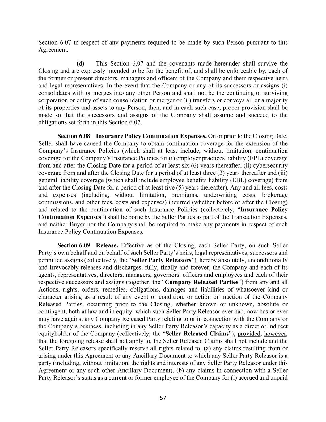 57 Section 6.07 in respect of any payments required to be made by such Person pursuant to this Agreement. (d) This Section 6.07 and the covenants made hereunder shall survive the Closing and are expressly intended to be for the benefit of, and shall be enforceable by, each of the former or present directors, managers and officers of the Company and their respective heirs and legal representatives. In the event that the Company or any of its successors or assigns (i) consolidates with or merges into any other Person and shall not be the continuing or surviving corporation or entity of such consolidation or merger or (ii) transfers or conveys all or a majority of its properties and assets to any Person, then, and in each such case, proper provision shall be made so that the successors and assigns of the Company shall assume and succeed to the obligations set forth in this Section 6.07. Section 6.08 Insurance Policy Continuation Expenses. On or prior to the Closing Date, Seller shall have caused the Company to obtain continuation coverage for the extension of the Company’s Insurance Policies (which shall at least include, without limitation, continuation coverage for the Company’s Insurance Policies for (i) employer practices liability (EPL) coverage from and after the Closing Date for a period of at least six (6) years thereafter, (ii) cybersecurity coverage from and after the Closing Date for a period of at least three (3) years thereafter and (iii) general liability coverage (which shall include employee benefits liability (EBL) coverage) from and after the Closing Date for a period of at least five (5) years thereafter). Any and all fees, costs and expenses (including, without limitation, premiums, underwriting costs, brokerage commissions, and other fees, costs and expenses) incurred (whether before or after the Closing) and related to the continuation of such Insurance Policies (collectively, “Insurance Policy Continuation Expenses”) shall be borne by the Seller Parties as part of the Transaction Expenses, and neither Buyer nor the Company shall be required to make any payments in respect of such Insurance Policy Continuation Expenses. Section 6.09 Release. Effective as of the Closing, each Seller Party, on such Seller Party’s own behalf and on behalf of such Seller Party’s heirs, legal representatives, successors and permitted assigns (collectively, the “Seller Party Releasors”), hereby absolutely, unconditionally and irrevocably releases and discharges, fully, finally and forever, the Company and each of its agents, representatives, directors, managers, governors, officers and employees and each of their respective successors and assigns (together, the “Company Released Parties”) from any and all Actions, rights, orders, remedies, obligations, damages and liabilities of whatsoever kind or character arising as a result of any event or condition, or action or inaction of the Company Released Parties, occurring prior to the Closing, whether known or unknown, absolute or contingent, both at law and in equity, which such Seller Party Releasor ever had, now has or ever may have against any Company Released Party relating to or in connection with the Company or the Company’s business, including in any Seller Party Releasor’s capacity as a direct or indirect equityholder of the Company (collectively, the “Seller Released Claims”); provided, however, that the foregoing release shall not apply to, the Seller Released Claims shall not include and the Seller Party Releasors specifically reserve all rights related to, (a) any claims resulting from or arising under this Agreement or any Ancillary Document to which any Seller Party Releasor is a party (including, without limitation, the rights and interests of any Seller Party Releasor under this Agreement or any such other Ancillary Document), (b) any claims in connection with a Seller Party Releasor’s status as a current or former employee of the Company for (i) accrued and unpaid