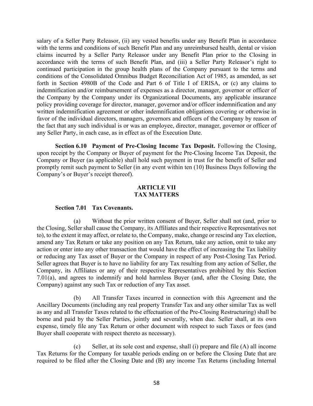 58 salary of a Seller Party Releasor, (ii) any vested benefits under any Benefit Plan in accordance with the terms and conditions of such Benefit Plan and any unreimbursed health, dental or vision claims incurred by a Seller Party Releasor under any Benefit Plan prior to the Closing in accordance with the terms of such Benefit Plan, and (iii) a Seller Party Releasor’s right to continued participation in the group health plans of the Company pursuant to the terms and conditions of the Consolidated Omnibus Budget Reconciliation Act of 1985, as amended, as set forth in Section 4980B of the Code and Part 6 of Title I of ERISA, or (c) any claims to indemnification and/or reimbursement of expenses as a director, manager, governor or officer of the Company by the Company under its Organizational Documents, any applicable insurance policy providing coverage for director, manager, governor and/or officer indemnification and any written indemnification agreement or other indemnification obligations covering or otherwise in favor of the individual directors, managers, governors and officers of the Company by reason of the fact that any such individual is or was an employee, director, manager, governor or officer of any Seller Party, in each case, as in effect as of the Execution Date. Section 6.10 Payment of Pre-Closing Income Tax Deposit. Following the Closing, upon receipt by the Company or Buyer of payment for the Pre-Closing Income Tax Deposit, the Company or Buyer (as applicable) shall hold such payment in trust for the benefit of Seller and promptly remit such payment to Seller (in any event within ten (10) Business Days following the Company’s or Buyer’s receipt thereof). ARTICLE VII TAX MATTERS Section 7.01 Tax Covenants. (a) Without the prior written consent of Buyer, Seller shall not (and, prior to the Closing, Seller shall cause the Company, its Affiliates and their respective Representatives not to), to the extent it may affect, or relate to, the Company, make, change or rescind any Tax election, amend any Tax Return or take any position on any Tax Return, take any action, omit to take any action or enter into any other transaction that would have the effect of increasing the Tax liability or reducing any Tax asset of Buyer or the Company in respect of any Post-Closing Tax Period. Seller agrees that Buyer is to have no liability for any Tax resulting from any action of Seller, the Company, its Affiliates or any of their respective Representatives prohibited by this Section 7.01(a), and agrees to indemnify and hold harmless Buyer (and, after the Closing Date, the Company) against any such Tax or reduction of any Tax asset. (b) All Transfer Taxes incurred in connection with this Agreement and the Ancillary Documents (including any real property Transfer Tax and any other similar Tax as well as any and all Transfer Taxes related to the effectuation of the Pre-Closing Restructuring) shall be borne and paid by the Seller Parties, jointly and severally, when due. Seller shall, at its own expense, timely file any Tax Return or other document with respect to such Taxes or fees (and Buyer shall cooperate with respect thereto as necessary). (c) Seller, at its sole cost and expense, shall (i) prepare and file (A) all income Tax Returns for the Company for taxable periods ending on or before the Closing Date that are required to be filed after the Closing Date and (B) any income Tax Returns (including Internal