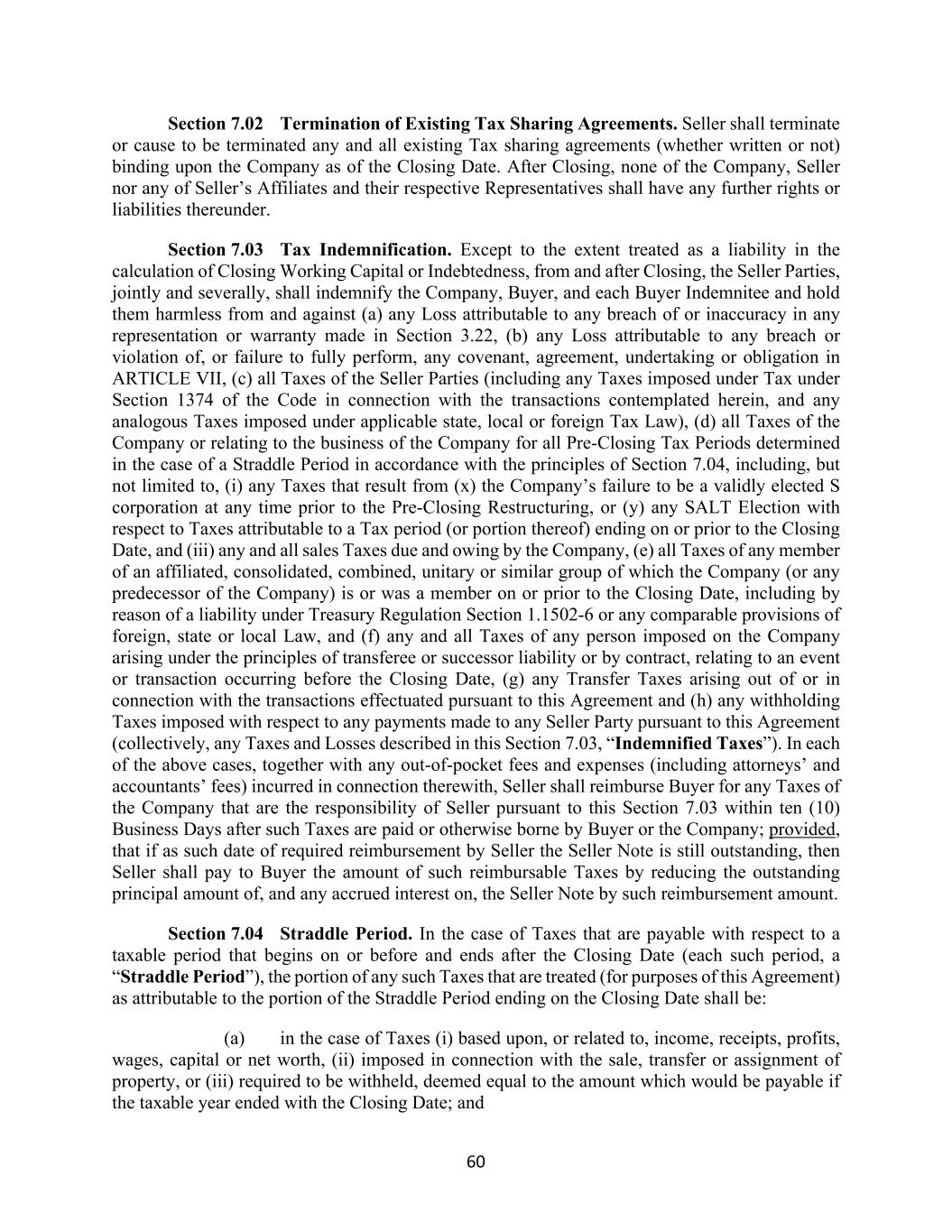 60 Section 7.02 Termination of Existing Tax Sharing Agreements. Seller shall terminate or cause to be terminated any and all existing Tax sharing agreements (whether written or not) binding upon the Company as of the Closing Date. After Closing, none of the Company, Seller nor any of Seller’s Affiliates and their respective Representatives shall have any further rights or liabilities thereunder. Section 7.03 Tax Indemnification. Except to the extent treated as a liability in the calculation of Closing Working Capital or Indebtedness, from and after Closing, the Seller Parties, jointly and severally, shall indemnify the Company, Buyer, and each Buyer Indemnitee and hold them harmless from and against (a) any Loss attributable to any breach of or inaccuracy in any representation or warranty made in Section 3.22, (b) any Loss attributable to any breach or violation of, or failure to fully perform, any covenant, agreement, undertaking or obligation in ARTICLE VII, (c) all Taxes of the Seller Parties (including any Taxes imposed under Tax under Section 1374 of the Code in connection with the transactions contemplated herein, and any analogous Taxes imposed under applicable state, local or foreign Tax Law), (d) all Taxes of the Company or relating to the business of the Company for all Pre-Closing Tax Periods determined in the case of a Straddle Period in accordance with the principles of Section 7.04, including, but not limited to, (i) any Taxes that result from (x) the Company’s failure to be a validly elected S corporation at any time prior to the Pre-Closing Restructuring, or (y) any SALT Election with respect to Taxes attributable to a Tax period (or portion thereof) ending on or prior to the Closing Date, and (iii) any and all sales Taxes due and owing by the Company, (e) all Taxes of any member of an affiliated, consolidated, combined, unitary or similar group of which the Company (or any predecessor of the Company) is or was a member on or prior to the Closing Date, including by reason of a liability under Treasury Regulation Section 1.1502-6 or any comparable provisions of foreign, state or local Law, and (f) any and all Taxes of any person imposed on the Company arising under the principles of transferee or successor liability or by contract, relating to an event or transaction occurring before the Closing Date, (g) any Transfer Taxes arising out of or in connection with the transactions effectuated pursuant to this Agreement and (h) any withholding Taxes imposed with respect to any payments made to any Seller Party pursuant to this Agreement (collectively, any Taxes and Losses described in this Section 7.03, “Indemnified Taxes”). In each of the above cases, together with any out-of-pocket fees and expenses (including attorneys’ and accountants’ fees) incurred in connection therewith, Seller shall reimburse Buyer for any Taxes of the Company that are the responsibility of Seller pursuant to this Section 7.03 within ten (10) Business Days after such Taxes are paid or otherwise borne by Buyer or the Company; provided, that if as such date of required reimbursement by Seller the Seller Note is still outstanding, then Seller shall pay to Buyer the amount of such reimbursable Taxes by reducing the outstanding principal amount of, and any accrued interest on, the Seller Note by such reimbursement amount. Section 7.04 Straddle Period. In the case of Taxes that are payable with respect to a taxable period that begins on or before and ends after the Closing Date (each such period, a “Straddle Period”), the portion of any such Taxes that are treated (for purposes of this Agreement) as attributable to the portion of the Straddle Period ending on the Closing Date shall be: (a) in the case of Taxes (i) based upon, or related to, income, receipts, profits, wages, capital or net worth, (ii) imposed in connection with the sale, transfer or assignment of property, or (iii) required to be withheld, deemed equal to the amount which would be payable if the taxable year ended with the Closing Date; and