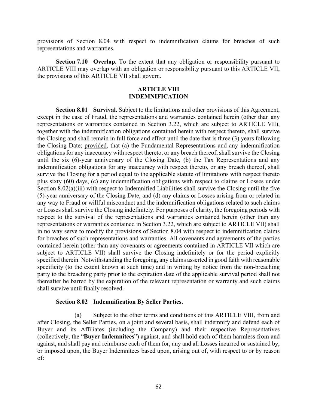 62 provisions of Section 8.04 with respect to indemnification claims for breaches of such representations and warranties. Section 7.10 Overlap. To the extent that any obligation or responsibility pursuant to ARTICLE VIII may overlap with an obligation or responsibility pursuant to this ARTICLE VII, the provisions of this ARTICLE VII shall govern. ARTICLE VIII INDEMNIFICATION Section 8.01 Survival. Subject to the limitations and other provisions of this Agreement, except in the case of Fraud, the representations and warranties contained herein (other than any representations or warranties contained in Section 3.22, which are subject to ARTICLE VII), together with the indemnification obligations contained herein with respect thereto, shall survive the Closing and shall remain in full force and effect until the date that is three (3) years following the Closing Date; provided, that (a) the Fundamental Representations and any indemnification obligations for any inaccuracy with respect thereto, or any breach thereof, shall survive the Closing until the six (6)-year anniversary of the Closing Date, (b) the Tax Representations and any indemnification obligations for any inaccuracy with respect thereto, or any breach thereof, shall survive the Closing for a period equal to the applicable statute of limitations with respect thereto plus sixty (60) days, (c) any indemnification obligations with respect to claims or Losses under Section 8.02(a)(iii) with respect to Indemnified Liabilities shall survive the Closing until the five (5)-year anniversary of the Closing Date, and (d) any claims or Losses arising from or related in any way to Fraud or willful misconduct and the indemnification obligations related to such claims or Losses shall survive the Closing indefinitely. For purposes of clarity, the foregoing periods with respect to the survival of the representations and warranties contained herein (other than any representations or warranties contained in Section 3.22, which are subject to ARTICLE VII) shall in no way serve to modify the provisions of Section 8.04 with respect to indemnification claims for breaches of such representations and warranties. All covenants and agreements of the parties contained herein (other than any covenants or agreements contained in ARTICLE VII which are subject to ARTICLE VII) shall survive the Closing indefinitely or for the period explicitly specified therein. Notwithstanding the foregoing, any claims asserted in good faith with reasonable specificity (to the extent known at such time) and in writing by notice from the non-breaching party to the breaching party prior to the expiration date of the applicable survival period shall not thereafter be barred by the expiration of the relevant representation or warranty and such claims shall survive until finally resolved. Section 8.02 Indemnification By Seller Parties. (a) Subject to the other terms and conditions of this ARTICLE VIII, from and after Closing, the Seller Parties, on a joint and several basis, shall indemnify and defend each of Buyer and its Affiliates (including the Company) and their respective Representatives (collectively, the “Buyer Indemnitees”) against, and shall hold each of them harmless from and against, and shall pay and reimburse each of them for, any and all Losses incurred or sustained by, or imposed upon, the Buyer Indemnitees based upon, arising out of, with respect to or by reason of: