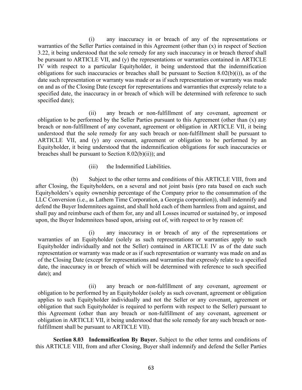 63 (i) any inaccuracy in or breach of any of the representations or warranties of the Seller Parties contained in this Agreement (other than (x) in respect of Section 3.22, it being understood that the sole remedy for any such inaccuracy in or breach thereof shall be pursuant to ARTICLE VII, and (y) the representations or warranties contained in ARTICLE IV with respect to a particular Equityholder, it being understood that the indemnification obligations for such inaccuracies or breaches shall be pursuant to Section 8.02(b)(i)), as of the date such representation or warranty was made or as if such representation or warranty was made on and as of the Closing Date (except for representations and warranties that expressly relate to a specified date, the inaccuracy in or breach of which will be determined with reference to such specified date); (ii) any breach or non-fulfillment of any covenant, agreement or obligation to be performed by the Seller Parties pursuant to this Agreement (other than (x) any breach or non-fulfillment of any covenant, agreement or obligation in ARTICLE VII, it being understood that the sole remedy for any such breach or non-fulfillment shall be pursuant to ARTICLE VII, and (y) any covenant, agreement or obligation to be performed by an Equityholder, it being understood that the indemnification obligations for such inaccuracies or breaches shall be pursuant to Section 8.02(b)(ii)); and (iii) the Indemnified Liabilities. (b) Subject to the other terms and conditions of this ARTICLE VIII, from and after Closing, the Equityholders, on a several and not joint basis (pro rata based on each such Equityholders’s equity ownership percentage of the Company prior to the consummation of the LLC Conversion (i.e., as Lathem Time Corporation, a Georgia corporation)), shall indemnify and defend the Buyer Indemnitees against, and shall hold each of them harmless from and against, and shall pay and reimburse each of them for, any and all Losses incurred or sustained by, or imposed upon, the Buyer Indemnitees based upon, arising out of, with respect to or by reason of: (i) any inaccuracy in or breach of any of the representations or warranties of an Equityholder (solely as such representations or warranties apply to such Equityholder individually and not the Seller) contained in ARTICLE IV as of the date such representation or warranty was made or as if such representation or warranty was made on and as of the Closing Date (except for representations and warranties that expressly relate to a specified date, the inaccuracy in or breach of which will be determined with reference to such specified date); and (ii) any breach or non-fulfillment of any covenant, agreement or obligation to be performed by an Equityholder (solely as such covenant, agreement or obligation applies to such Equityholder individually and not the Seller or any covenant, agreement or obligation that such Equityholder is required to perform with respect to the Seller) pursuant to this Agreement (other than any breach or non-fulfillment of any covenant, agreement or obligation in ARTICLE VII, it being understood that the sole remedy for any such breach or non- fulfillment shall be pursuant to ARTICLE VII). Section 8.03 Indemnification By Buyer. Subject to the other terms and conditions of this ARTICLE VIII, from and after Closing, Buyer shall indemnify and defend the Seller Parties