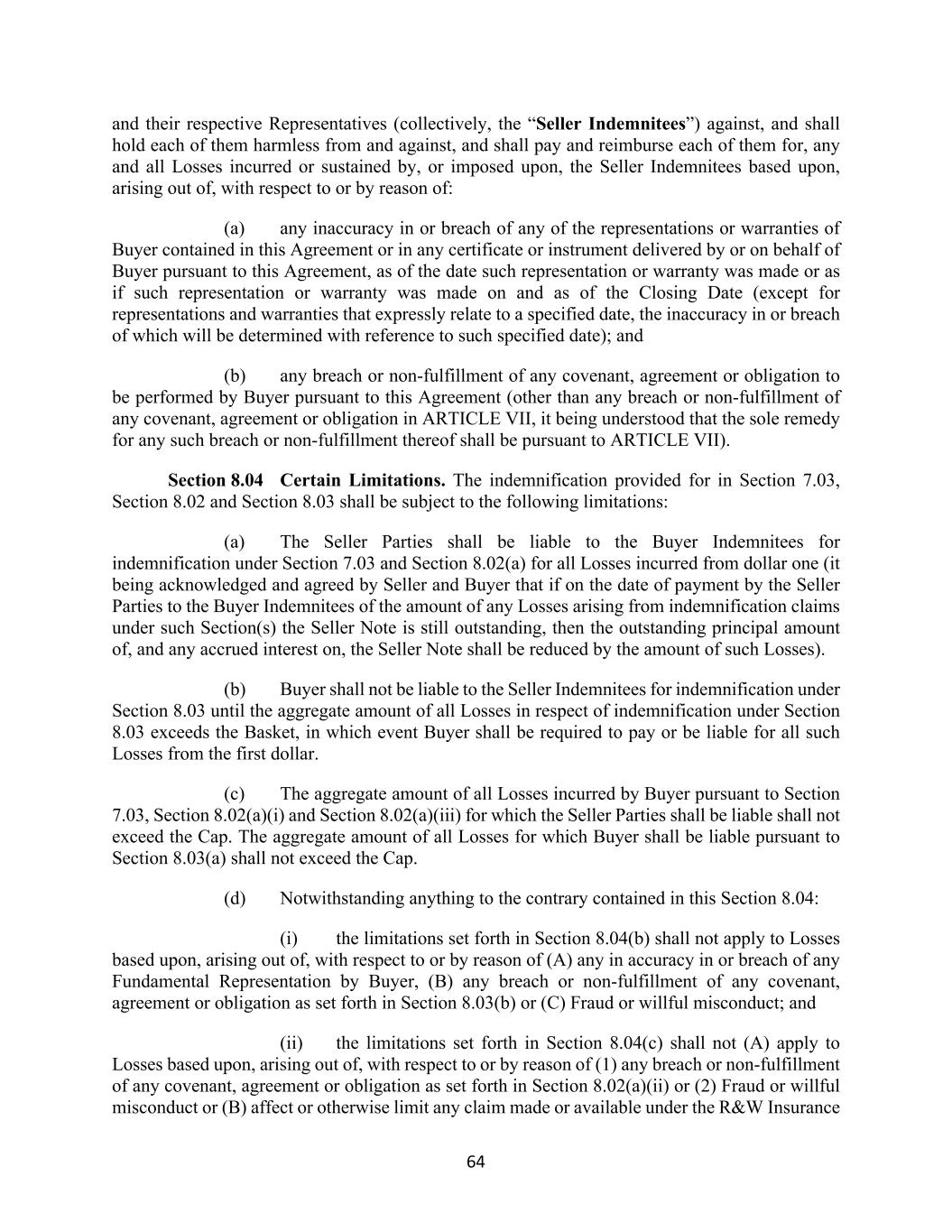 64 and their respective Representatives (collectively, the “Seller Indemnitees”) against, and shall hold each of them harmless from and against, and shall pay and reimburse each of them for, any and all Losses incurred or sustained by, or imposed upon, the Seller Indemnitees based upon, arising out of, with respect to or by reason of: (a) any inaccuracy in or breach of any of the representations or warranties of Buyer contained in this Agreement or in any certificate or instrument delivered by or on behalf of Buyer pursuant to this Agreement, as of the date such representation or warranty was made or as if such representation or warranty was made on and as of the Closing Date (except for representations and warranties that expressly relate to a specified date, the inaccuracy in or breach of which will be determined with reference to such specified date); and (b) any breach or non-fulfillment of any covenant, agreement or obligation to be performed by Buyer pursuant to this Agreement (other than any breach or non-fulfillment of any covenant, agreement or obligation in ARTICLE VII, it being understood that the sole remedy for any such breach or non-fulfillment thereof shall be pursuant to ARTICLE VII). Section 8.04 Certain Limitations. The indemnification provided for in Section 7.03, Section 8.02 and Section 8.03 shall be subject to the following limitations: (a) The Seller Parties shall be liable to the Buyer Indemnitees for indemnification under Section 7.03 and Section 8.02(a) for all Losses incurred from dollar one (it being acknowledged and agreed by Seller and Buyer that if on the date of payment by the Seller Parties to the Buyer Indemnitees of the amount of any Losses arising from indemnification claims under such Section(s) the Seller Note is still outstanding, then the outstanding principal amount of, and any accrued interest on, the Seller Note shall be reduced by the amount of such Losses). (b) Buyer shall not be liable to the Seller Indemnitees for indemnification under Section 8.03 until the aggregate amount of all Losses in respect of indemnification under Section 8.03 exceeds the Basket, in which event Buyer shall be required to pay or be liable for all such Losses from the first dollar. (c) The aggregate amount of all Losses incurred by Buyer pursuant to Section 7.03, Section 8.02(a)(i) and Section 8.02(a)(iii) for which the Seller Parties shall be liable shall not exceed the Cap. The aggregate amount of all Losses for which Buyer shall be liable pursuant to Section 8.03(a) shall not exceed the Cap. (d) Notwithstanding anything to the contrary contained in this Section 8.04: (i) the limitations set forth in Section 8.04(b) shall not apply to Losses based upon, arising out of, with respect to or by reason of (A) any in accuracy in or breach of any Fundamental Representation by Buyer, (B) any breach or non-fulfillment of any covenant, agreement or obligation as set forth in Section 8.03(b) or (C) Fraud or willful misconduct; and (ii) the limitations set forth in Section 8.04(c) shall not (A) apply to Losses based upon, arising out of, with respect to or by reason of (1) any breach or non-fulfillment of any covenant, agreement or obligation as set forth in Section 8.02(a)(ii) or (2) Fraud or willful misconduct or (B) affect or otherwise limit any claim made or available under the R&W Insurance
