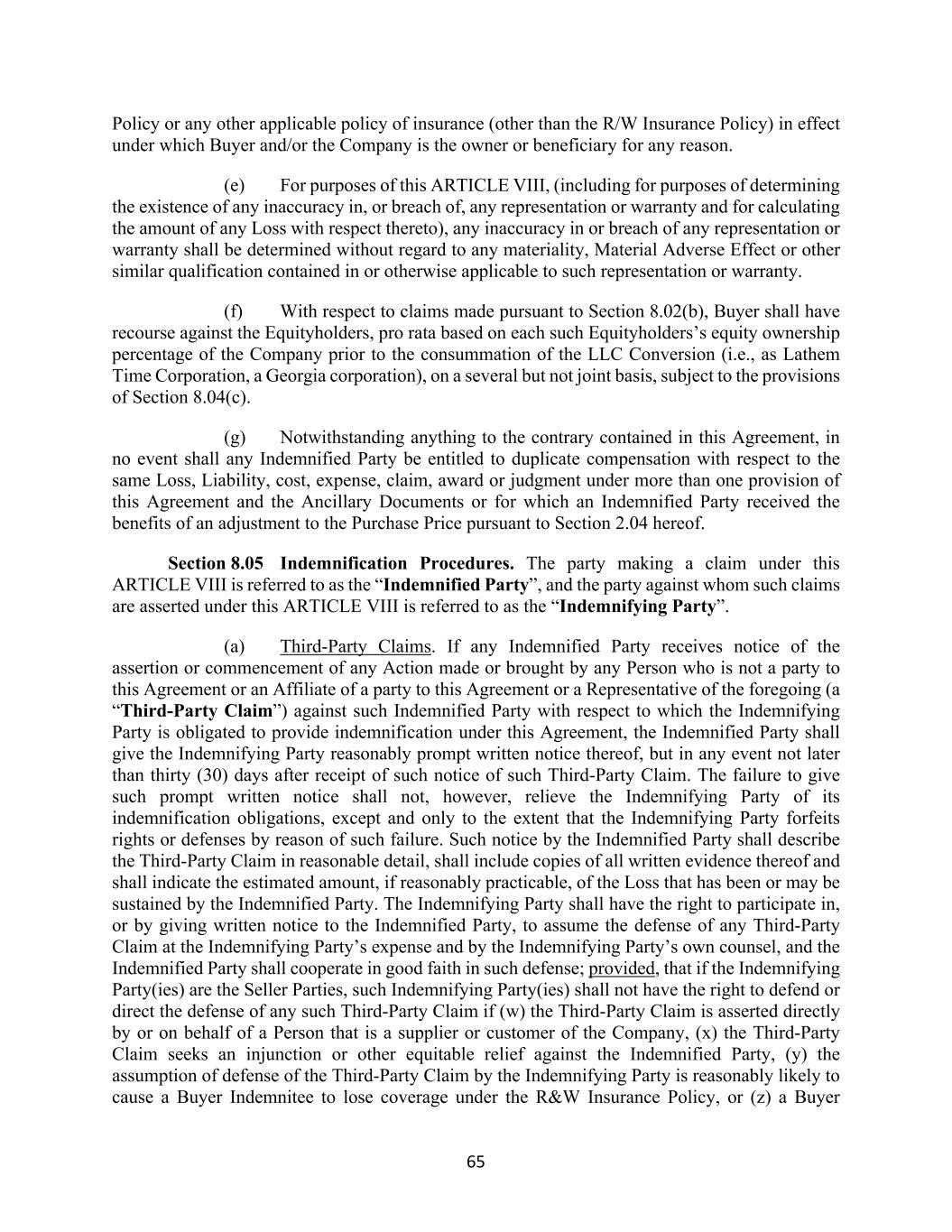 65 Policy or any other applicable policy of insurance (other than the R/W Insurance Policy) in effect under which Buyer and/or the Company is the owner or beneficiary for any reason. (e) For purposes of this ARTICLE VIII, (including for purposes of determining the existence of any inaccuracy in, or breach of, any representation or warranty and for calculating the amount of any Loss with respect thereto), any inaccuracy in or breach of any representation or warranty shall be determined without regard to any materiality, Material Adverse Effect or other similar qualification contained in or otherwise applicable to such representation or warranty. (f) With respect to claims made pursuant to Section 8.02(b), Buyer shall have recourse against the Equityholders, pro rata based on each such Equityholders’s equity ownership percentage of the Company prior to the consummation of the LLC Conversion (i.e., as Lathem Time Corporation, a Georgia corporation), on a several but not joint basis, subject to the provisions of Section 8.04(c). (g) Notwithstanding anything to the contrary contained in this Agreement, in no event shall any Indemnified Party be entitled to duplicate compensation with respect to the same Loss, Liability, cost, expense, claim, award or judgment under more than one provision of this Agreement and the Ancillary Documents or for which an Indemnified Party received the benefits of an adjustment to the Purchase Price pursuant to Section 2.04 hereof. Section 8.05 Indemnification Procedures. The party making a claim under this ARTICLE VIII is referred to as the “Indemnified Party”, and the party against whom such claims are asserted under this ARTICLE VIII is referred to as the “Indemnifying Party”. (a) Third-Party Claims. If any Indemnified Party receives notice of the assertion or commencement of any Action made or brought by any Person who is not a party to this Agreement or an Affiliate of a party to this Agreement or a Representative of the foregoing (a “Third-Party Claim”) against such Indemnified Party with respect to which the Indemnifying Party is obligated to provide indemnification under this Agreement, the Indemnified Party shall give the Indemnifying Party reasonably prompt written notice thereof, but in any event not later than thirty (30) days after receipt of such notice of such Third-Party Claim. The failure to give such prompt written notice shall not, however, relieve the Indemnifying Party of its indemnification obligations, except and only to the extent that the Indemnifying Party forfeits rights or defenses by reason of such failure. Such notice by the Indemnified Party shall describe the Third-Party Claim in reasonable detail, shall include copies of all written evidence thereof and shall indicate the estimated amount, if reasonably practicable, of the Loss that has been or may be sustained by the Indemnified Party. The Indemnifying Party shall have the right to participate in, or by giving written notice to the Indemnified Party, to assume the defense of any Third-Party Claim at the Indemnifying Party’s expense and by the Indemnifying Party’s own counsel, and the Indemnified Party shall cooperate in good faith in such defense; provided, that if the Indemnifying Party(ies) are the Seller Parties, such Indemnifying Party(ies) shall not have the right to defend or direct the defense of any such Third-Party Claim if (w) the Third-Party Claim is asserted directly by or on behalf of a Person that is a supplier or customer of the Company, (x) the Third-Party Claim seeks an injunction or other equitable relief against the Indemnified Party, (y) the assumption of defense of the Third-Party Claim by the Indemnifying Party is reasonably likely to cause a Buyer Indemnitee to lose coverage under the R&W Insurance Policy, or (z) a Buyer