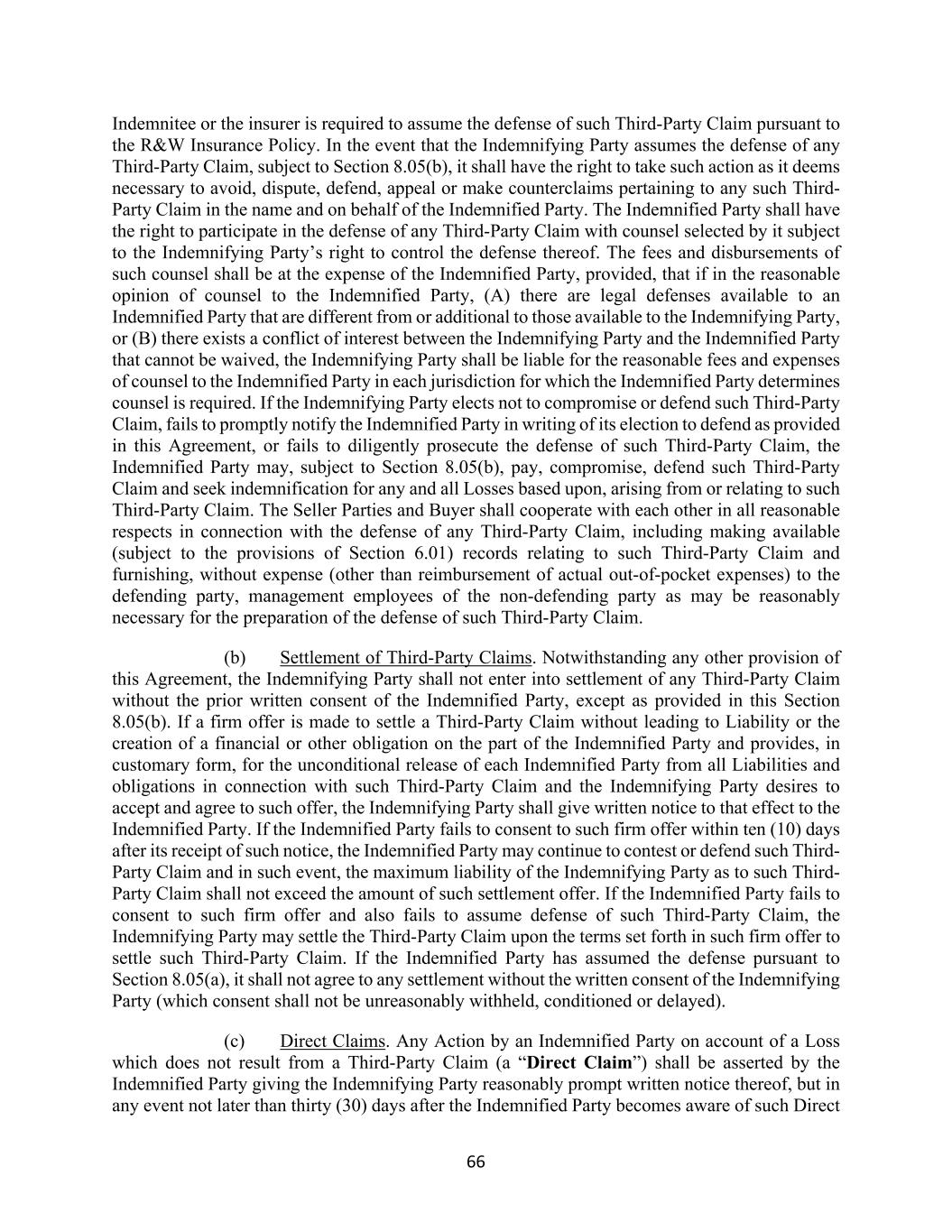66 Indemnitee or the insurer is required to assume the defense of such Third-Party Claim pursuant to the R&W Insurance Policy. In the event that the Indemnifying Party assumes the defense of any Third-Party Claim, subject to Section 8.05(b), it shall have the right to take such action as it deems necessary to avoid, dispute, defend, appeal or make counterclaims pertaining to any such Third- Party Claim in the name and on behalf of the Indemnified Party. The Indemnified Party shall have the right to participate in the defense of any Third-Party Claim with counsel selected by it subject to the Indemnifying Party’s right to control the defense thereof. The fees and disbursements of such counsel shall be at the expense of the Indemnified Party, provided, that if in the reasonable opinion of counsel to the Indemnified Party, (A) there are legal defenses available to an Indemnified Party that are different from or additional to those available to the Indemnifying Party, or (B) there exists a conflict of interest between the Indemnifying Party and the Indemnified Party that cannot be waived, the Indemnifying Party shall be liable for the reasonable fees and expenses of counsel to the Indemnified Party in each jurisdiction for which the Indemnified Party determines counsel is required. If the Indemnifying Party elects not to compromise or defend such Third-Party Claim, fails to promptly notify the Indemnified Party in writing of its election to defend as provided in this Agreement, or fails to diligently prosecute the defense of such Third-Party Claim, the Indemnified Party may, subject to Section 8.05(b), pay, compromise, defend such Third-Party Claim and seek indemnification for any and all Losses based upon, arising from or relating to such Third-Party Claim. The Seller Parties and Buyer shall cooperate with each other in all reasonable respects in connection with the defense of any Third-Party Claim, including making available (subject to the provisions of Section 6.01) records relating to such Third-Party Claim and furnishing, without expense (other than reimbursement of actual out-of-pocket expenses) to the defending party, management employees of the non-defending party as may be reasonably necessary for the preparation of the defense of such Third-Party Claim. (b) Settlement of Third-Party Claims. Notwithstanding any other provision of this Agreement, the Indemnifying Party shall not enter into settlement of any Third-Party Claim without the prior written consent of the Indemnified Party, except as provided in this Section 8.05(b). If a firm offer is made to settle a Third-Party Claim without leading to Liability or the creation of a financial or other obligation on the part of the Indemnified Party and provides, in customary form, for the unconditional release of each Indemnified Party from all Liabilities and obligations in connection with such Third-Party Claim and the Indemnifying Party desires to accept and agree to such offer, the Indemnifying Party shall give written notice to that effect to the Indemnified Party. If the Indemnified Party fails to consent to such firm offer within ten (10) days after its receipt of such notice, the Indemnified Party may continue to contest or defend such Third- Party Claim and in such event, the maximum liability of the Indemnifying Party as to such Third- Party Claim shall not exceed the amount of such settlement offer. If the Indemnified Party fails to consent to such firm offer and also fails to assume defense of such Third-Party Claim, the Indemnifying Party may settle the Third-Party Claim upon the terms set forth in such firm offer to settle such Third-Party Claim. If the Indemnified Party has assumed the defense pursuant to Section 8.05(a), it shall not agree to any settlement without the written consent of the Indemnifying Party (which consent shall not be unreasonably withheld, conditioned or delayed). (c) Direct Claims. Any Action by an Indemnified Party on account of a Loss which does not result from a Third-Party Claim (a “Direct Claim”) shall be asserted by the Indemnified Party giving the Indemnifying Party reasonably prompt written notice thereof, but in any event not later than thirty (30) days after the Indemnified Party becomes aware of such Direct