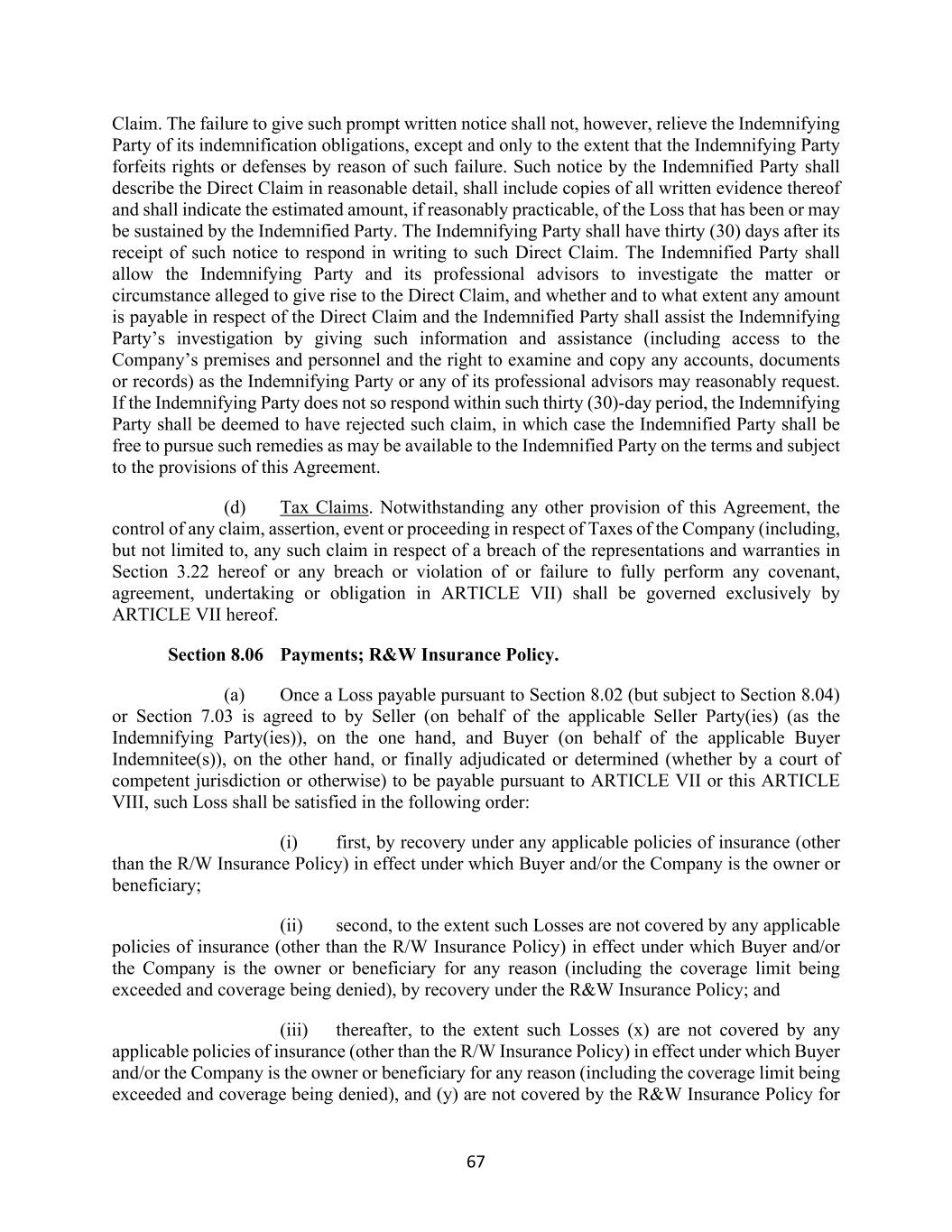 67 Claim. The failure to give such prompt written notice shall not, however, relieve the Indemnifying Party of its indemnification obligations, except and only to the extent that the Indemnifying Party forfeits rights or defenses by reason of such failure. Such notice by the Indemnified Party shall describe the Direct Claim in reasonable detail, shall include copies of all written evidence thereof and shall indicate the estimated amount, if reasonably practicable, of the Loss that has been or may be sustained by the Indemnified Party. The Indemnifying Party shall have thirty (30) days after its receipt of such notice to respond in writing to such Direct Claim. The Indemnified Party shall allow the Indemnifying Party and its professional advisors to investigate the matter or circumstance alleged to give rise to the Direct Claim, and whether and to what extent any amount is payable in respect of the Direct Claim and the Indemnified Party shall assist the Indemnifying Party’s investigation by giving such information and assistance (including access to the Company’s premises and personnel and the right to examine and copy any accounts, documents or records) as the Indemnifying Party or any of its professional advisors may reasonably request. If the Indemnifying Party does not so respond within such thirty (30)-day period, the Indemnifying Party shall be deemed to have rejected such claim, in which case the Indemnified Party shall be free to pursue such remedies as may be available to the Indemnified Party on the terms and subject to the provisions of this Agreement. (d) Tax Claims. Notwithstanding any other provision of this Agreement, the control of any claim, assertion, event or proceeding in respect of Taxes of the Company (including, but not limited to, any such claim in respect of a breach of the representations and warranties in Section 3.22 hereof or any breach or violation of or failure to fully perform any covenant, agreement, undertaking or obligation in ARTICLE VII) shall be governed exclusively by ARTICLE VII hereof. Section 8.06 Payments; R&W Insurance Policy. (a) Once a Loss payable pursuant to Section 8.02 (but subject to Section 8.04) or Section 7.03 is agreed to by Seller (on behalf of the applicable Seller Party(ies) (as the Indemnifying Party(ies)), on the one hand, and Buyer (on behalf of the applicable Buyer Indemnitee(s)), on the other hand, or finally adjudicated or determined (whether by a court of competent jurisdiction or otherwise) to be payable pursuant to ARTICLE VII or this ARTICLE VIII, such Loss shall be satisfied in the following order: (i) first, by recovery under any applicable policies of insurance (other than the R/W Insurance Policy) in effect under which Buyer and/or the Company is the owner or beneficiary; (ii) second, to the extent such Losses are not covered by any applicable policies of insurance (other than the R/W Insurance Policy) in effect under which Buyer and/or the Company is the owner or beneficiary for any reason (including the coverage limit being exceeded and coverage being denied), by recovery under the R&W Insurance Policy; and (iii) thereafter, to the extent such Losses (x) are not covered by any applicable policies of insurance (other than the R/W Insurance Policy) in effect under which Buyer and/or the Company is the owner or beneficiary for any reason (including the coverage limit being exceeded and coverage being denied), and (y) are not covered by the R&W Insurance Policy for