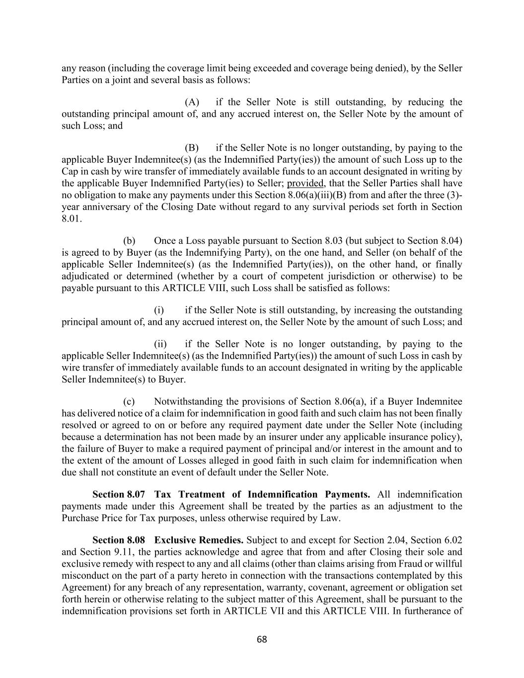 68 any reason (including the coverage limit being exceeded and coverage being denied), by the Seller Parties on a joint and several basis as follows: (A) if the Seller Note is still outstanding, by reducing the outstanding principal amount of, and any accrued interest on, the Seller Note by the amount of such Loss; and (B) if the Seller Note is no longer outstanding, by paying to the applicable Buyer Indemnitee(s) (as the Indemnified Party(ies)) the amount of such Loss up to the Cap in cash by wire transfer of immediately available funds to an account designated in writing by the applicable Buyer Indemnified Party(ies) to Seller; provided, that the Seller Parties shall have no obligation to make any payments under this Section 8.06(a)(iii)(B) from and after the three (3)- year anniversary of the Closing Date without regard to any survival periods set forth in Section 8.01. (b) Once a Loss payable pursuant to Section 8.03 (but subject to Section 8.04) is agreed to by Buyer (as the Indemnifying Party), on the one hand, and Seller (on behalf of the applicable Seller Indemnitee(s) (as the Indemnified Party(ies)), on the other hand, or finally adjudicated or determined (whether by a court of competent jurisdiction or otherwise) to be payable pursuant to this ARTICLE VIII, such Loss shall be satisfied as follows: (i) if the Seller Note is still outstanding, by increasing the outstanding principal amount of, and any accrued interest on, the Seller Note by the amount of such Loss; and (ii) if the Seller Note is no longer outstanding, by paying to the applicable Seller Indemnitee(s) (as the Indemnified Party(ies)) the amount of such Loss in cash by wire transfer of immediately available funds to an account designated in writing by the applicable Seller Indemnitee(s) to Buyer. (c) Notwithstanding the provisions of Section 8.06(a), if a Buyer Indemnitee has delivered notice of a claim for indemnification in good faith and such claim has not been finally resolved or agreed to on or before any required payment date under the Seller Note (including because a determination has not been made by an insurer under any applicable insurance policy), the failure of Buyer to make a required payment of principal and/or interest in the amount and to the extent of the amount of Losses alleged in good faith in such claim for indemnification when due shall not constitute an event of default under the Seller Note. Section 8.07 Tax Treatment of Indemnification Payments. All indemnification payments made under this Agreement shall be treated by the parties as an adjustment to the Purchase Price for Tax purposes, unless otherwise required by Law. Section 8.08 Exclusive Remedies. Subject to and except for Section 2.04, Section 6.02 and Section 9.11, the parties acknowledge and agree that from and after Closing their sole and exclusive remedy with respect to any and all claims (other than claims arising from Fraud or willful misconduct on the part of a party hereto in connection with the transactions contemplated by this Agreement) for any breach of any representation, warranty, covenant, agreement or obligation set forth herein or otherwise relating to the subject matter of this Agreement, shall be pursuant to the indemnification provisions set forth in ARTICLE VII and this ARTICLE VIII. In furtherance of